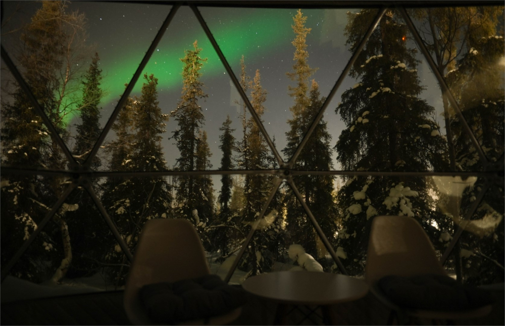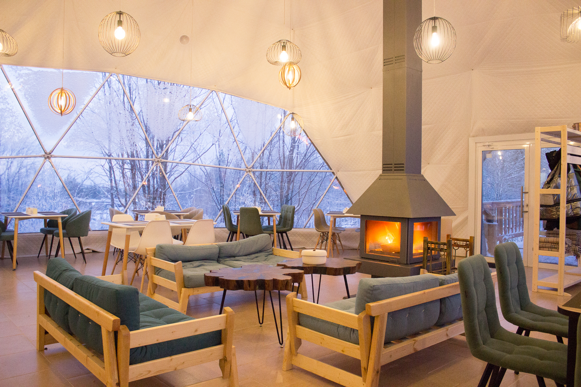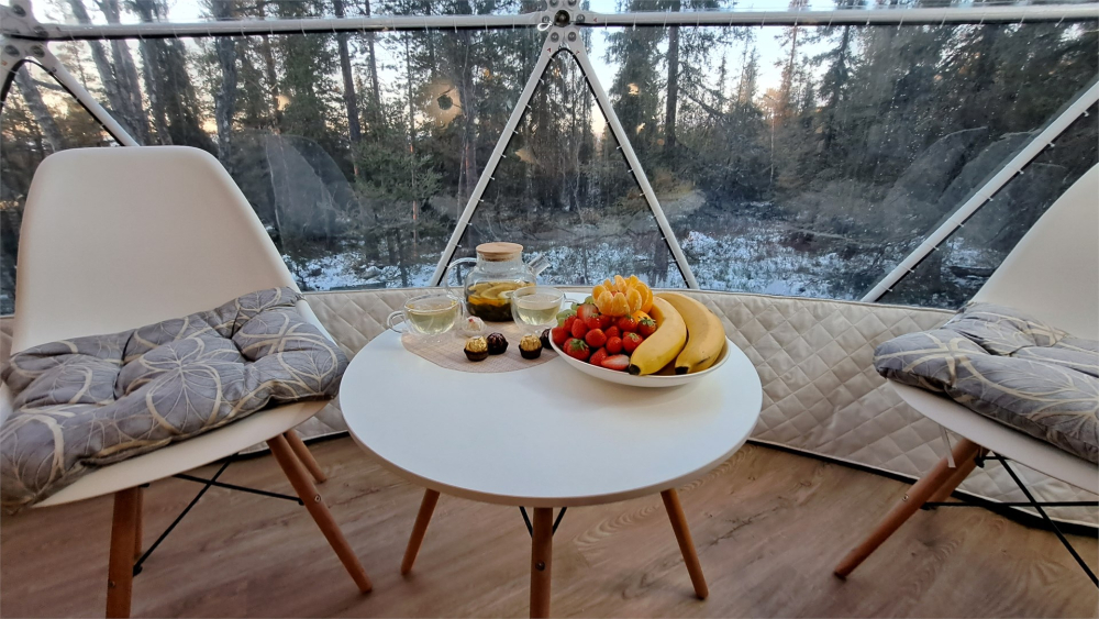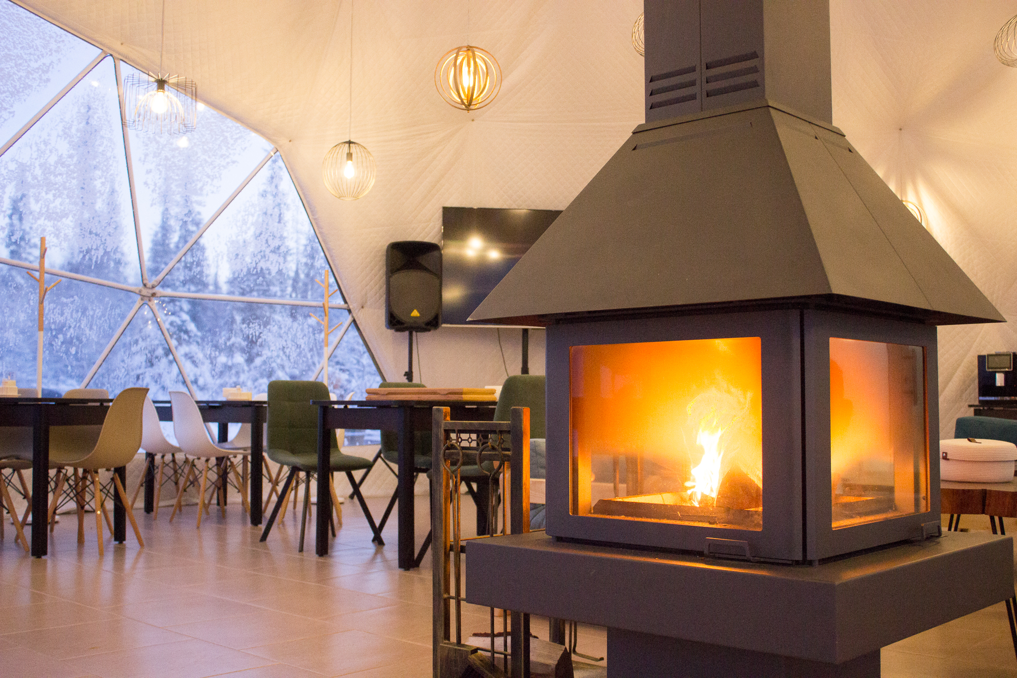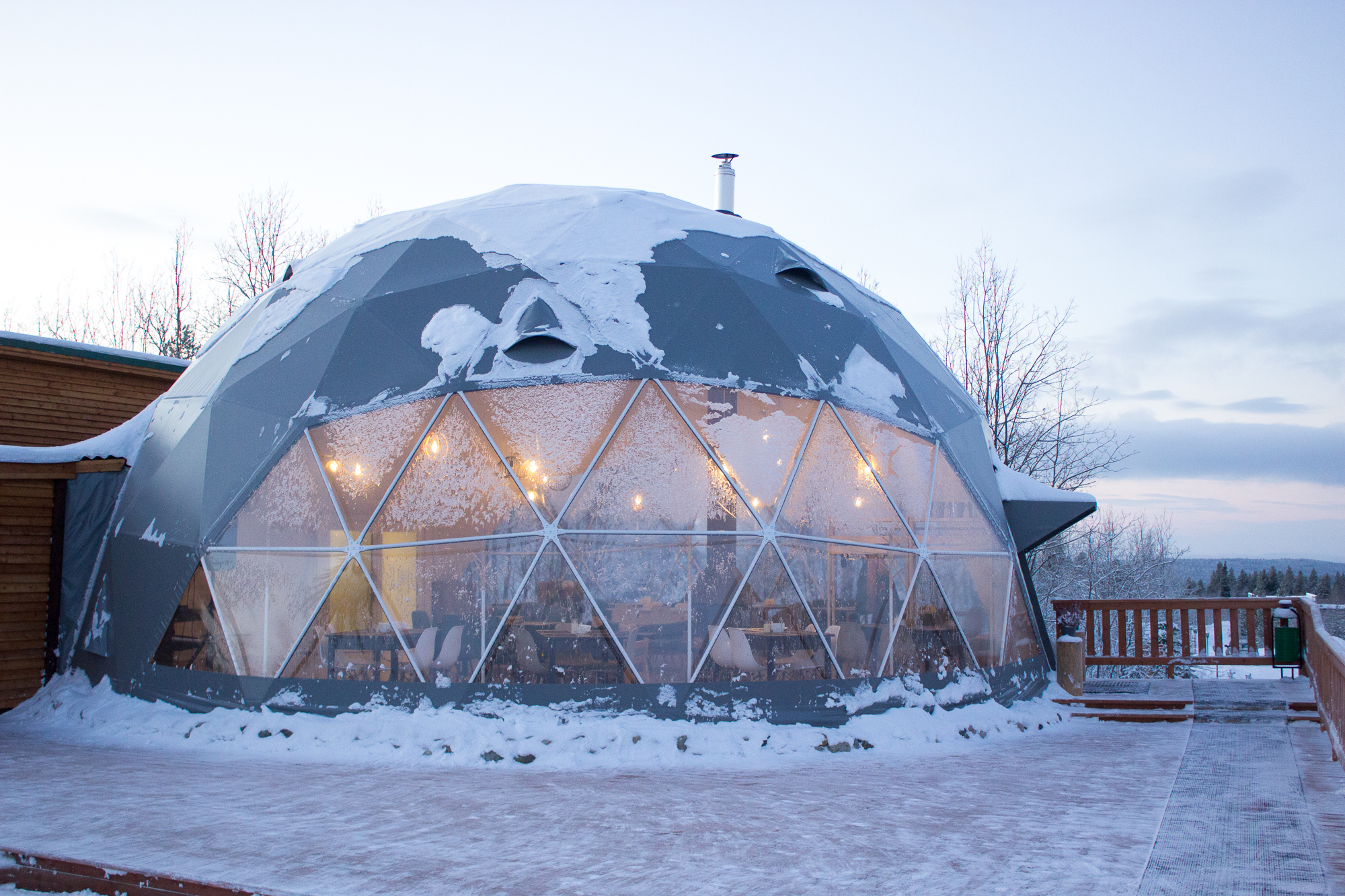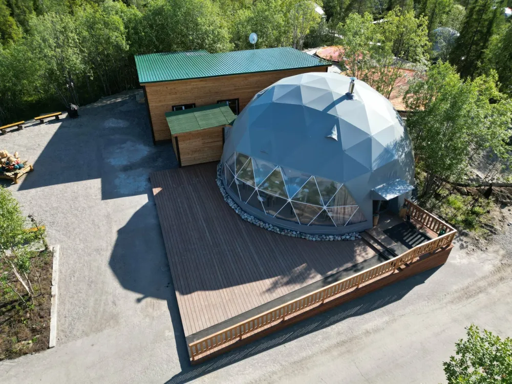 Купольный ресторан вместимостью 80 гостей, где можно провести вечер под уютное потрескивание дров и полюбоваться северной природой через панорамные окна.