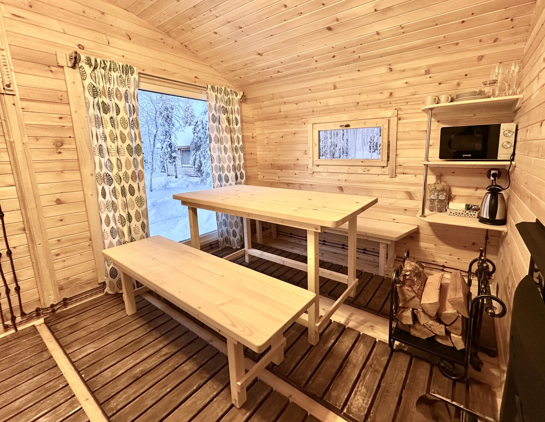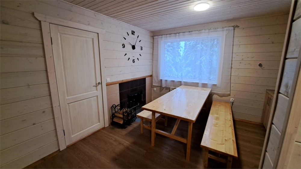 стол, лавки, печь, чайник, микроволновка, набор посуды, столовые приборы