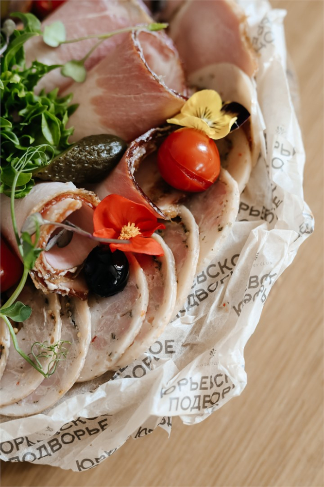 На территории работает ресторан, использующий продукцию собственного производства. Гости могут попробовать изделия из нашего колбасного цеха, сыроварни и фермерские продукты.
