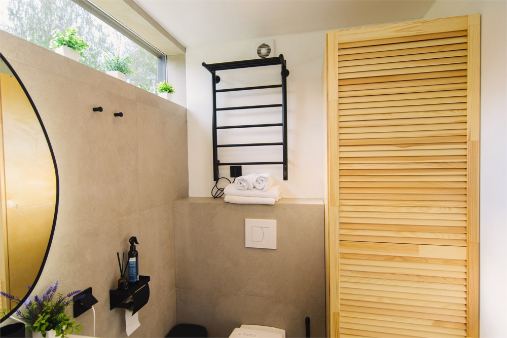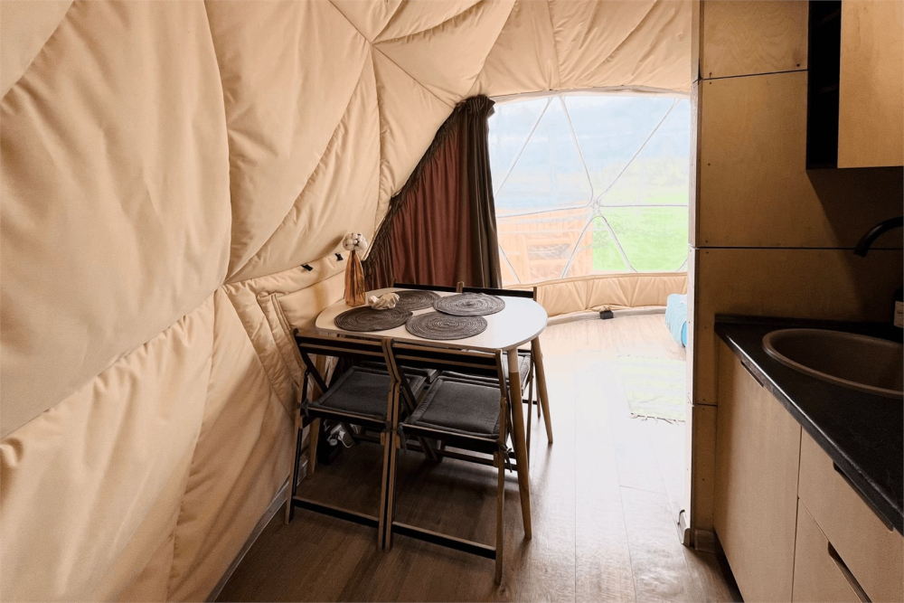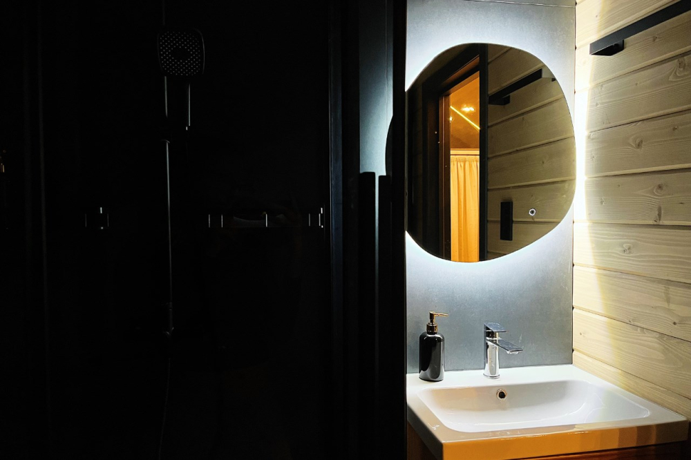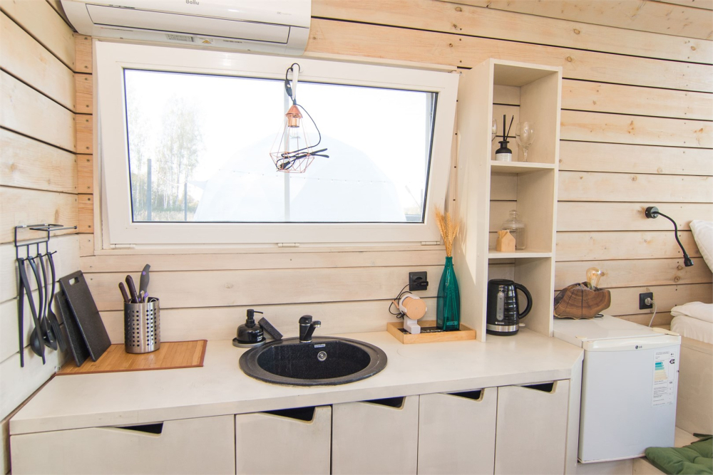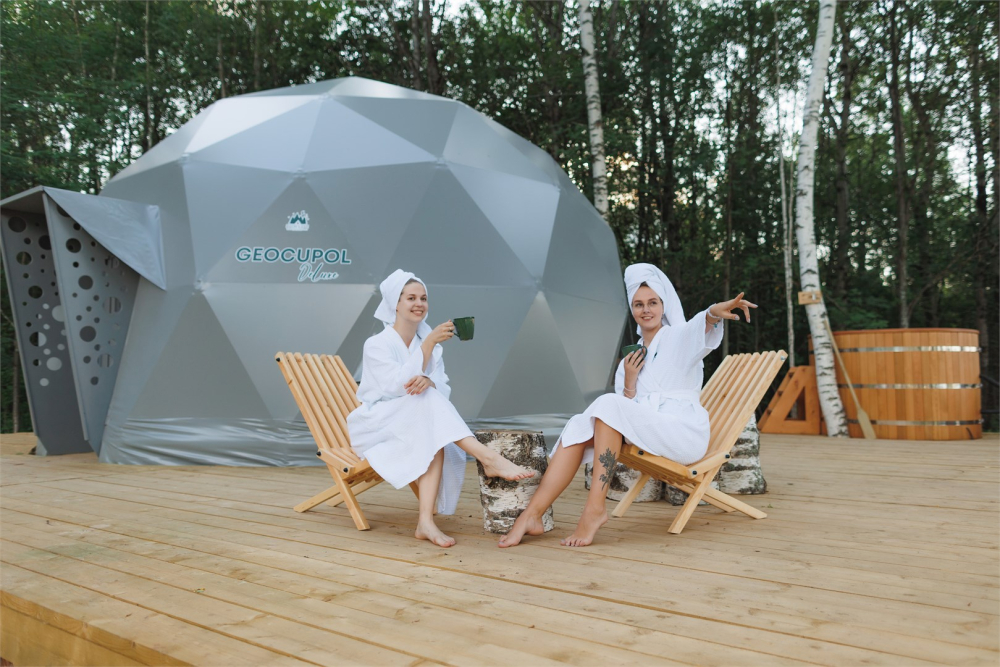 Футуристичная форма купола делает отдых особенно атмосферным. Тёплая купель рядом с домом позволяет расслабиться под открытым небом, ощущая свежесть вечернего воздуха и слыша шум реки неподалёку.