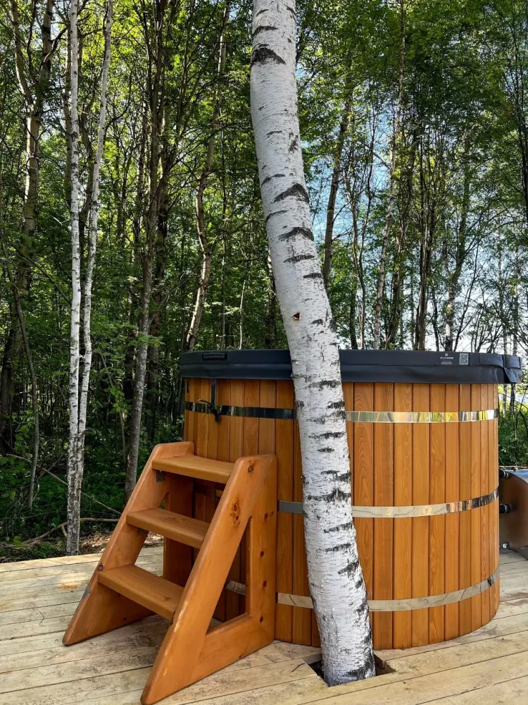Горячий чан есть около домиков Hygge Lodge с купелью, Geocupol Smart Deluxe с купелью, Geocupol Deluxe с купелью, Geocupol с купелью.