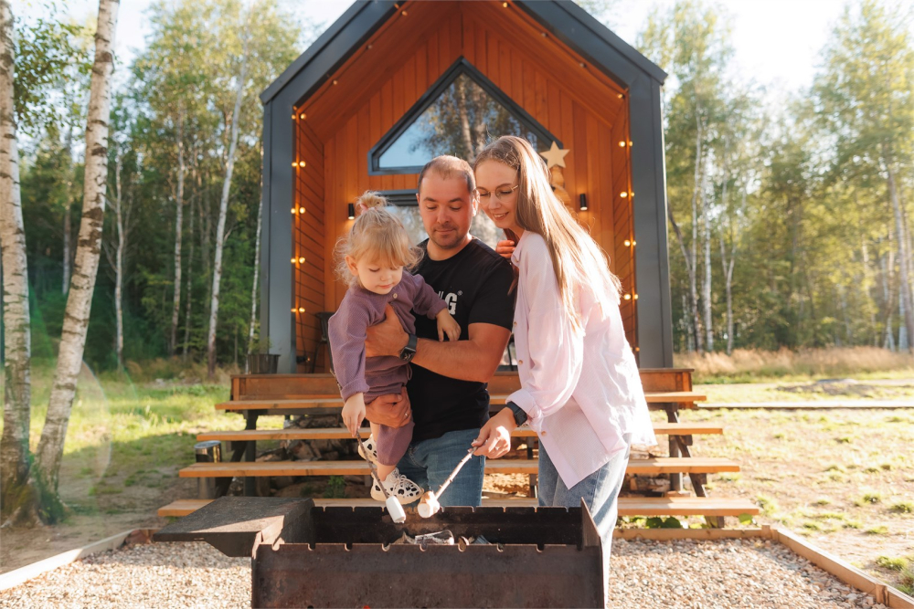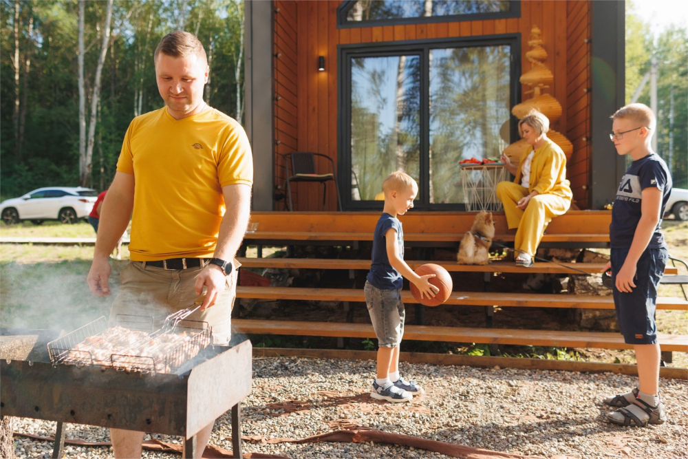 У каждого дома есть собственная мангальная зона — идеальное место для ужинов на свежем воздухе, когда вокруг пахнет лесом, а над головой постепенно загораются первые звёзды.