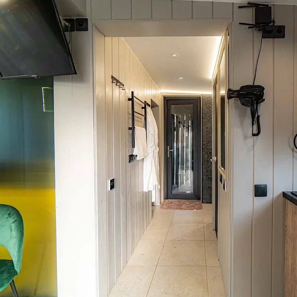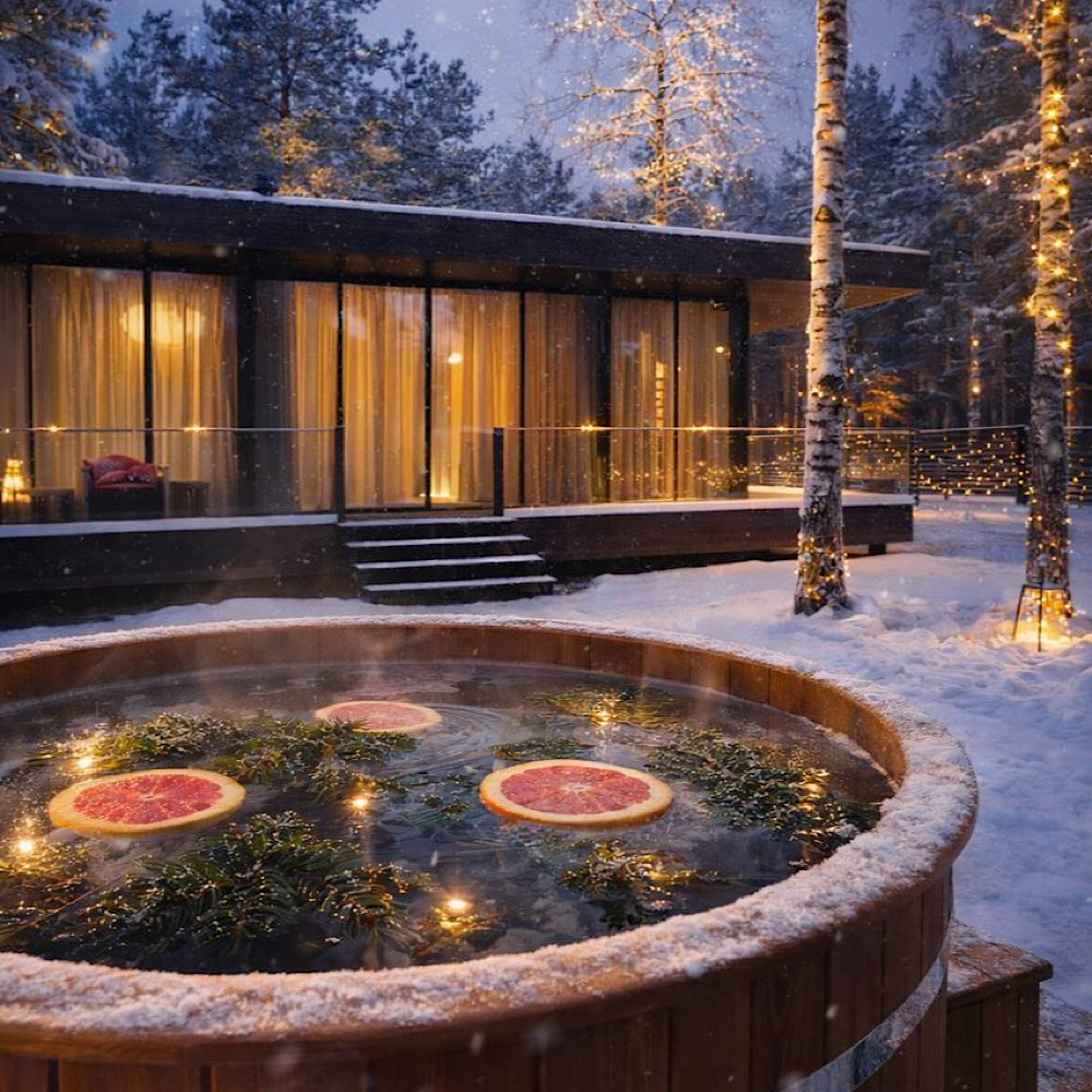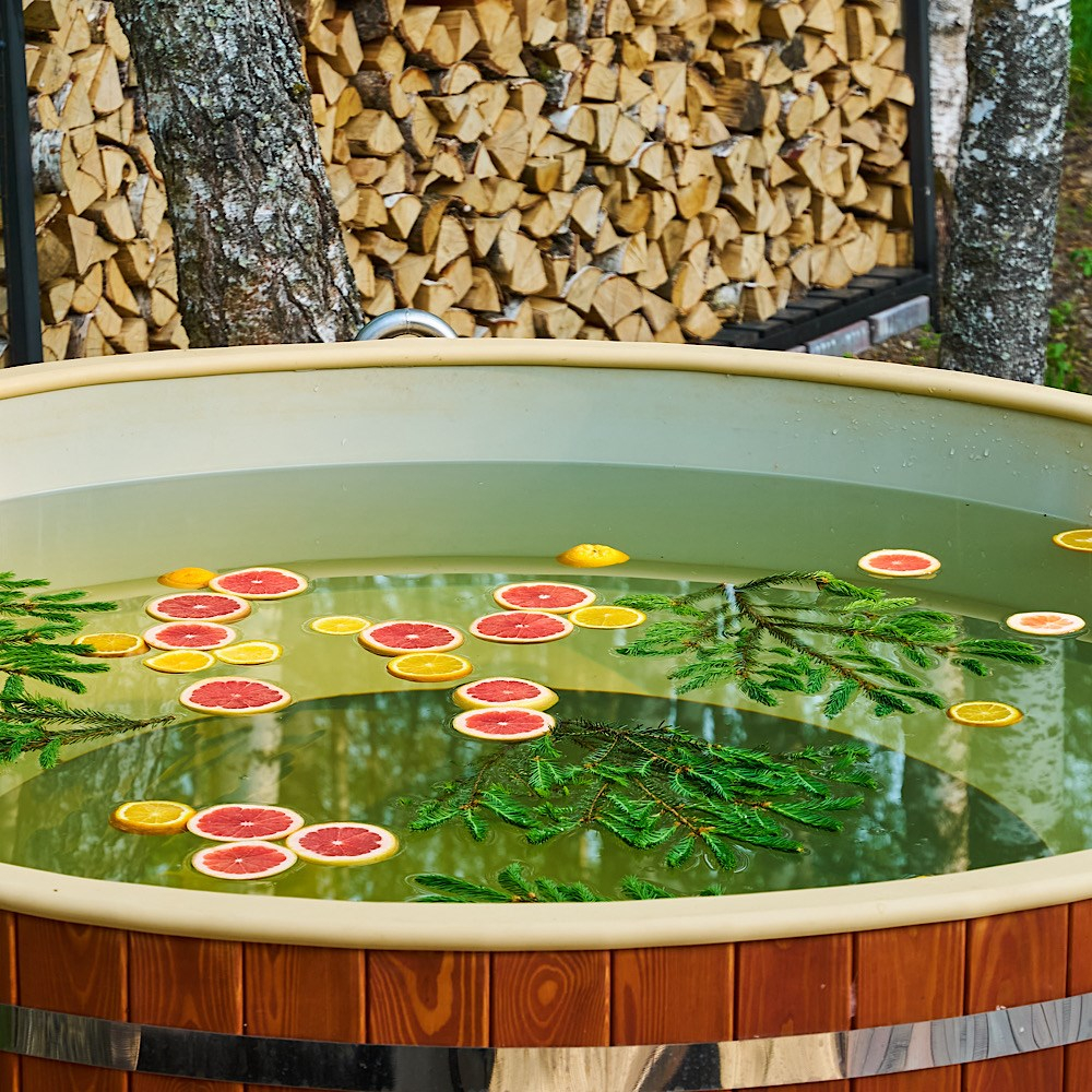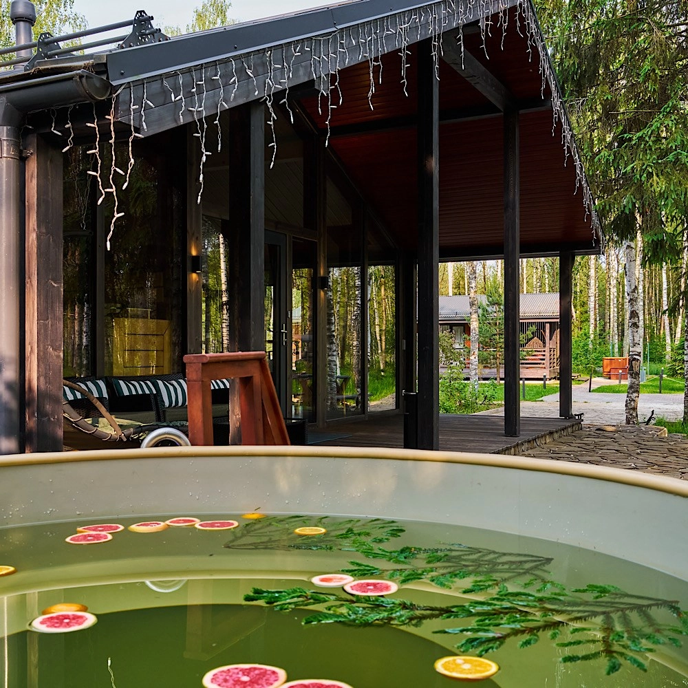 Горячий чан есть около домиков Glass Box 85, Lato-80 Sauna, Lato-65 Sauna.