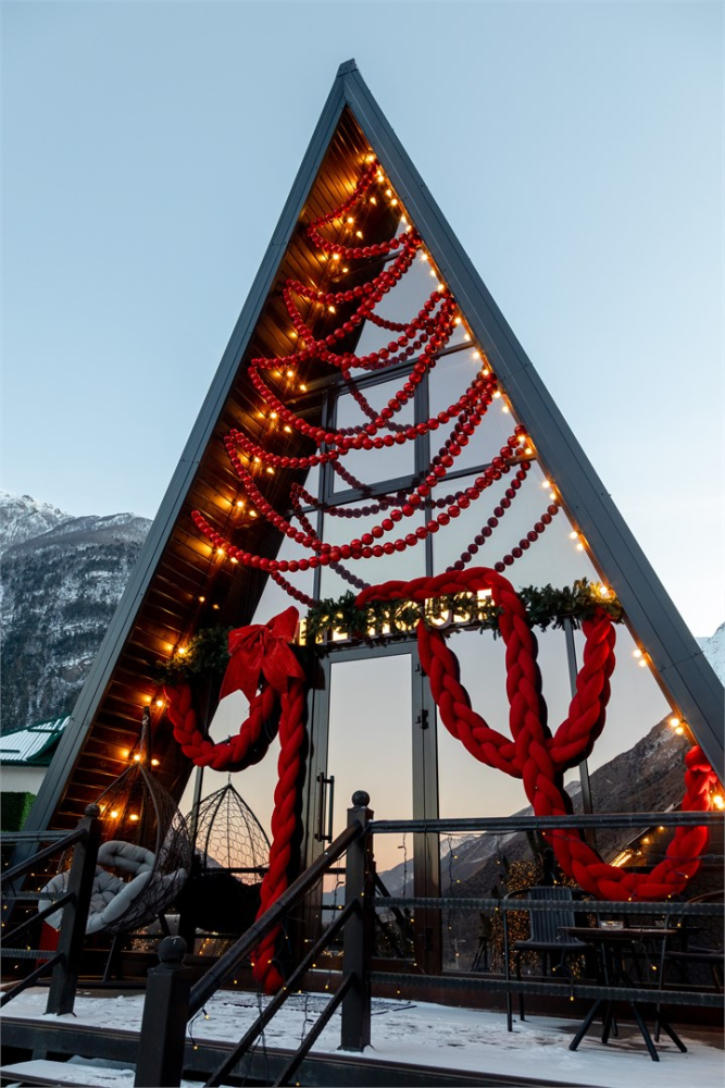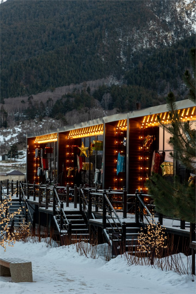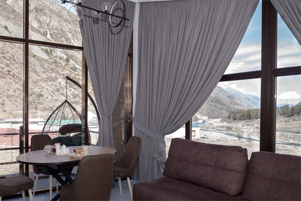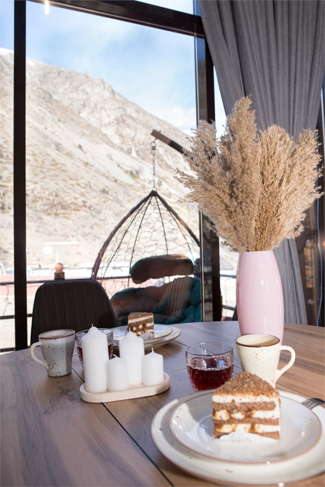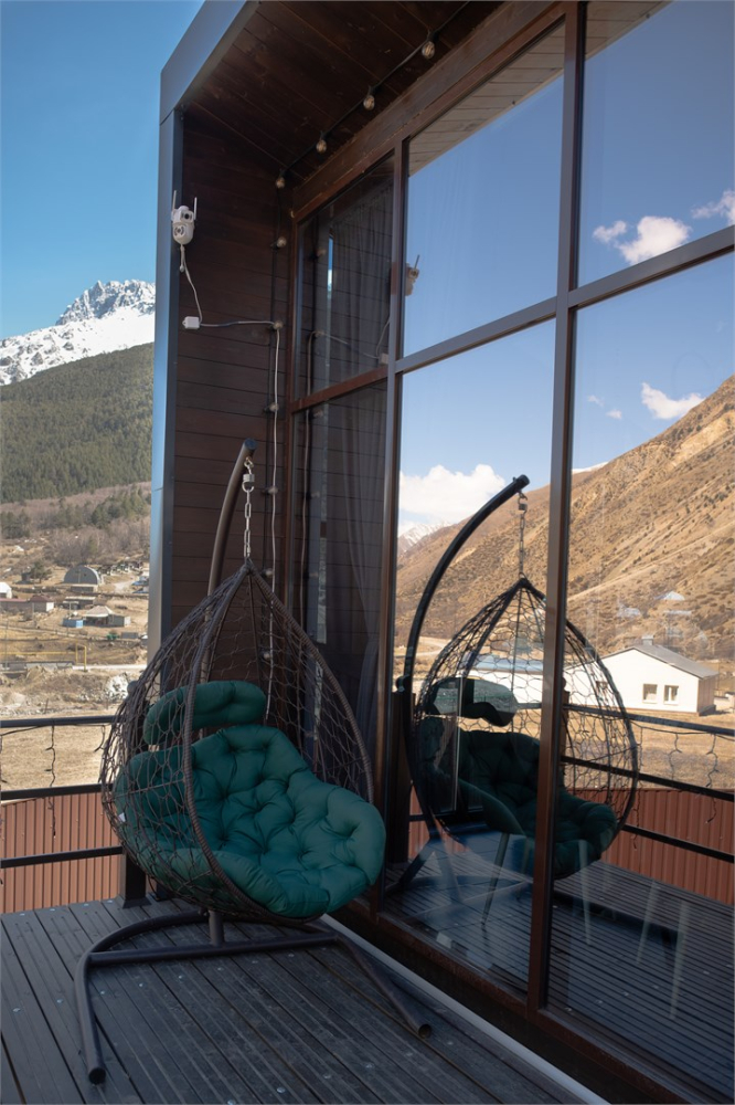 Панорамные окна и террасы открывают потрясающие виды на горные вершины Приэльбрусья.