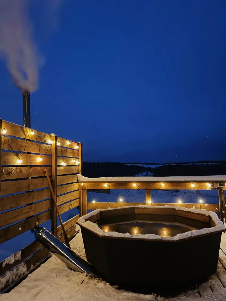 Представьте: звёздное небо, тишина и тёплый чан прямо у вашего домика. Идеальное место для романтического вечера или неспешных разговоров. Одна топка поддерживает комфортную температуру 4−5 часов.