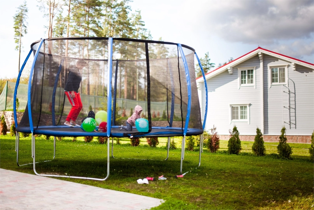 детская кроватка и игровой батут ждут маленьких гостей возле каждого коттеджа.