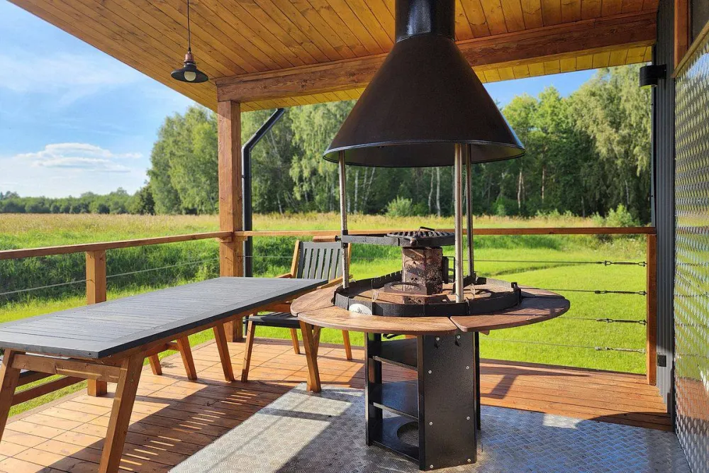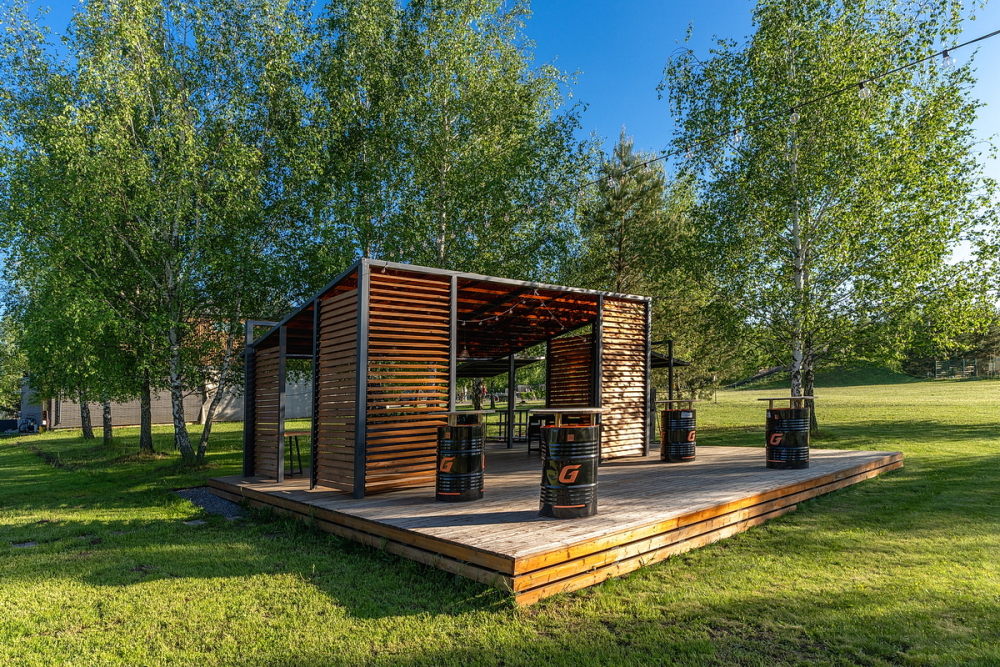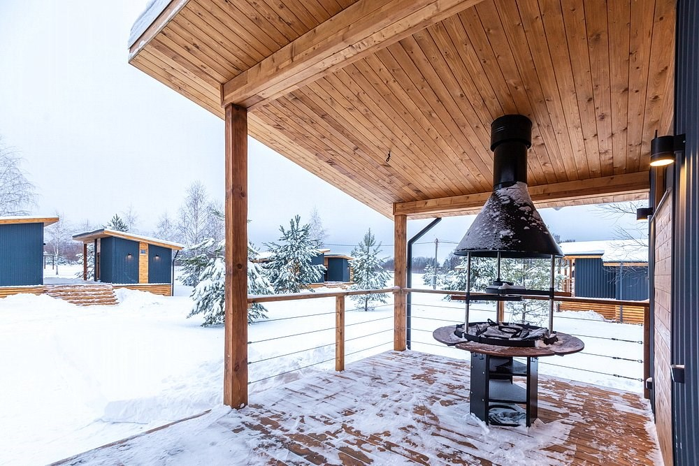Барбекю зона есть около домиков Коттедж-студия, Коттедж-студия с доп комнатой, Коттедж с 3 спальнями с купелью, Коттедж с 3 спальнями.