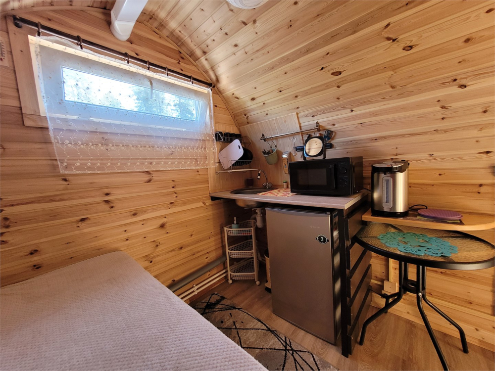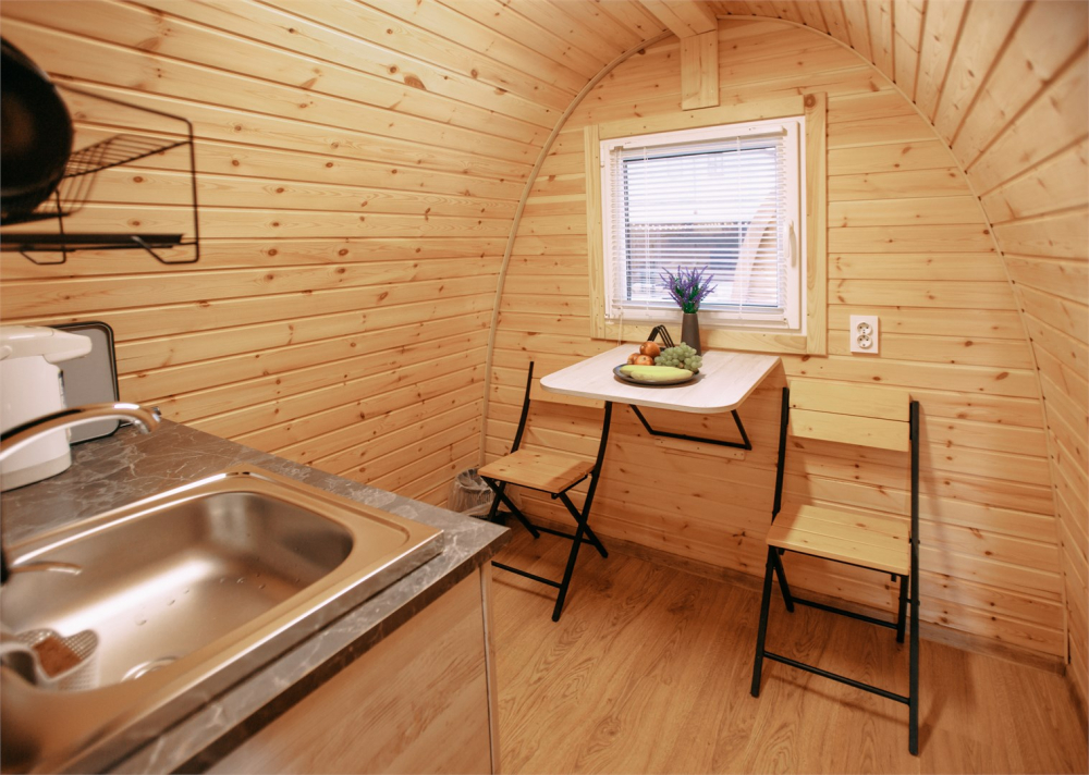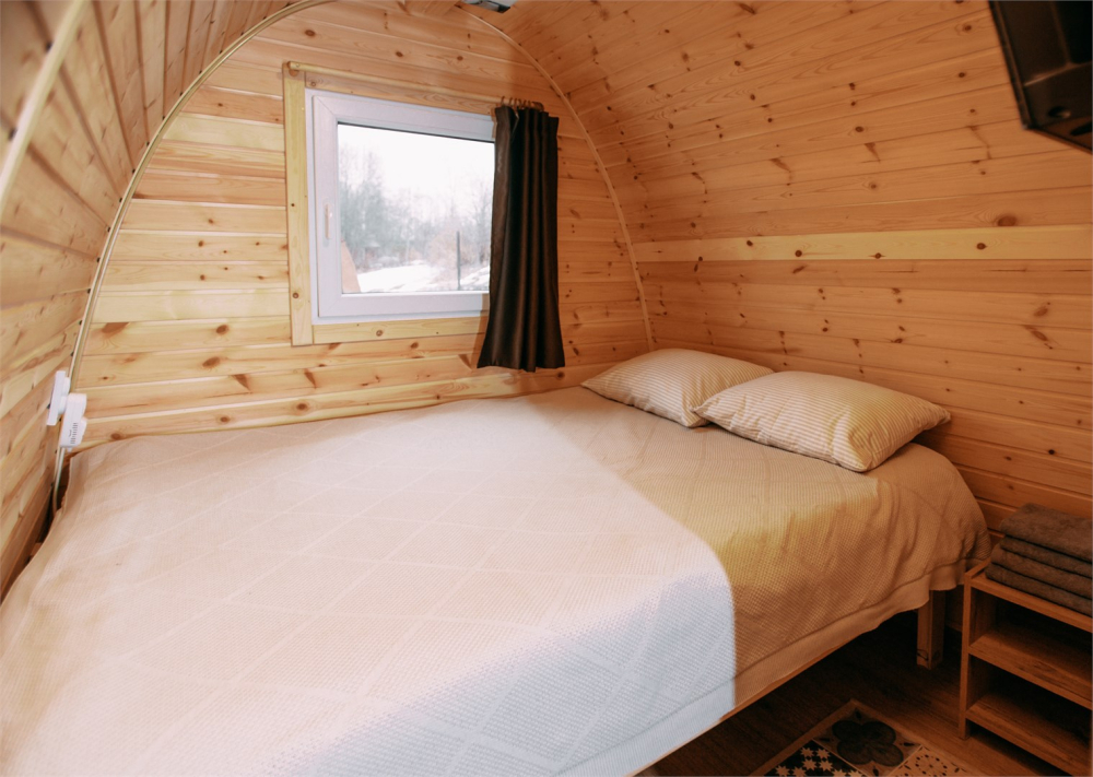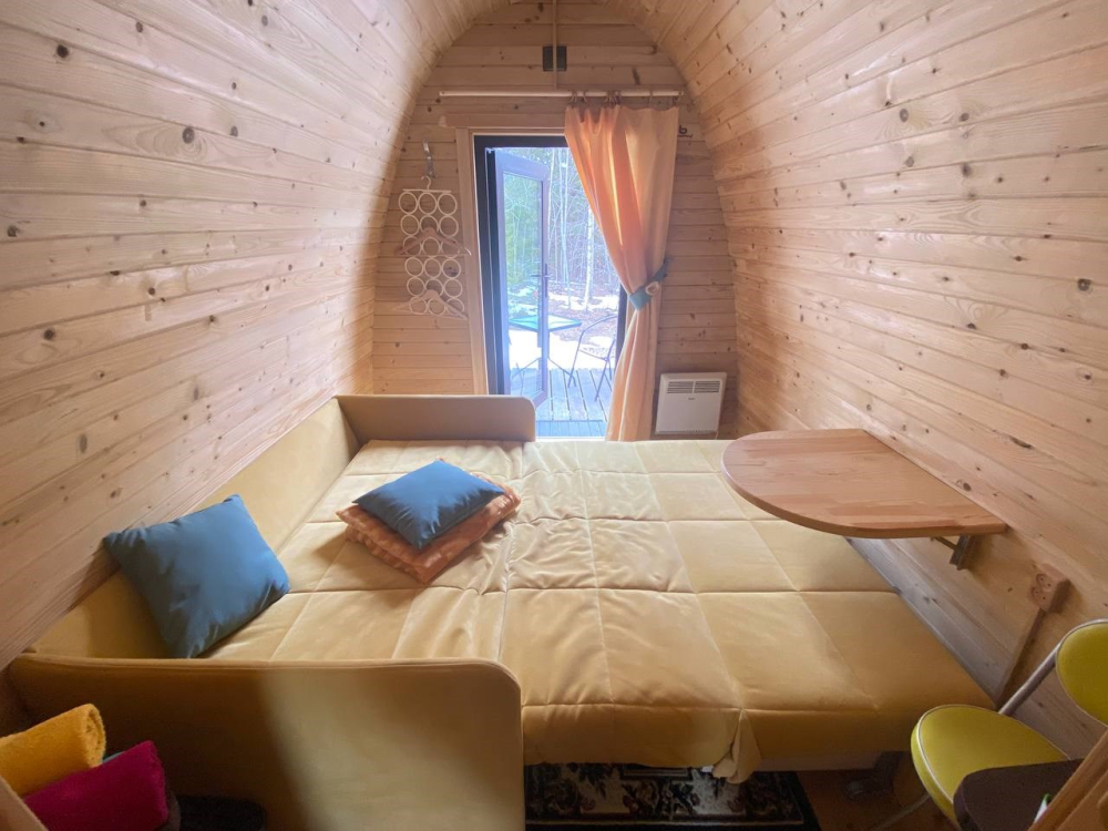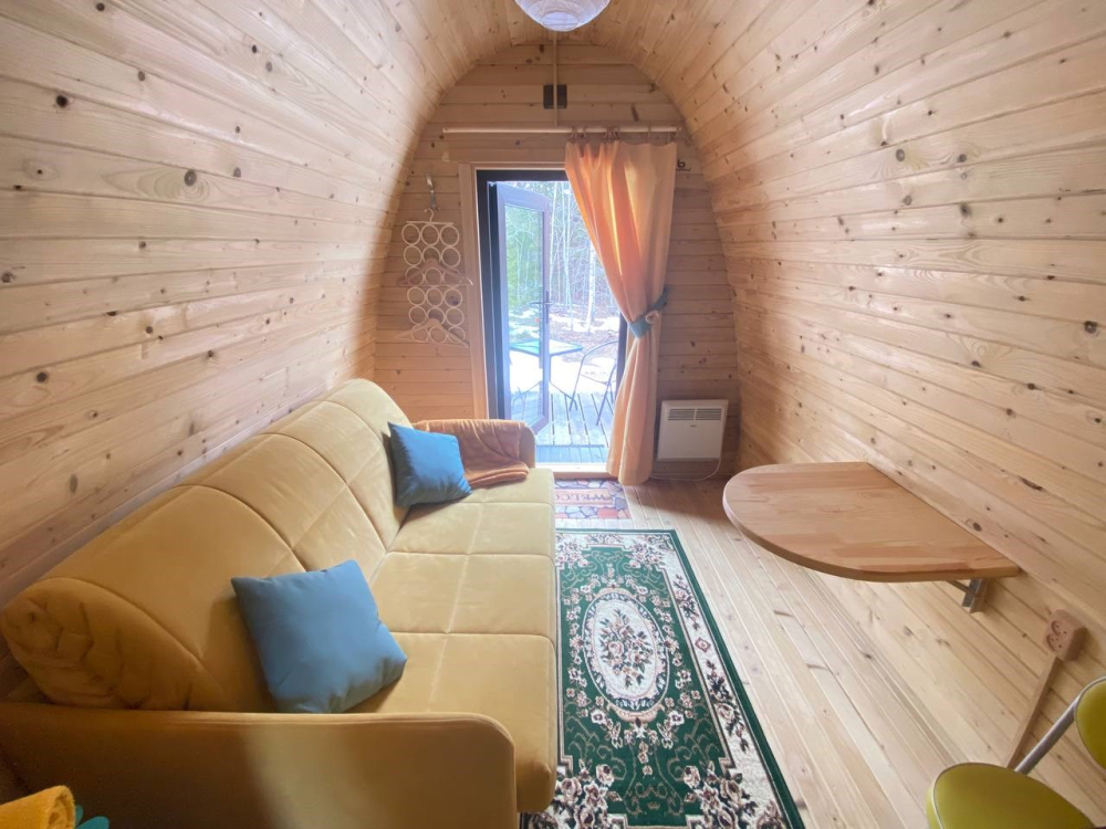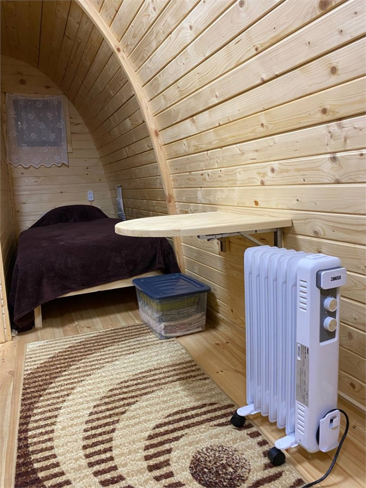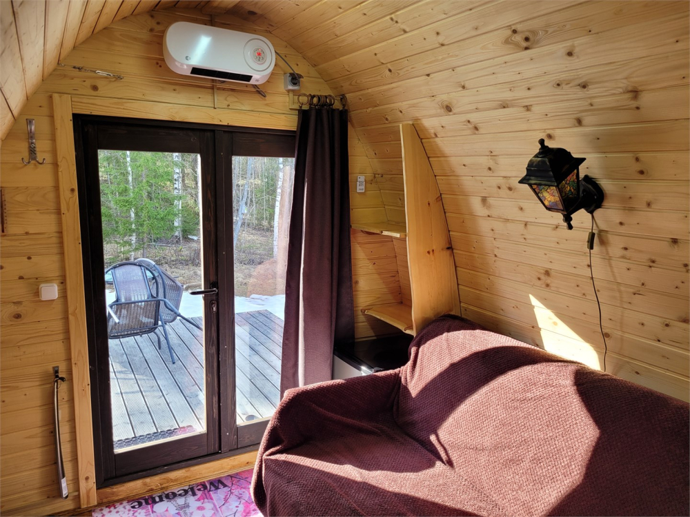 Небольшой арочный домик для отдыха с видом на лесной массив и отдельной террасой готов принять максимум двух гостей. В домике находится удобный двуспальный раскладной диван (1400*2000).