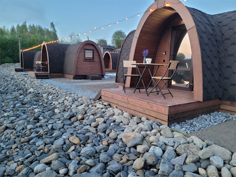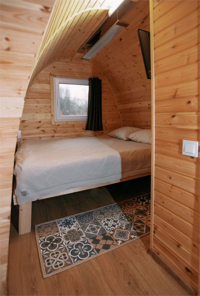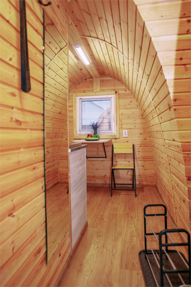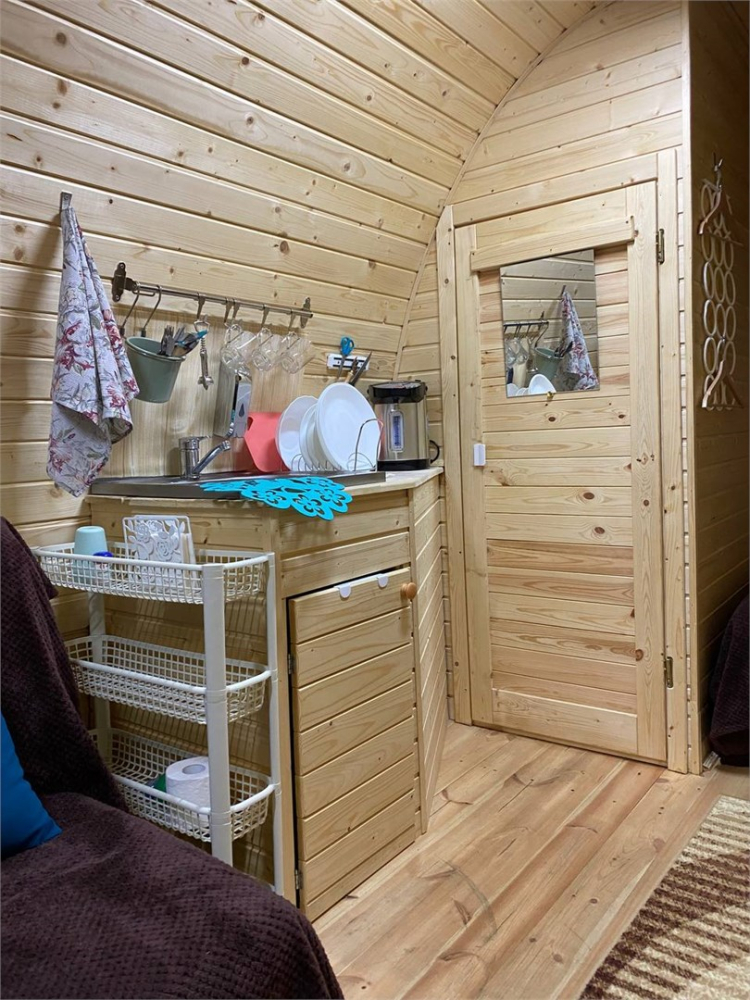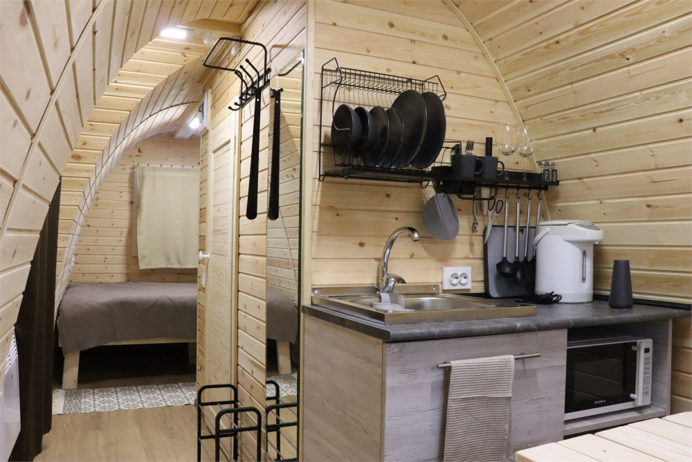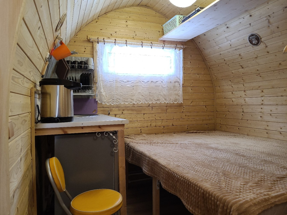 Небольшой арочный домик для отдыха с видом на лесной массив и отдельной террасой готов принять максимум двух гостей. В домике находится удобный двуспальный раскладной диван (1400*2000).