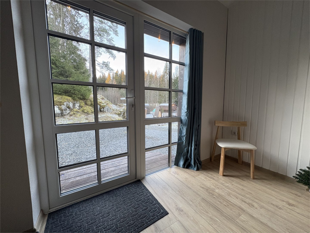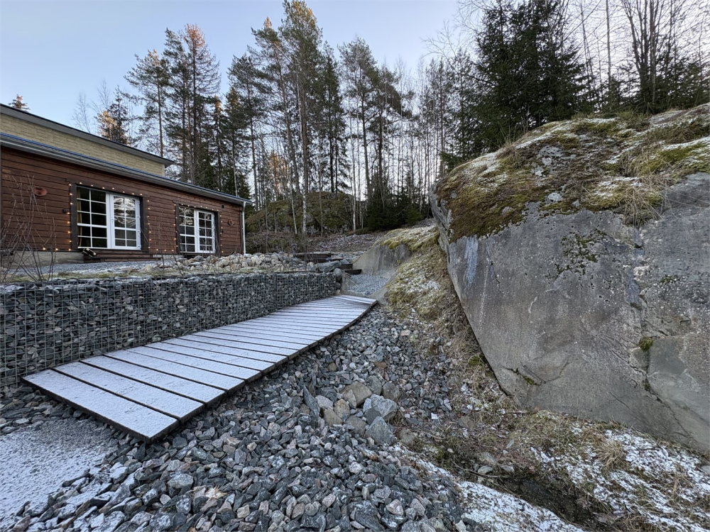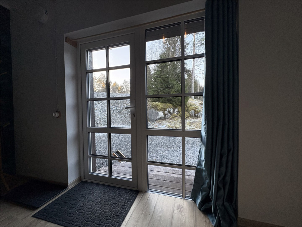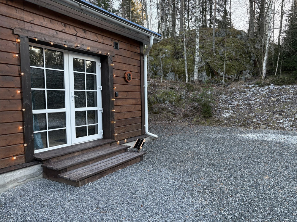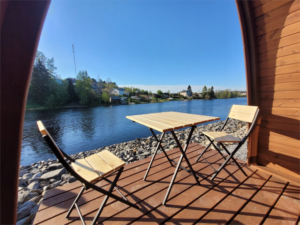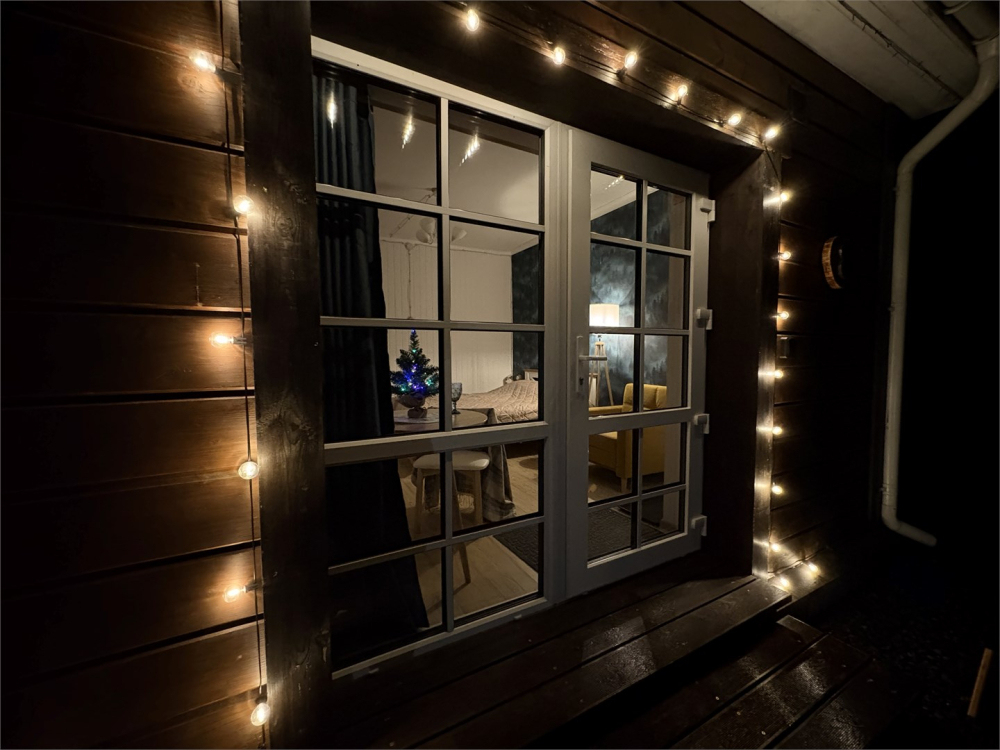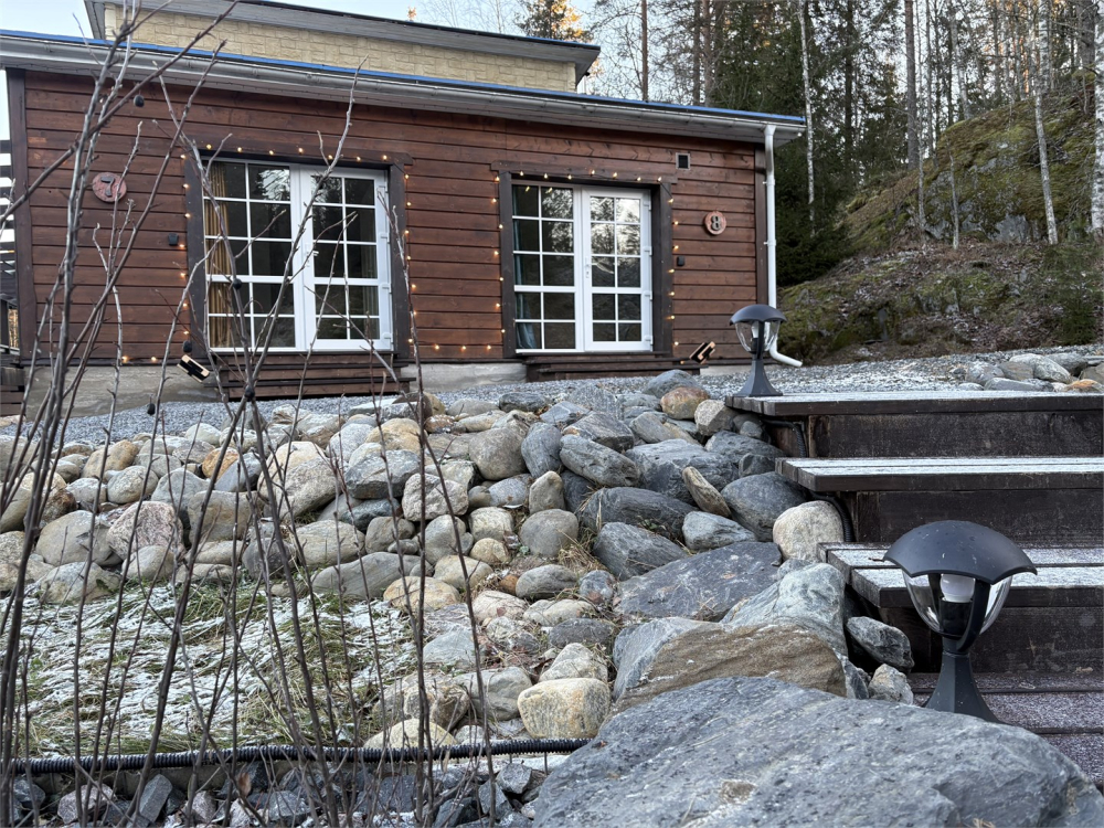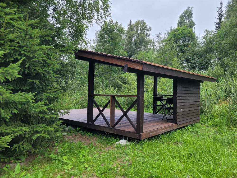 Домик выполнен полностью из дерева. На уличной террасе есть стол со стульями, где вы можете встретить новый или проводить уходящий день за чашечкой горячего чая или кофе с видом на реку Янисйоки. Терраса имеет небольшой навес, поэтому даже в дождливый день вы насладитесь трапезой с живописным видом на свежем воздухе.