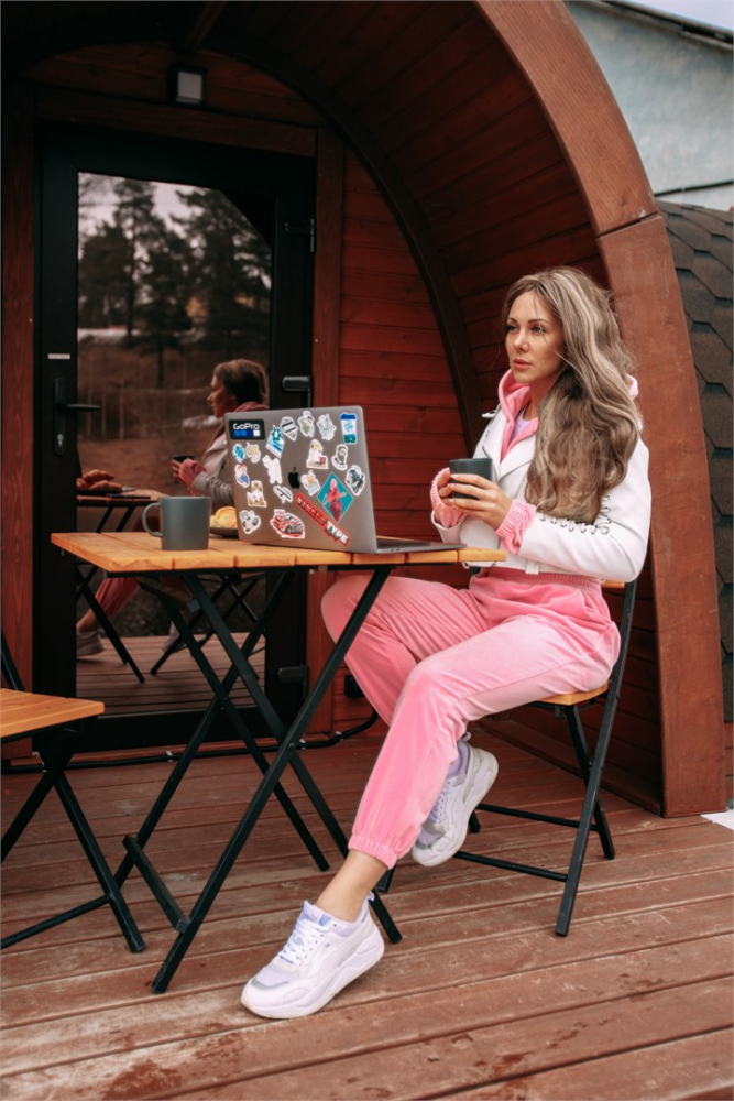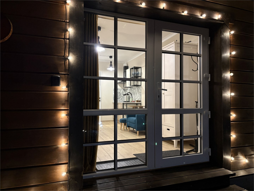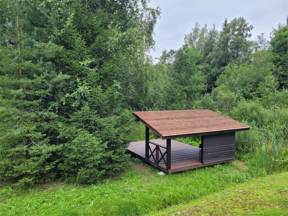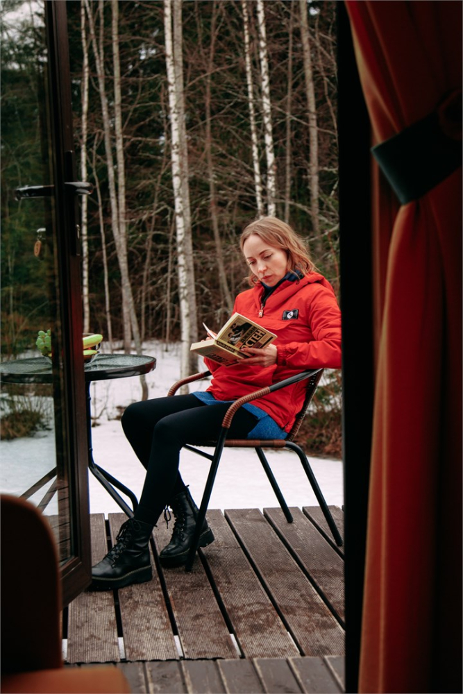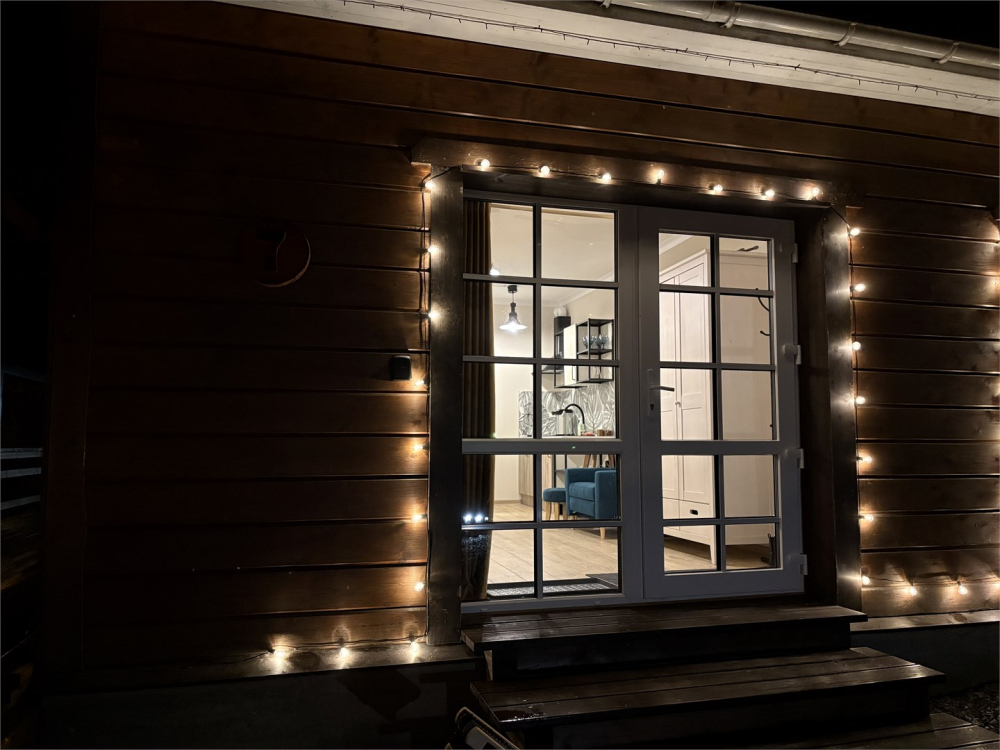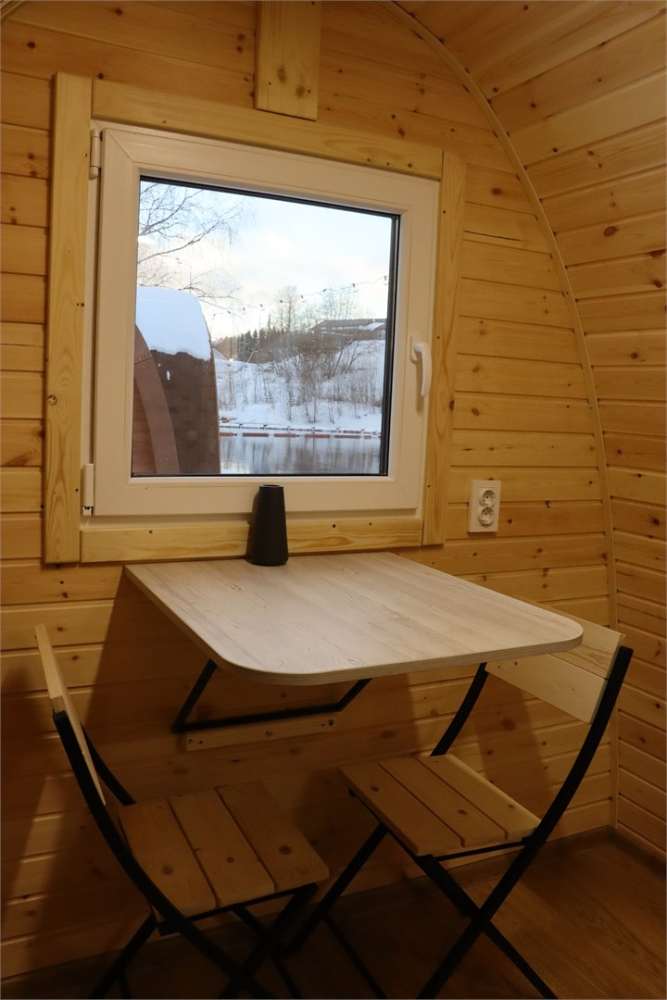 Домик выполнен полностью из дерева. На уличной террасе есть стол со стульями, где вы можете встретить новый или проводить уходящий день за чашечкой горячего чая или кофе.