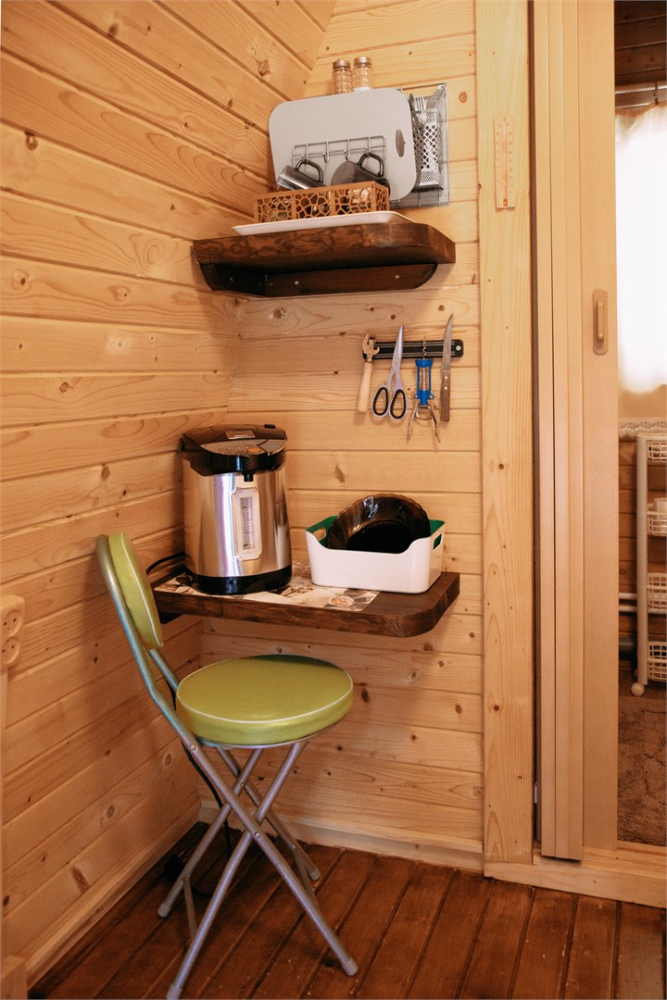Несмотря на небольшую площадь (всего 15 м.кв.), домик максимально полно и компактно оборудован всем необходимым для комфортного отдыха: