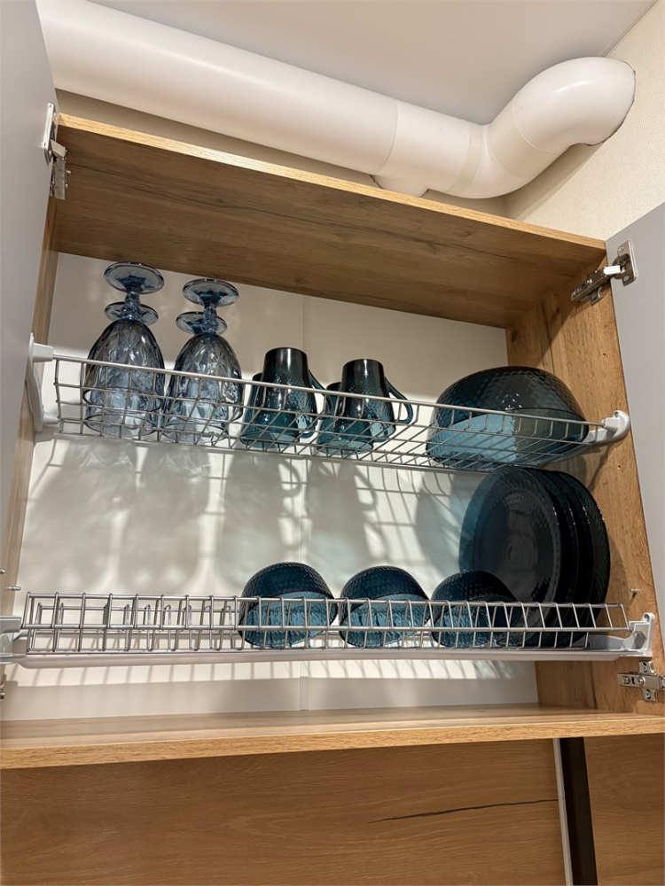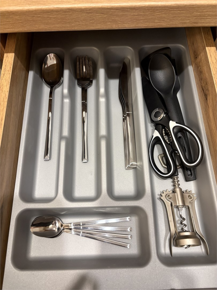 - посуда: тарелки, стаканы, столовые приборы, набор мисок, дуршлаг, кастрюля и сковородка