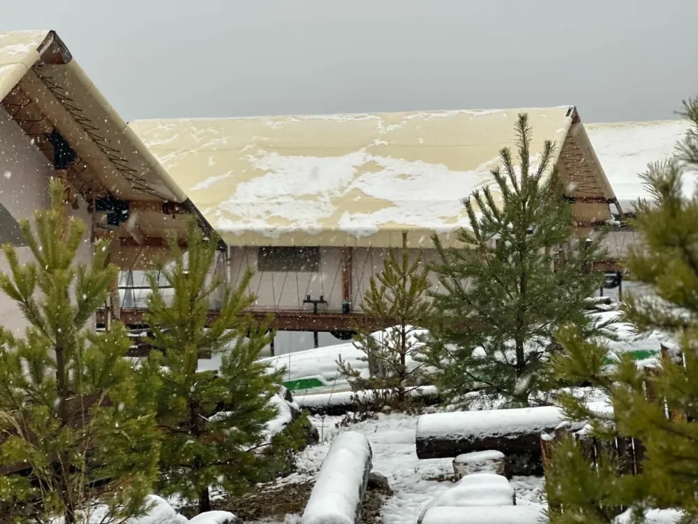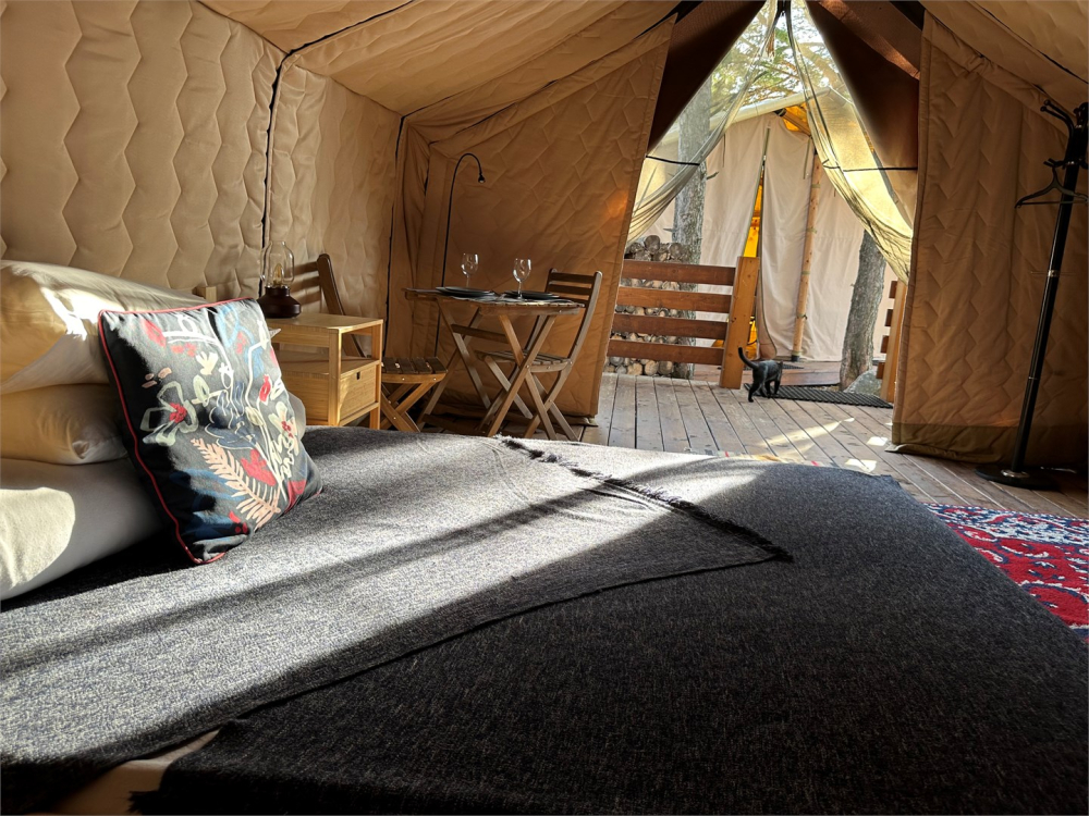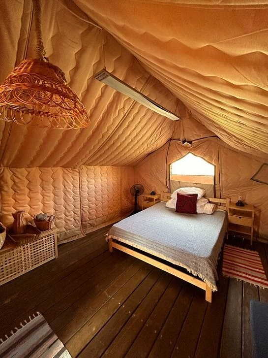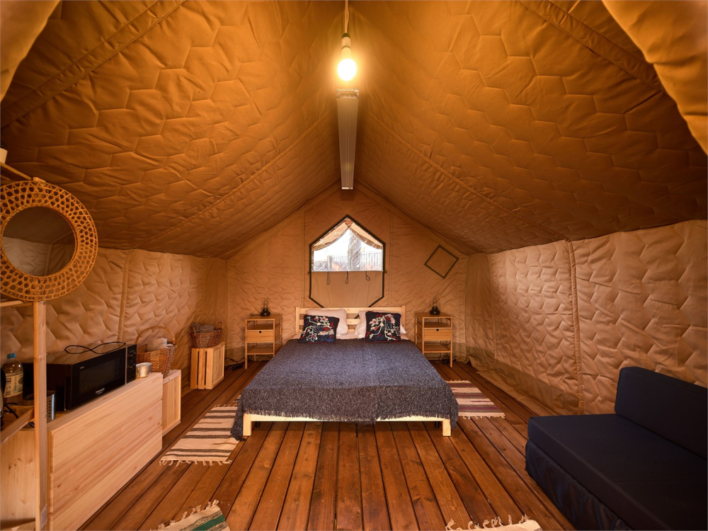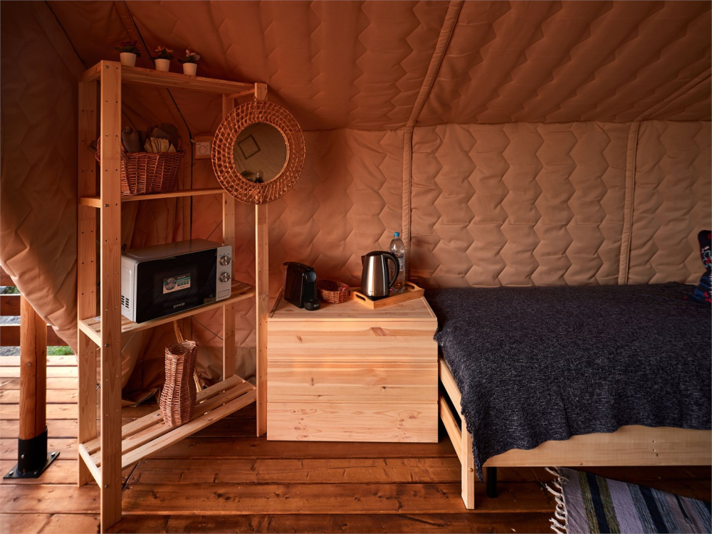 Внутри сафари-тента: двуспальная кровать 160*200 см, подушки, одеяла, пледы, диван раскладной 120*200 см (доп. место) , прикроватные тумбочки, зеркало, инфракрасный обогреватель, конвектор .