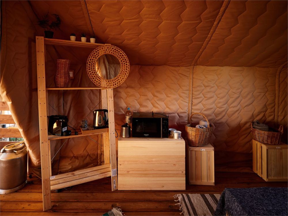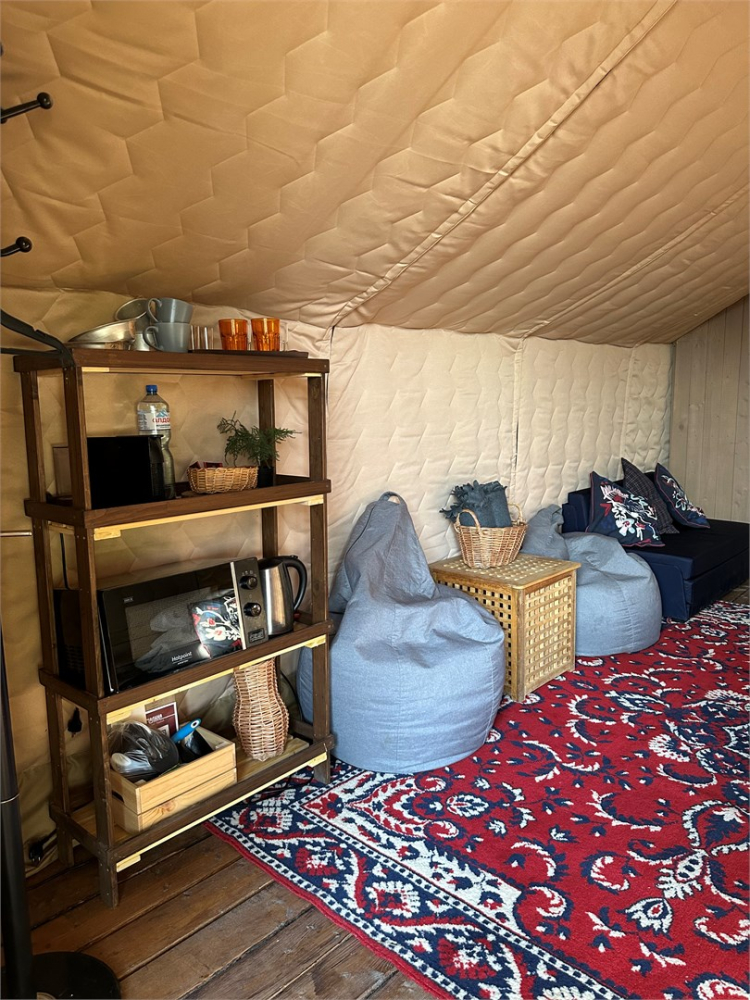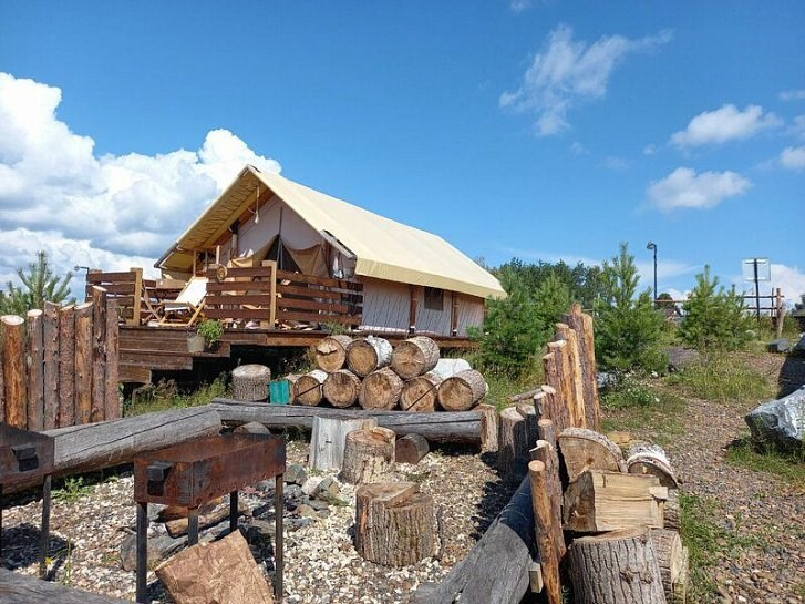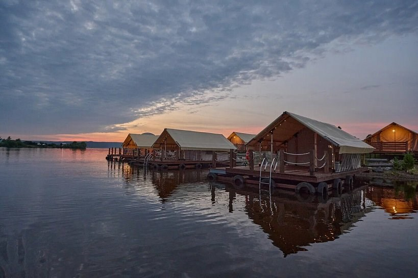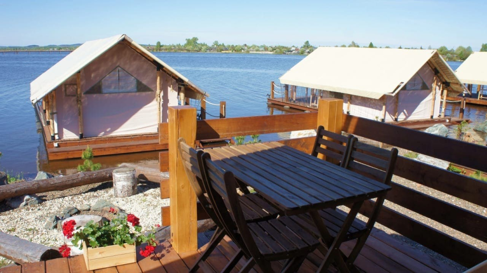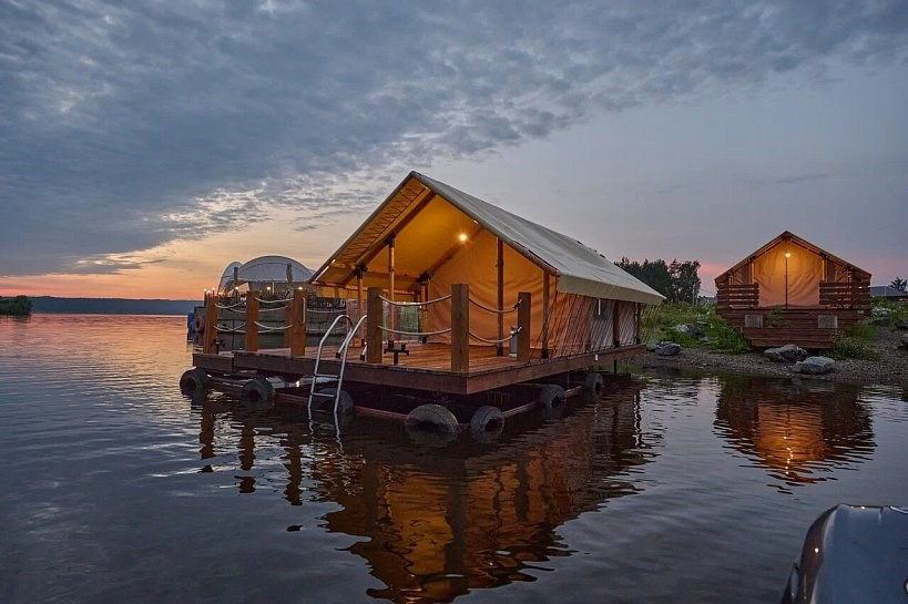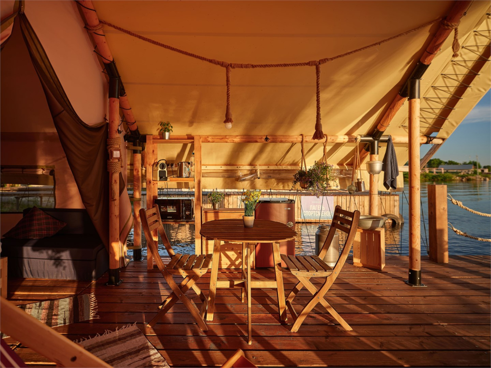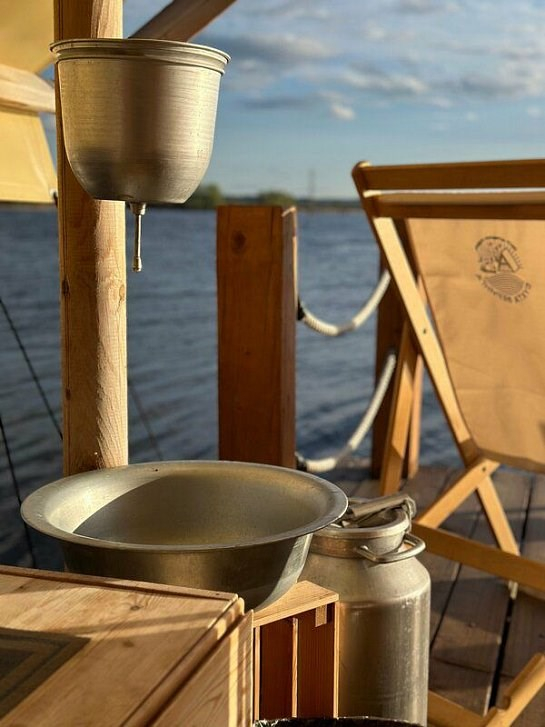 Комфортабельный сафари-тент на воде (имеется возможность швартовки собственного судна) Внутри сафари-тента: 2 кровати 90*200см, одеяла,подушки , пледы, стол-сундук, детская кроватка по необходимости, диван раскладной 120*200 см,(доп. место) две прикроватных тумбочки, светильники, зеркало, сейф,инфракрасный обогреватель, конвектор, полотенца. На террасе: мини кухня, набор посуды (одноразовый), электрический чайник, микроволновая печь, капсульная кофе-машина, холодильник, стол, стулья, шезлонги, умывальник, комод и стеллаж, гамак.