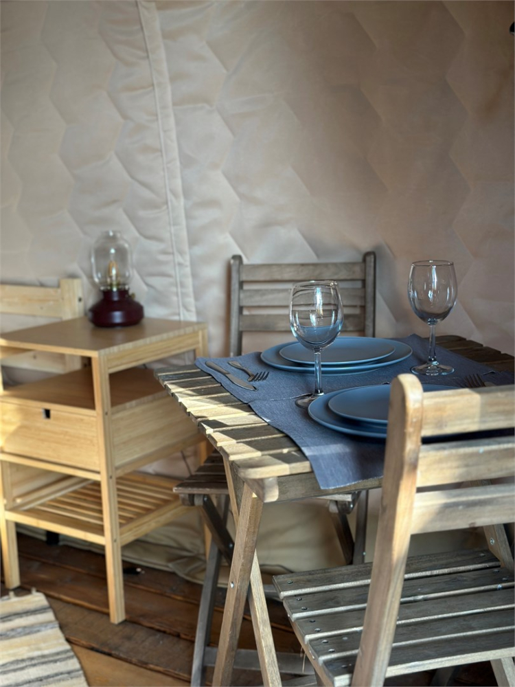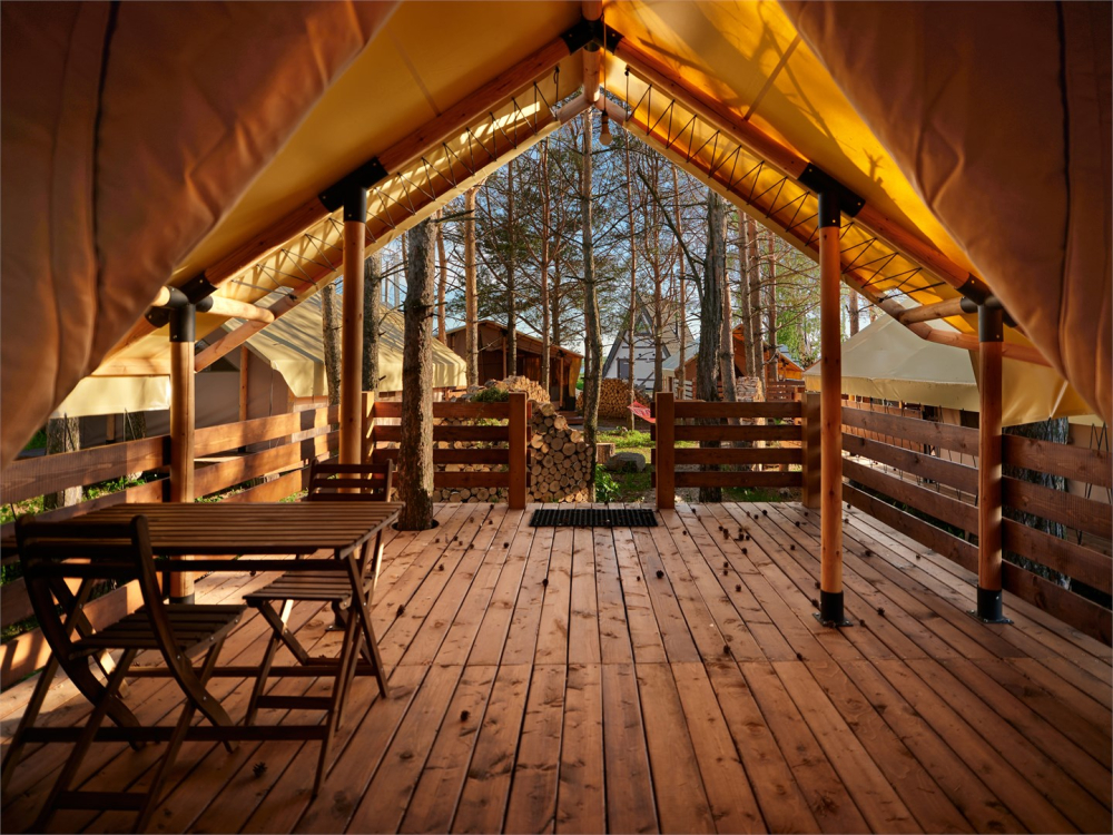 Отсюда открывается прекрасный вид на лес, а ночной воздух пропитан запахом теплой земли и хвои. Завтракать, обедать и ужинать можно прямо на террасе. Терраса обустроена мини-кухней. Мангал предоставляется по запросу. В жаркую погоду сафари-тент проветривается, а в прохладную обогревается инфракрасным обогревателем и конвектором