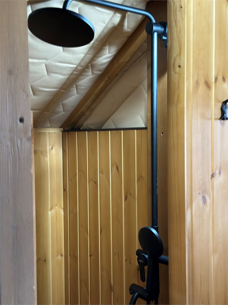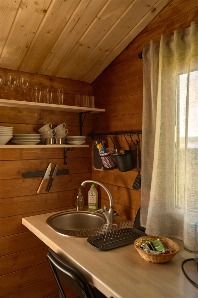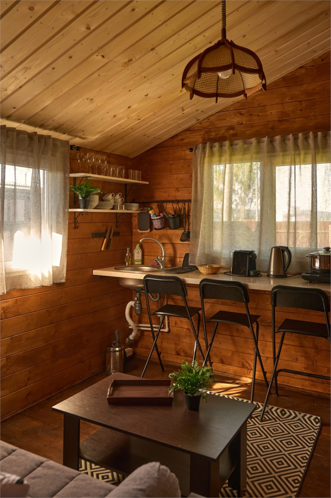 Мини кухня : набор посуды, электрический чайник, микроволновая печь, кофемашина, стол, стулья, умывальник, ночное освещение, мангал.