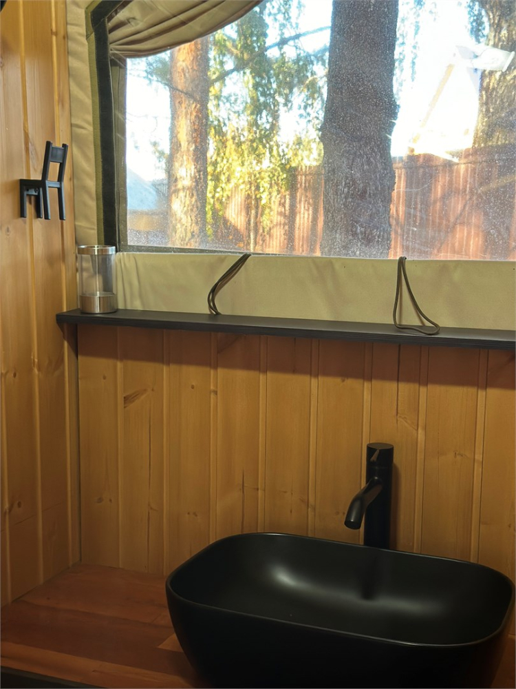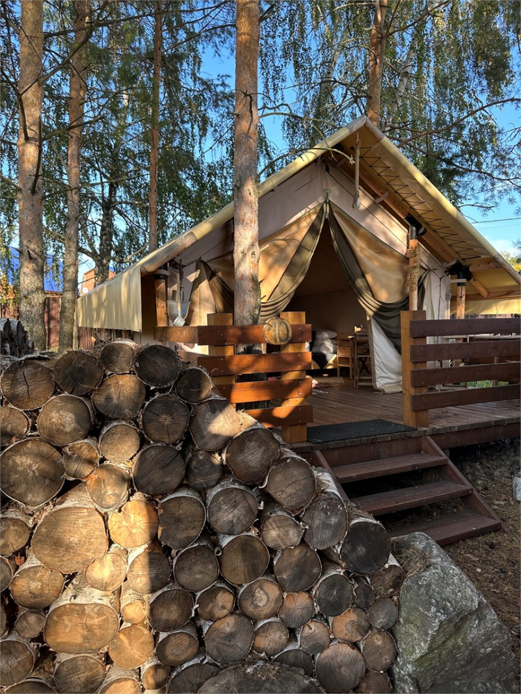 Комфортабельный утепленный, оборудованный душем и туалетом сафари-тент с видом на лес.