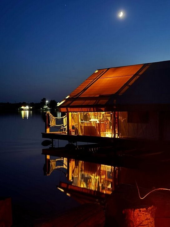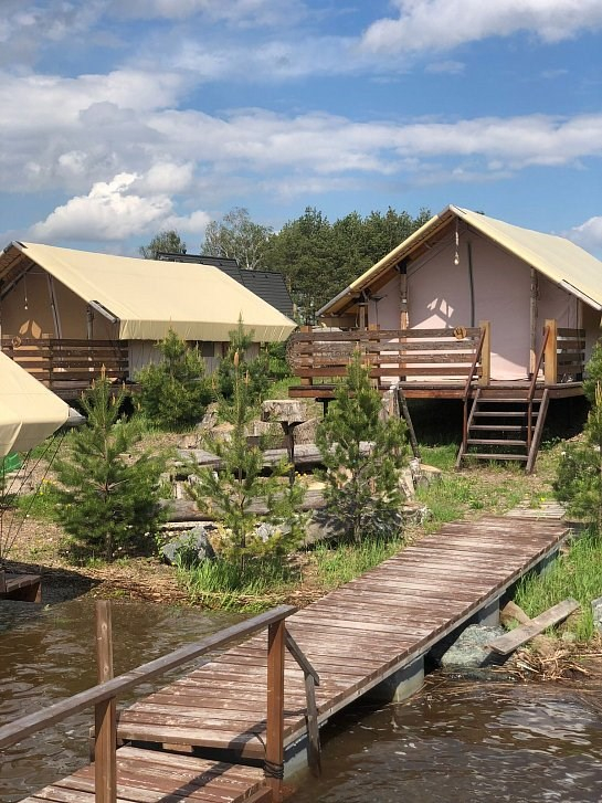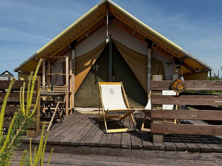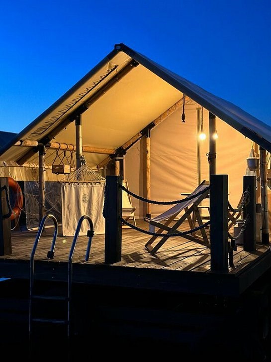 Комфортабельный сафари-тент на воде, (имеется возможность швартовки собственного судна). Количество спальных мест два. Внутри сафари-тента: двуспальная кровать 160*200 см, одеяла, два пледа,подушки, стол-сундук, детская кроватка по необходимости, диван раскладной 120*200 см (доп.место), две прикроватных тумбочки, светильники, зеркало, сейф, обогреватель,вешалка, полотенца. На террасе: мини кухня, набор посуды (одноразовый), электрический чайник, микроволновая печь, капсульная кофе-машина, холодильник, стол, 2 стула, 2 шезлонга, умывальник, комод и стеллаж, ночное освещение, гамак, лестница с прямым спуском в воду.