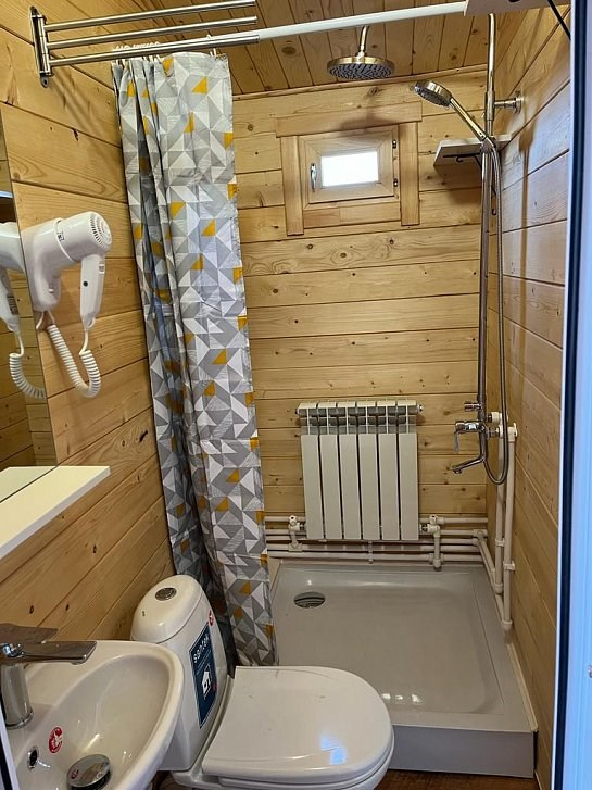 В сафари-тентах удобства представлены общим санитарном блоком, состоящим из 8 кабинок оборудованных душем с горячей водой, туалетом, умывальником, зеркалом и феном (находится в 10 м. от сафари-тента). Туалетные принадлежности и полотенца включены в стоимость.