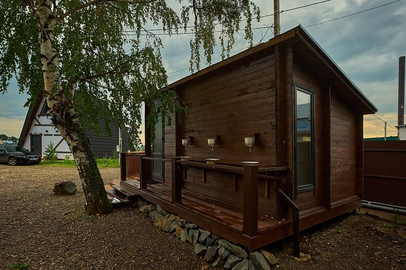 Небольшая комната отдыха со столом и скамейками. Душевая, парилка. Есть ведро для обливания. Ванна под открытым небом отапливаемая дровами. Летний душ. Отдельная территория с закрытой террасой, зоной отдыха оборудованной скамейками, шезлонгами.Вместительность: до 6 человек. (Каждый дополнительный гость 100 ₽)Входят: мёд, травяной чай, берёзовый веник, полотенца, банные шапочки.