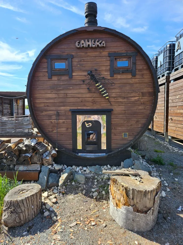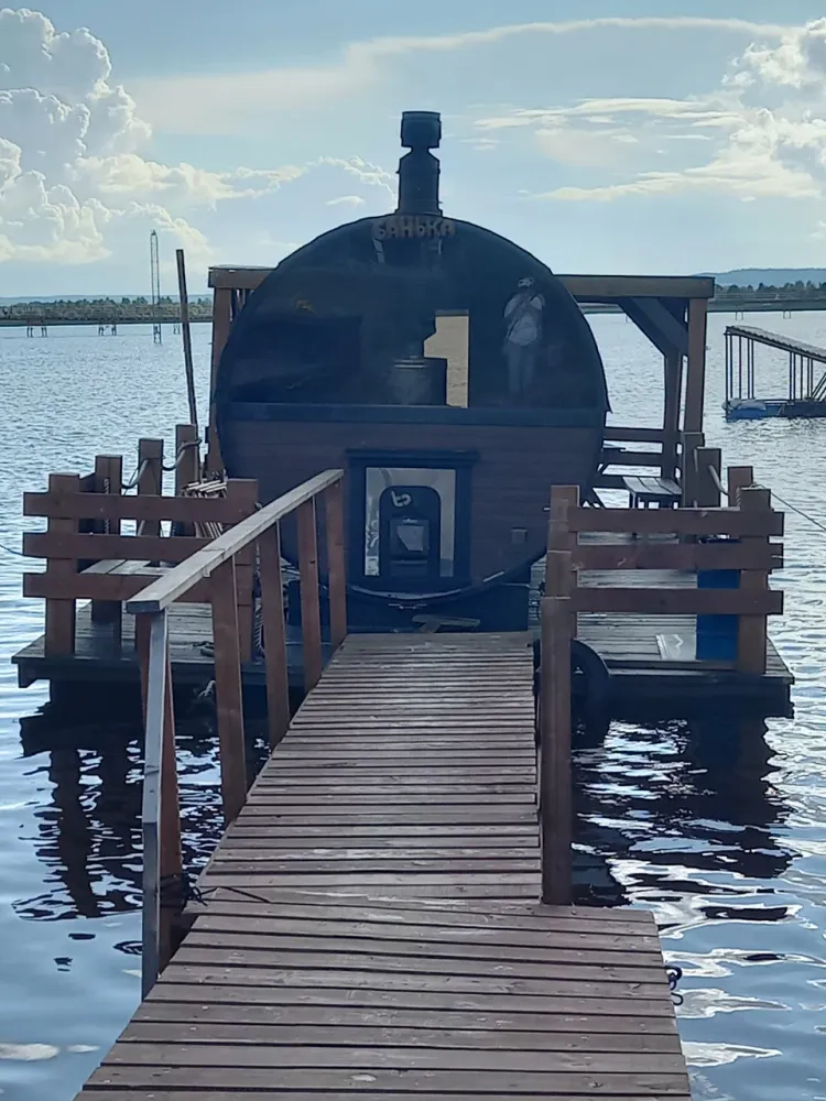 Также есть Баня-бочка на воде с панорамным окном в парилке с видом на залив и закат, небольшая комната отдыха со столом и скамейками и открытой террасой для отдыха.Стоимость 1500р/час от 2 часов.