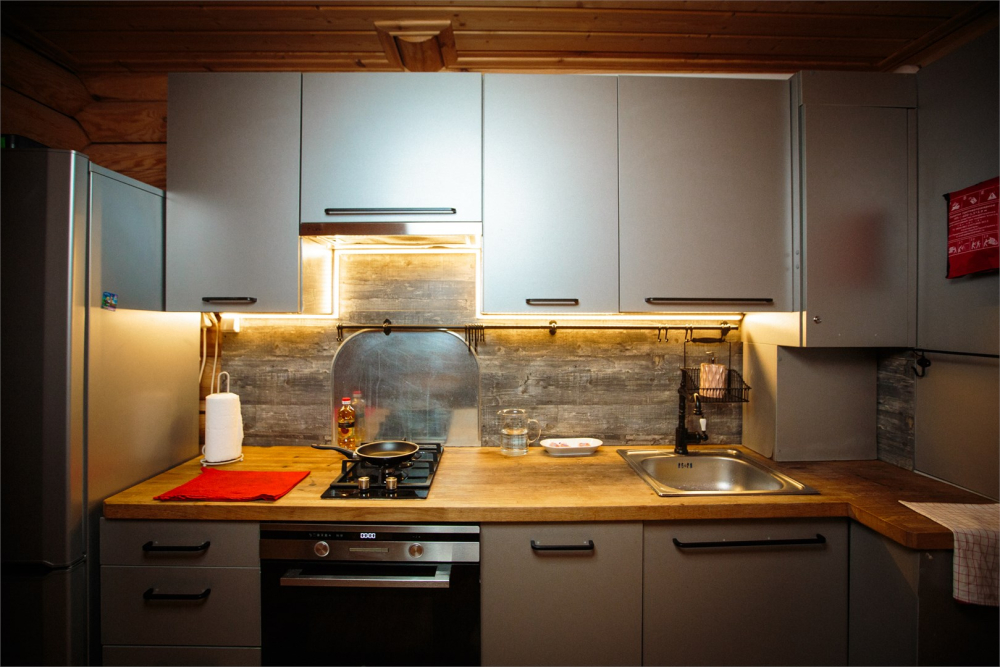 - Кухня: Полный набор посуды, плита, холодильник, микроволновка и чайник.