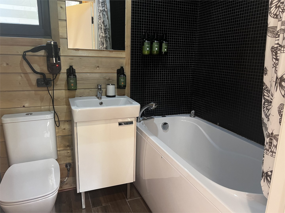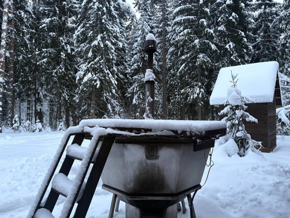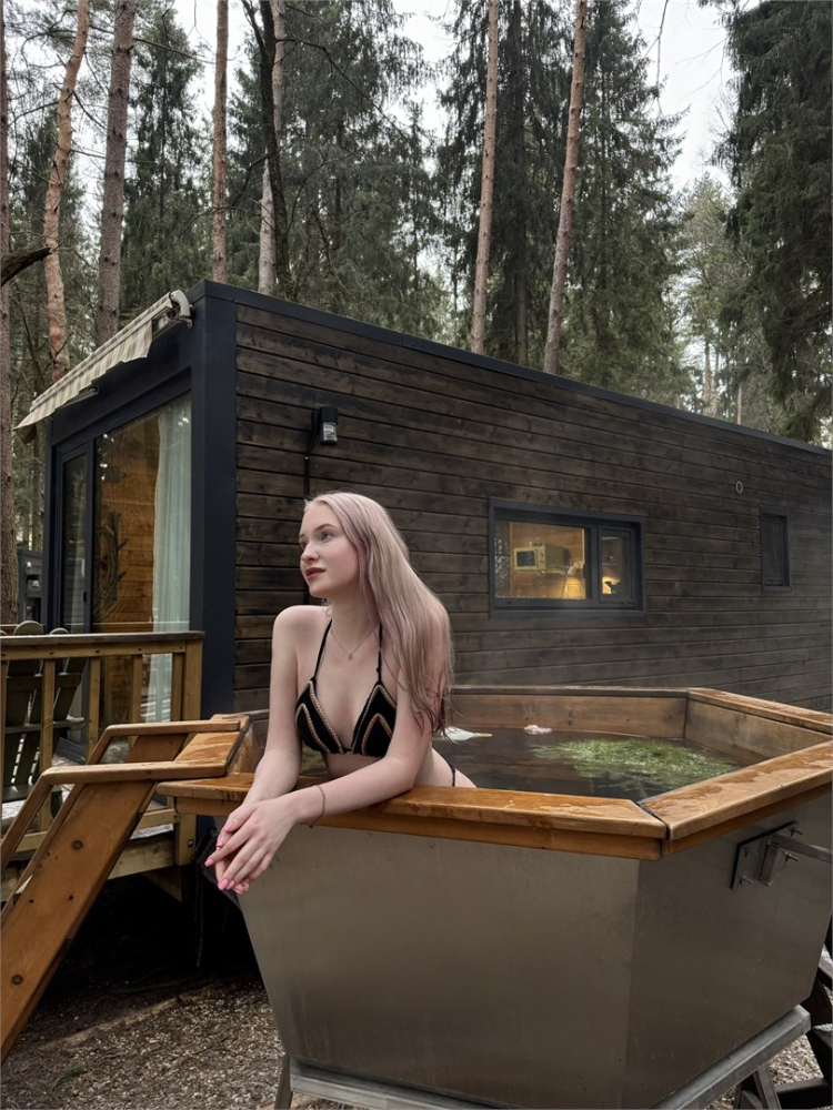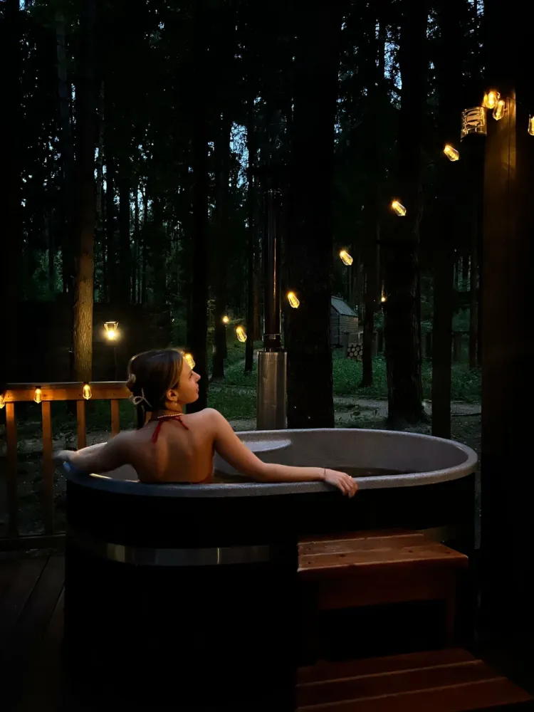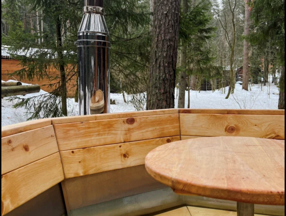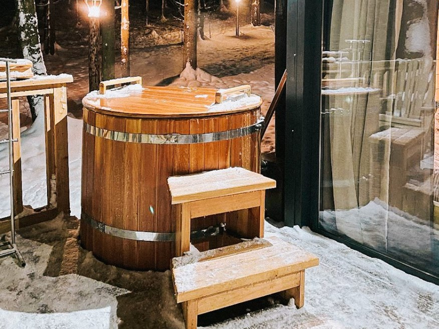 Горячий чан есть около домиков Дом-студия с бочкой фурако, Дом на воде с бочкой фурако, Двухкомнатный дом с горячей купелью, Купольный дом-сфера с бочкой фурако, Семейный коттедж с горячей купелью, Семейный коттедж с горячей купелью и камином.