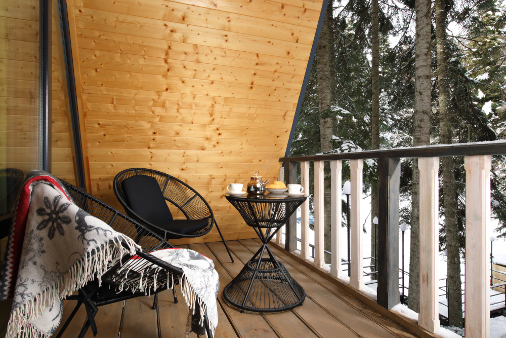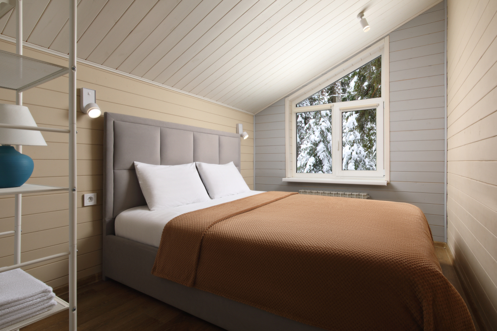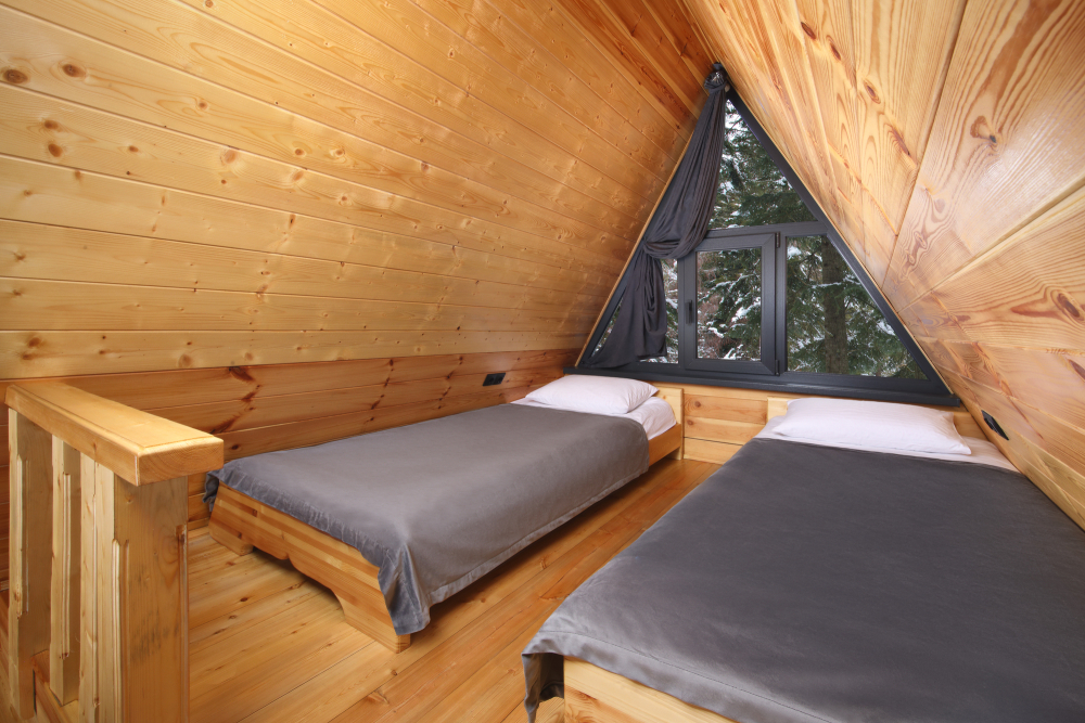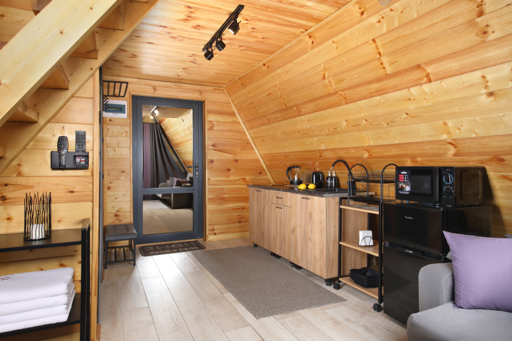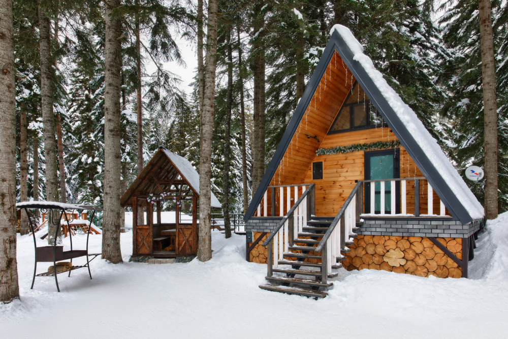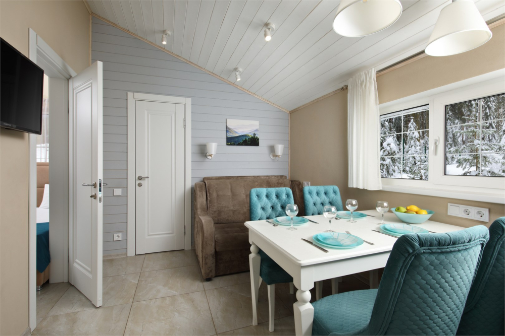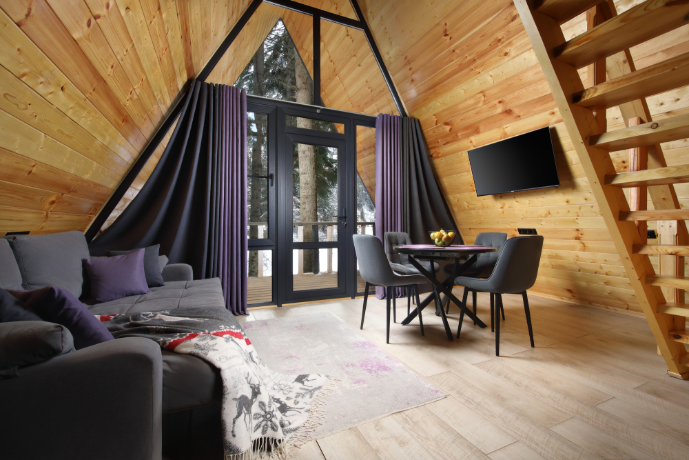 - Просторные А-фреймы (A-Frame) с панорамными окнами.