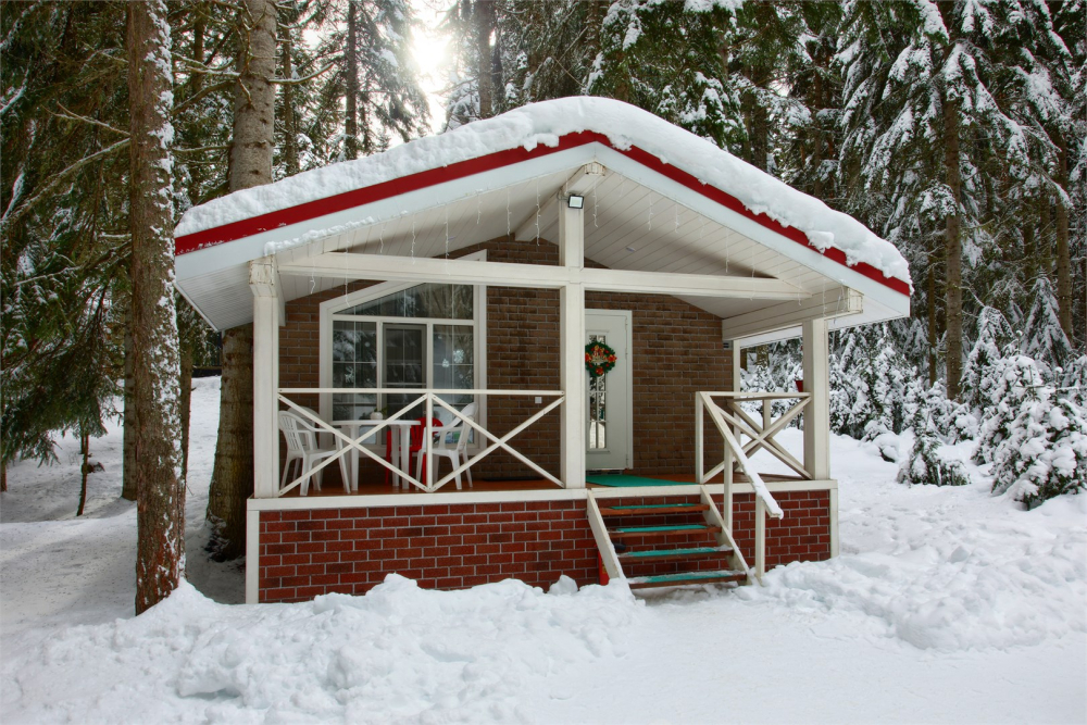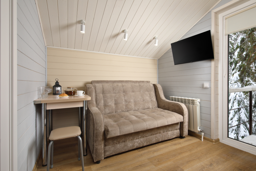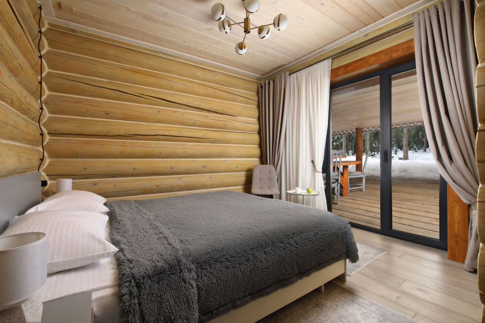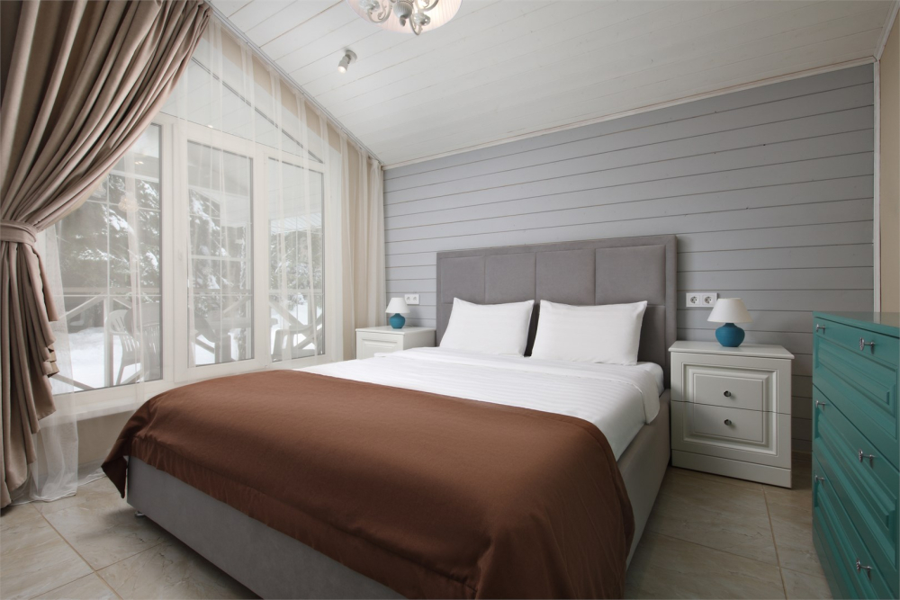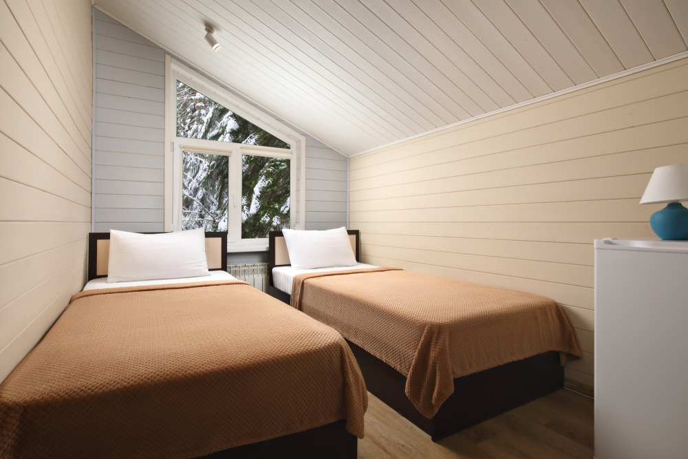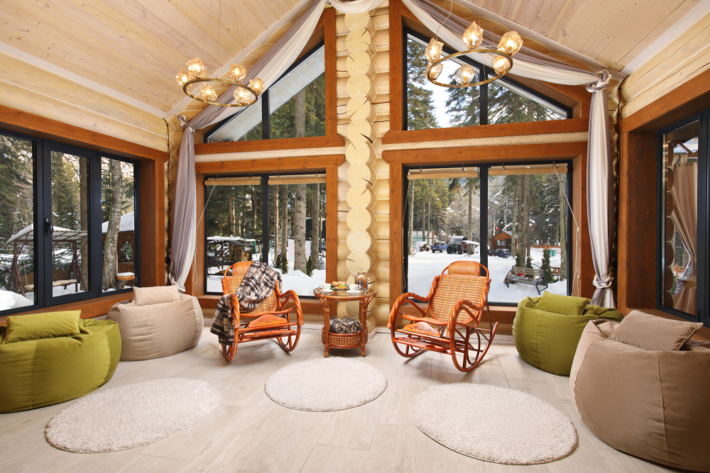 - Просторные А-фреймы (A-Frame) с панорамными окнами.