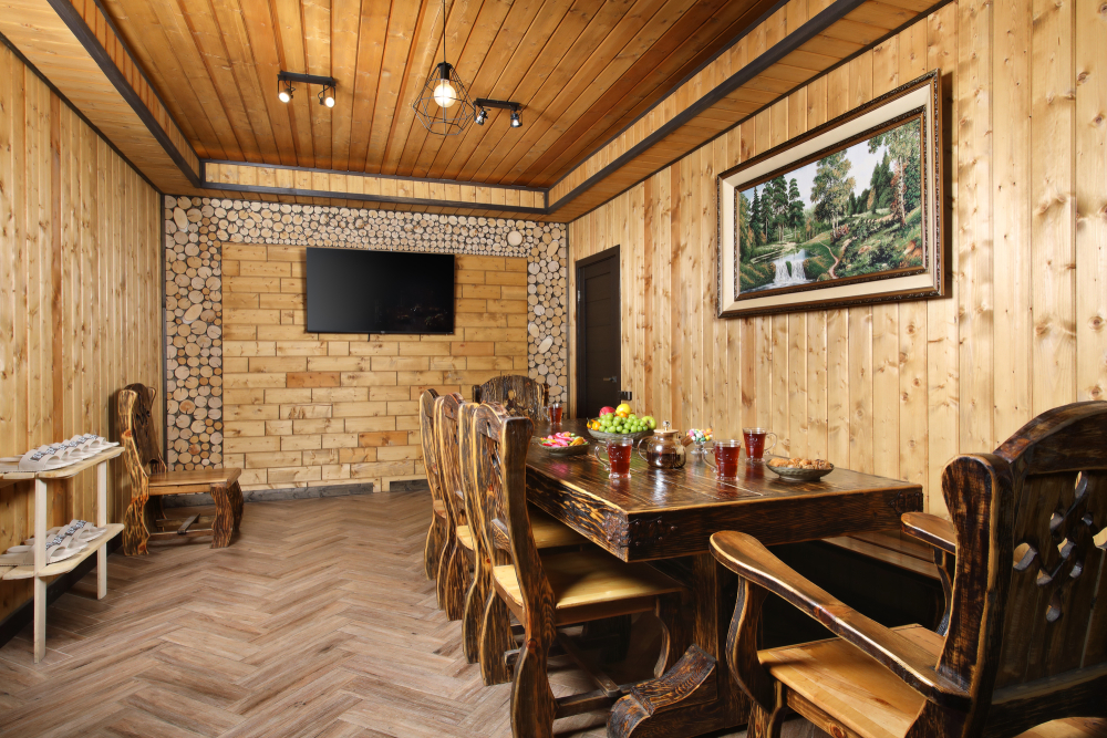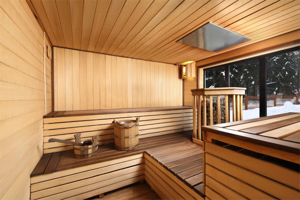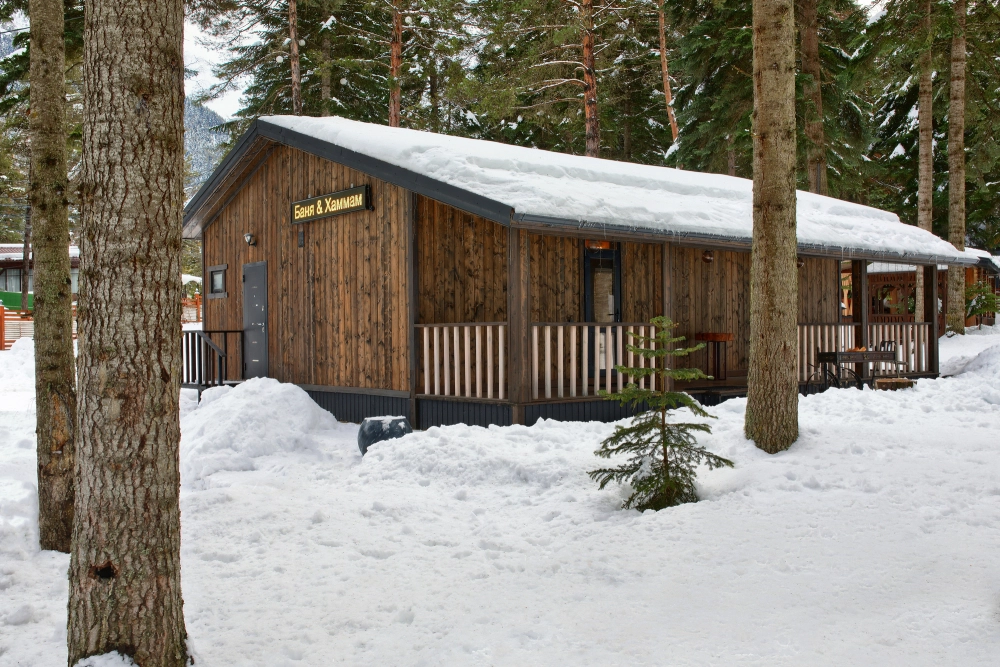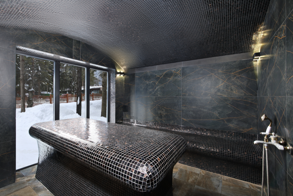 К услугам гостей базы отдыха уникальный банный комплекс площадью 100 м², сочетающий в себе современный дизайн и продуманные детали. В комплексе предусмотрены финская сауна и турецкий хаммам с панорамными окнами, которые наполняют пространство естественным светом и создают ощущение единения с природой. В хаммаме установлен массажный стол, что позволяет полностью расслабиться и получить удовольствие от процедур.