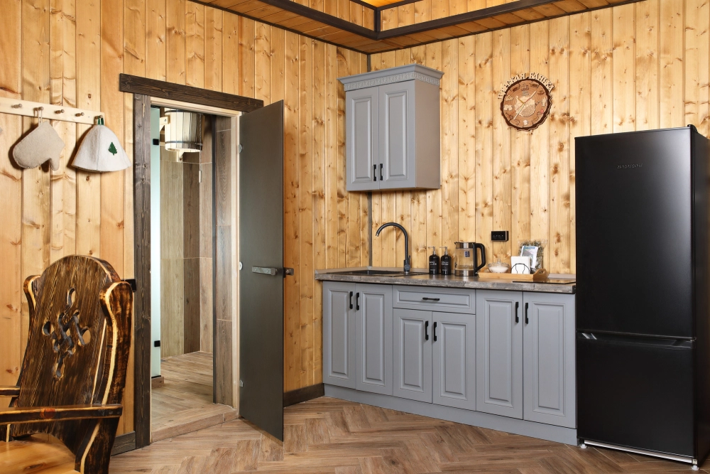 Интерьер комплекса выполнен в дизайнерском стиле с использованием качественных материалов и приятных мелочей, которые делают отдых особенно уютным. Просторная гостиная и комната отдыха обеспечивают комфортное пространство для общения и релаксации. Для удобства гостей предусмотрен санузел и душевые обливные устройства.