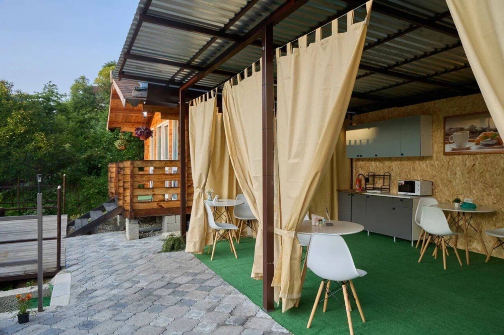 Есть общая кухня на свежем воздухе: плита, посуда, стиральная машина, микроволновая печь. Мангал и зона отдыха.
