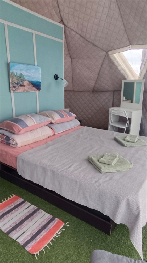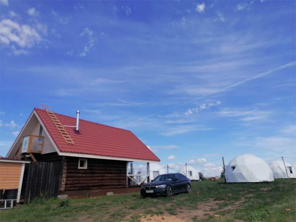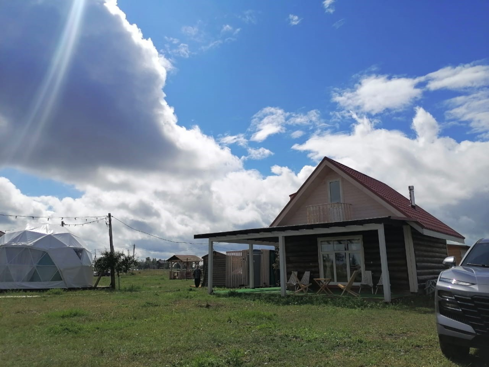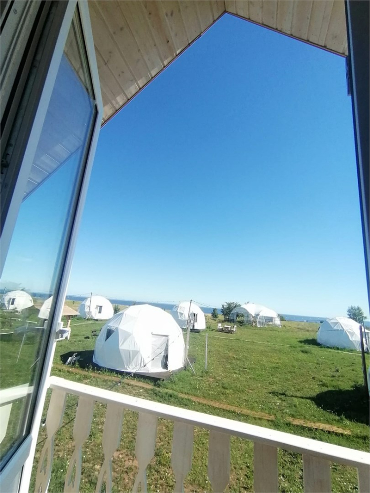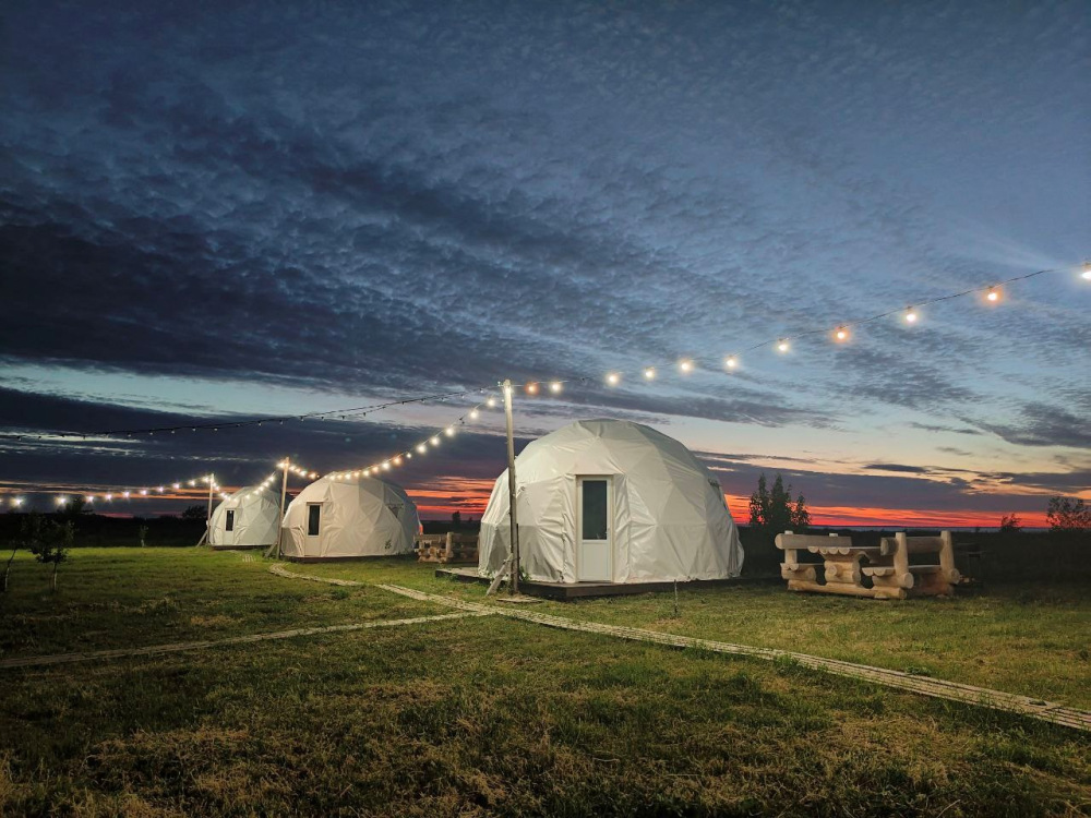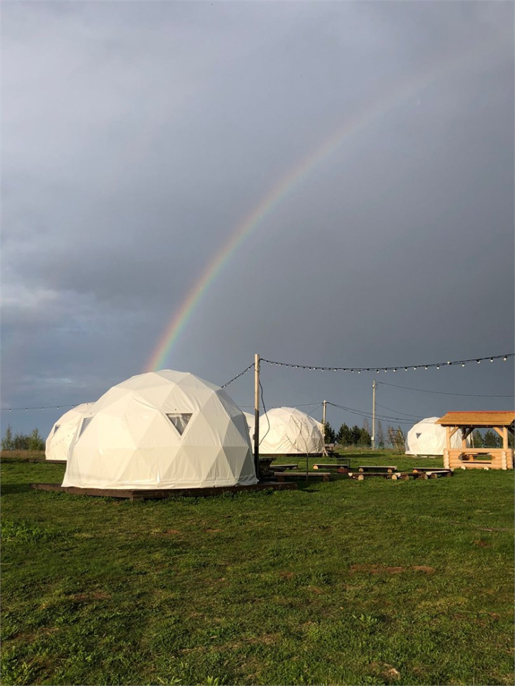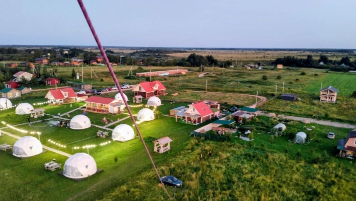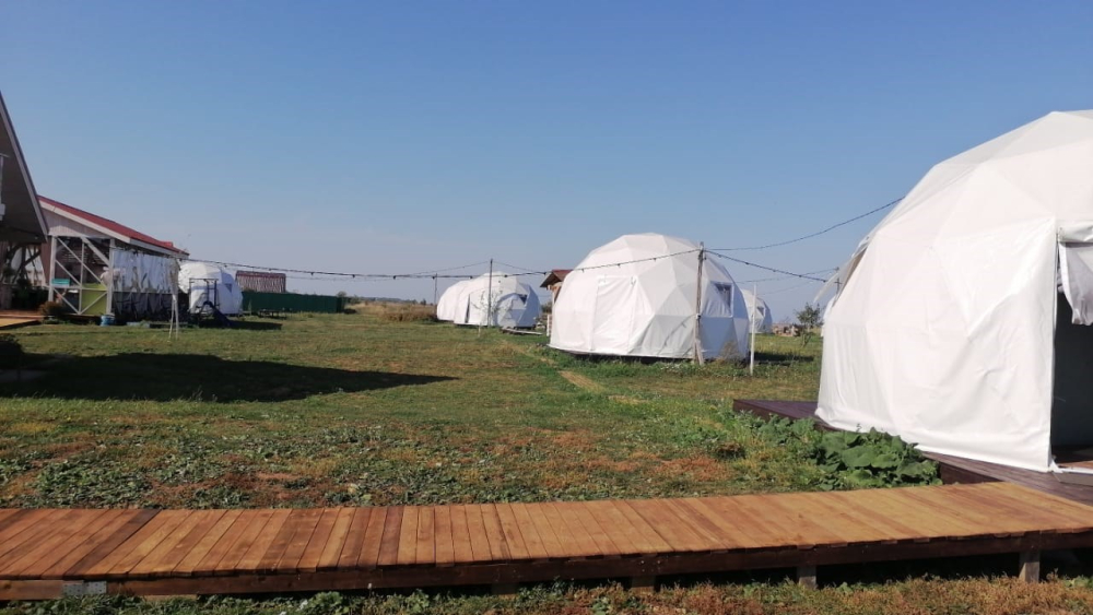 На территории расположены стильные купольные шатры с панорамным видом на озеро.