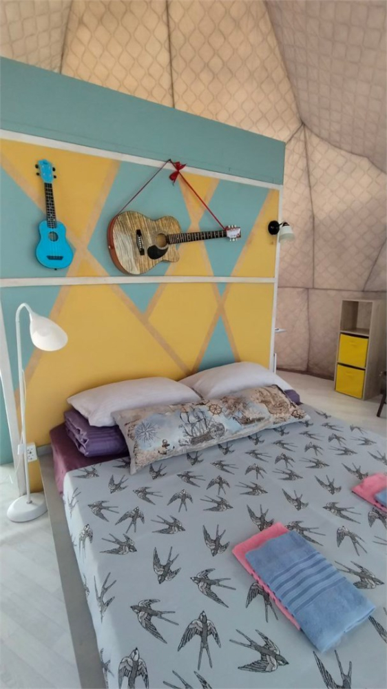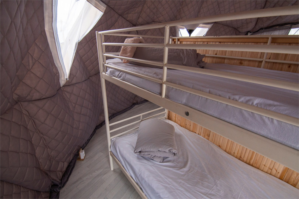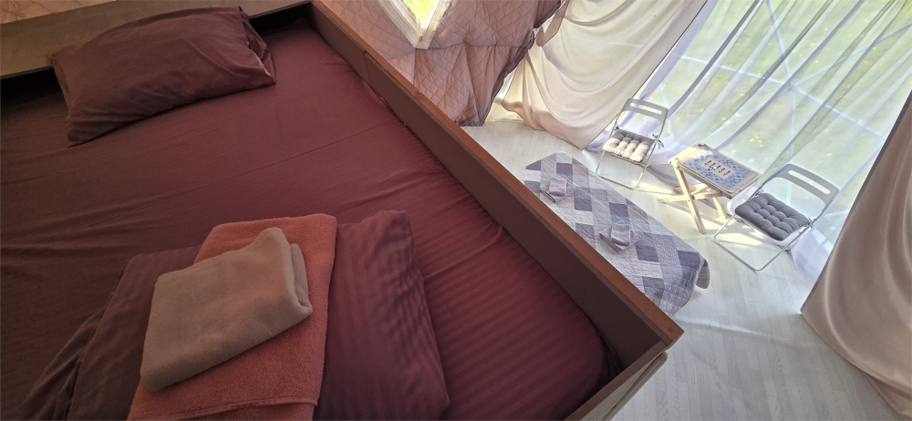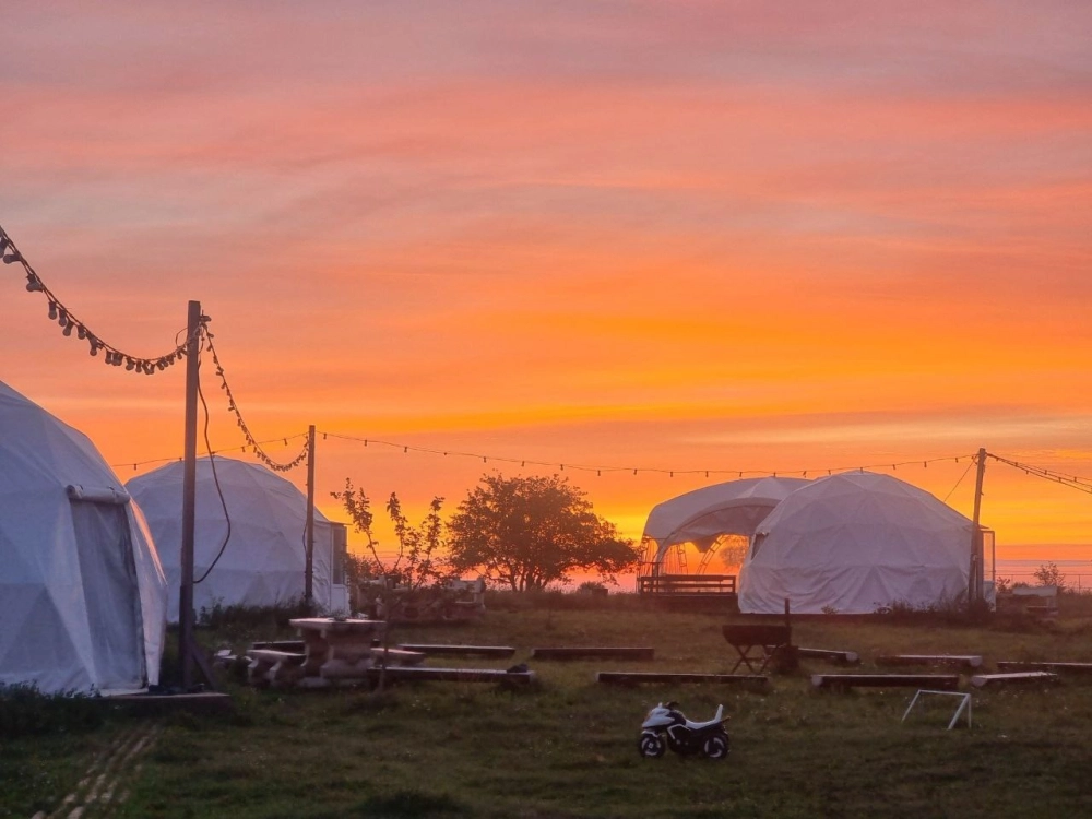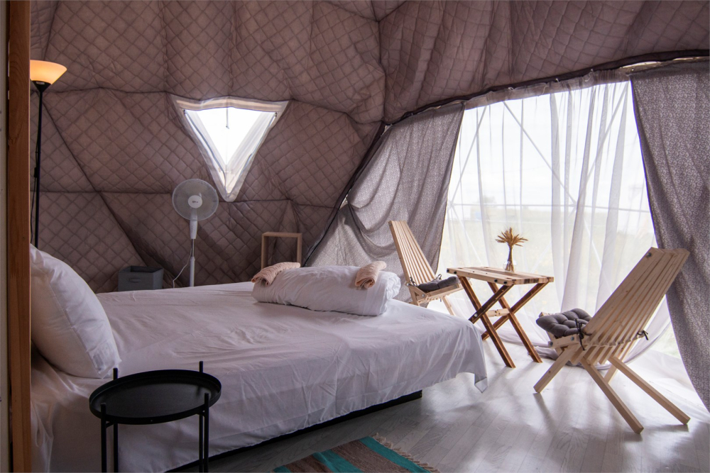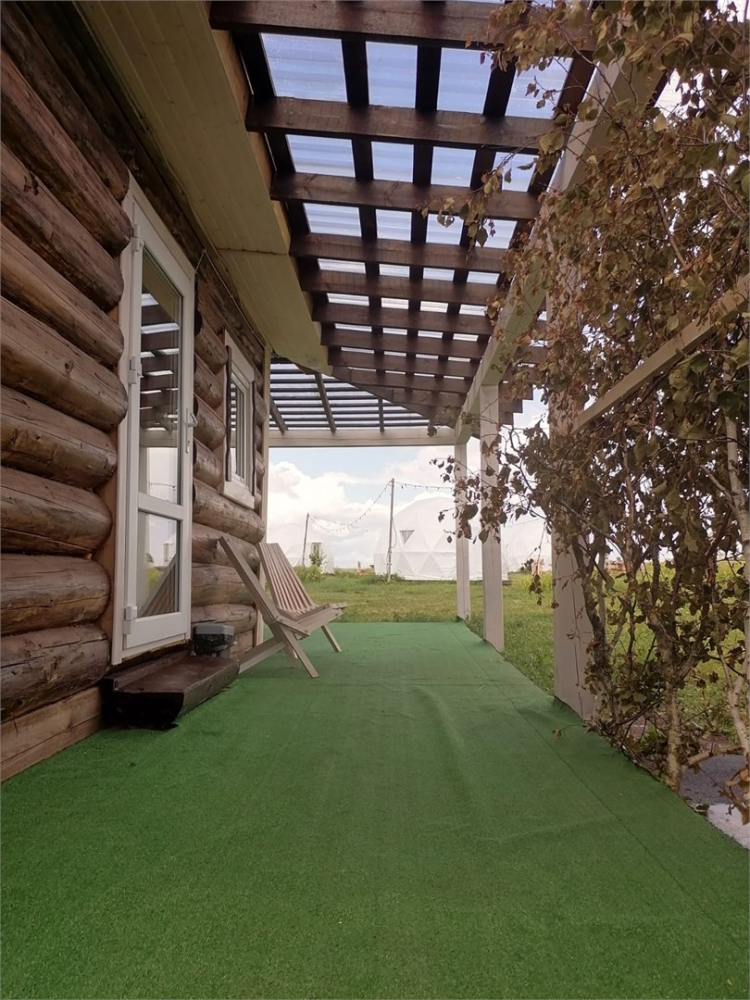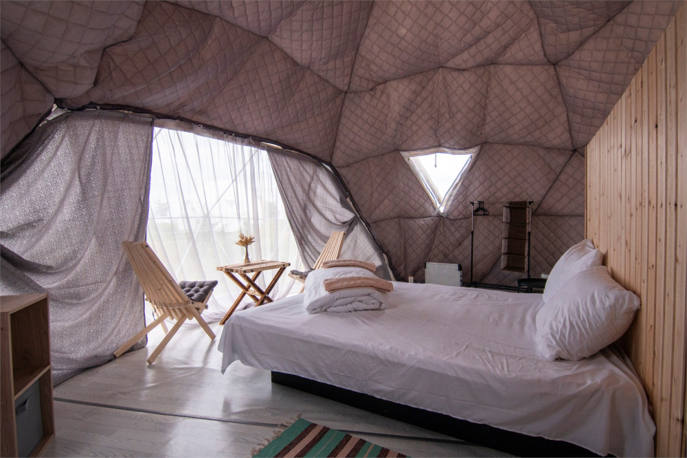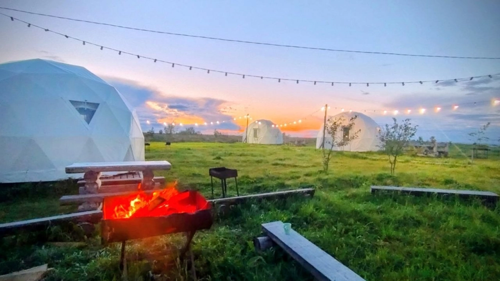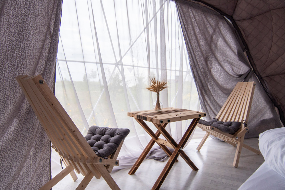 На территории расположены стильные купольные шатры с панорамным видом на озеро.