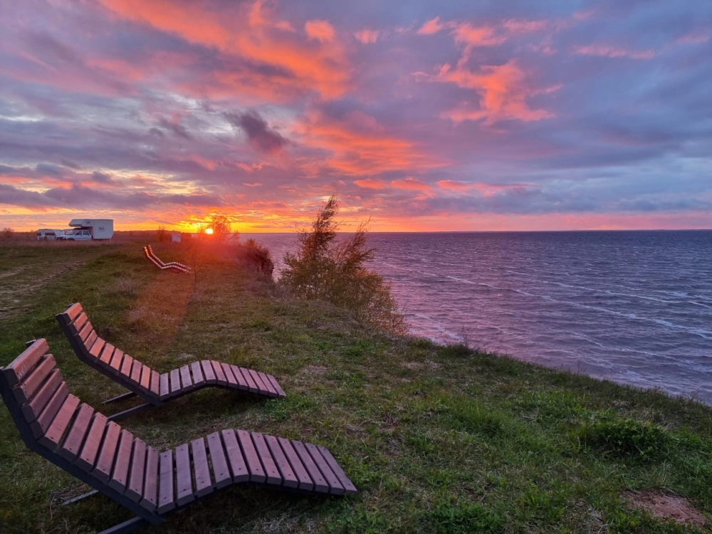 На территории глэмпинга зона отдыха с деревянными лежаками с видом на озеро Ильмень