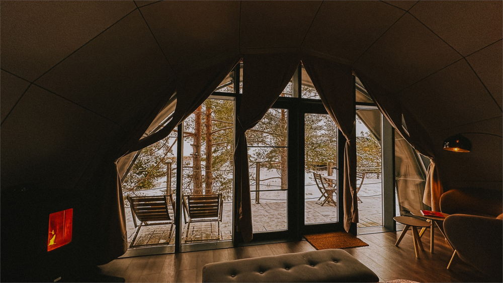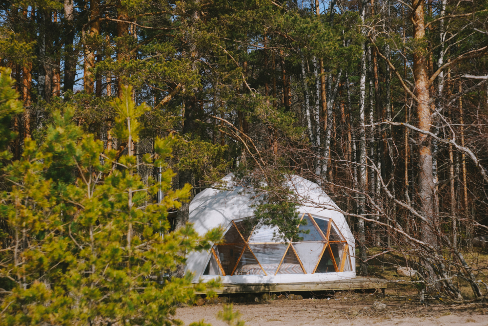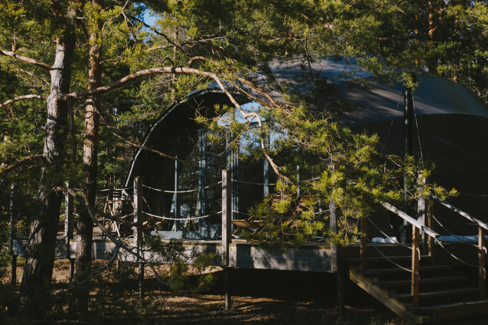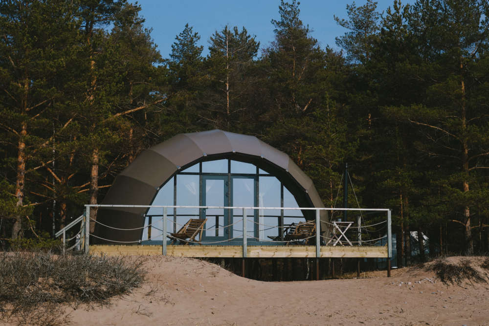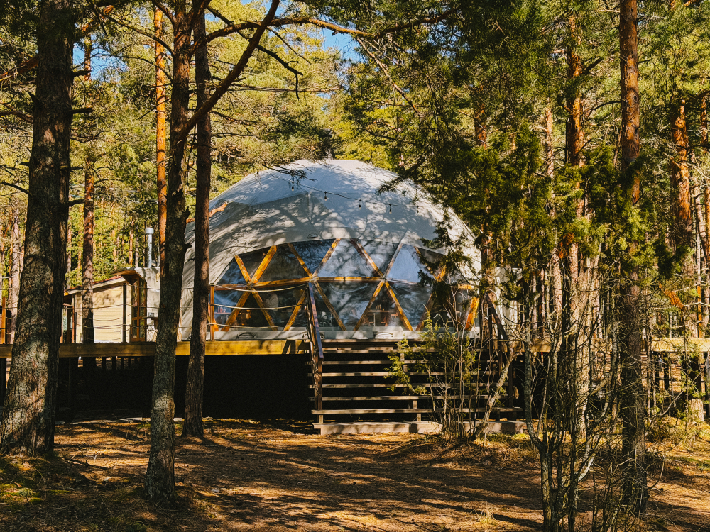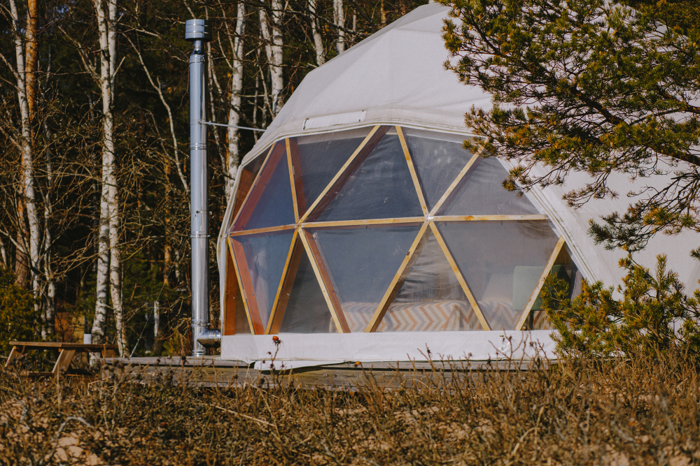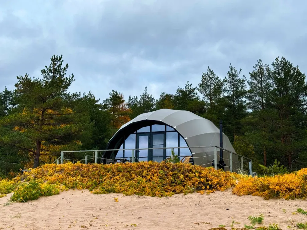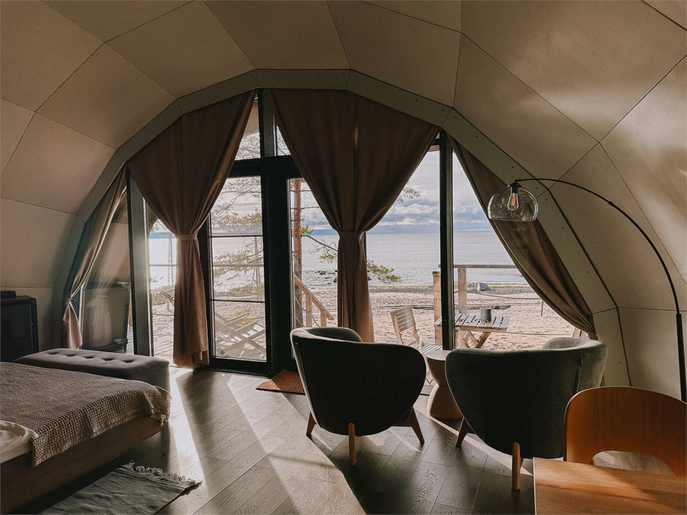 Купол с панорамным окном и видом на Финский залив. Площадь купола 28 квадратных метров, максимальное количество гостей 4 человека.