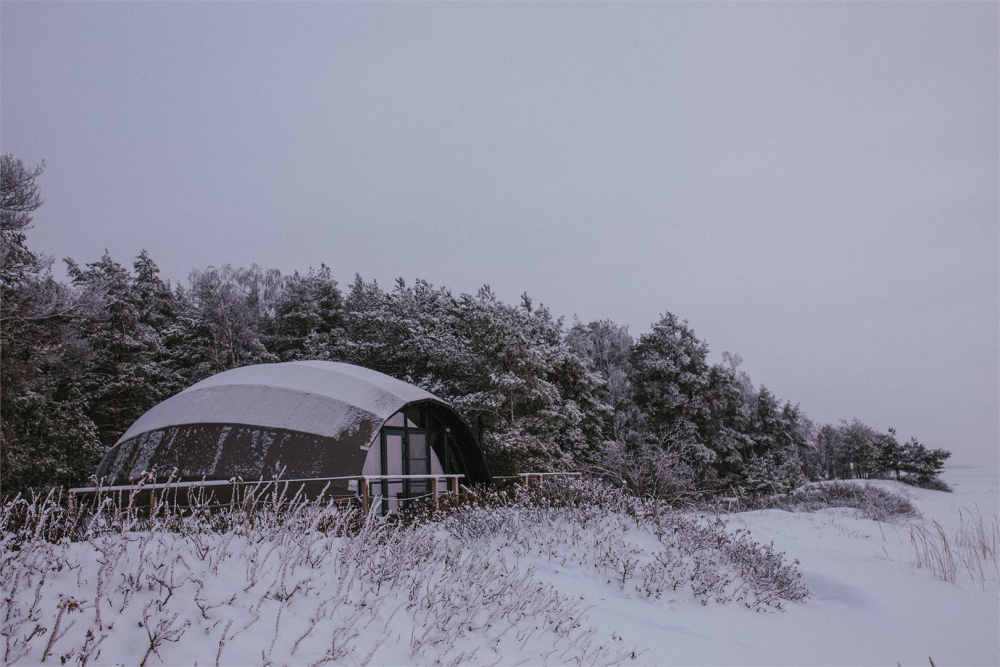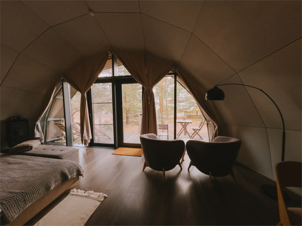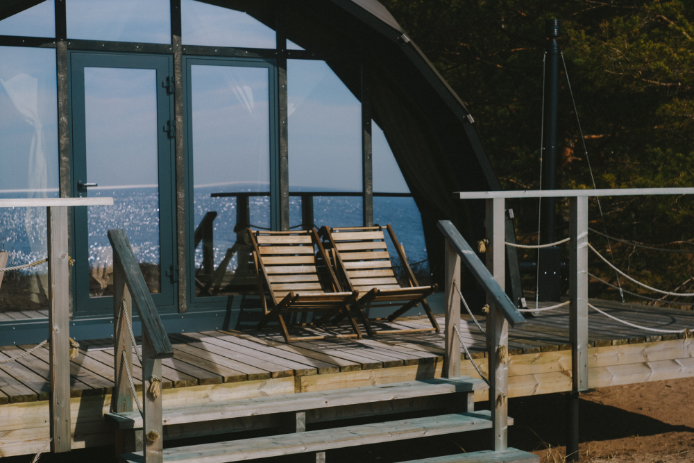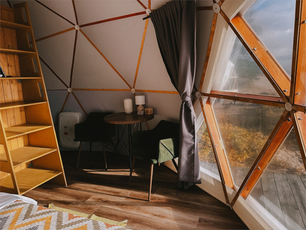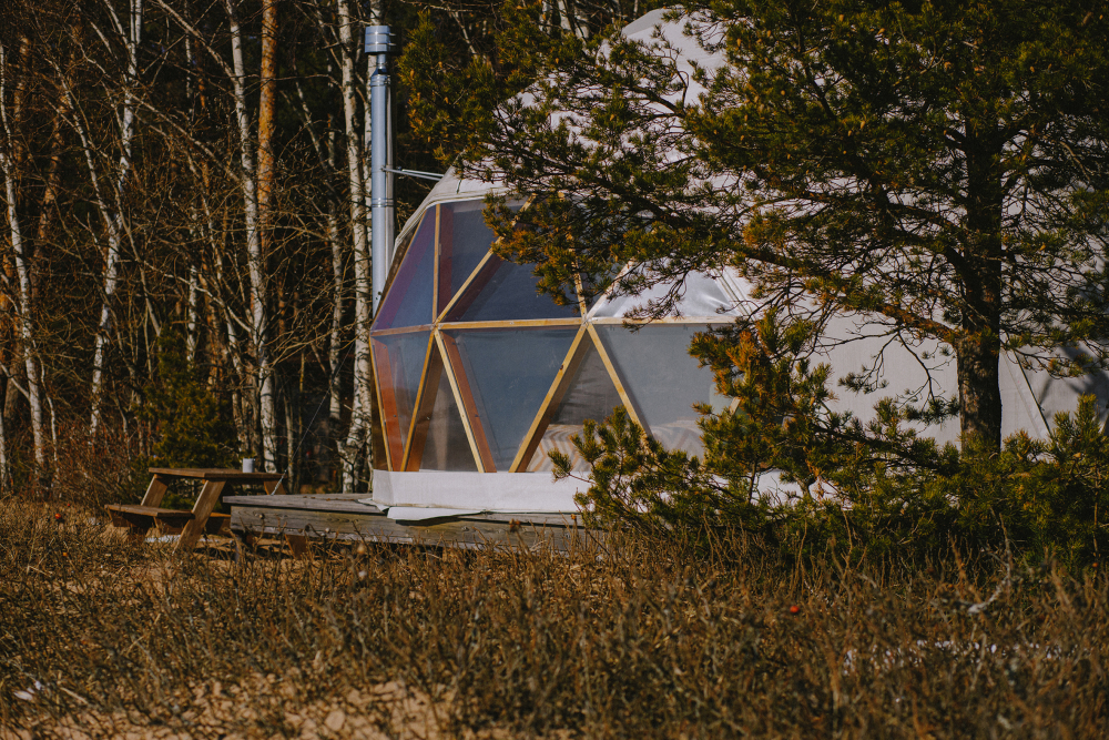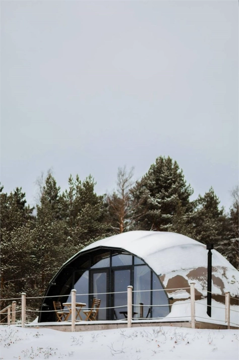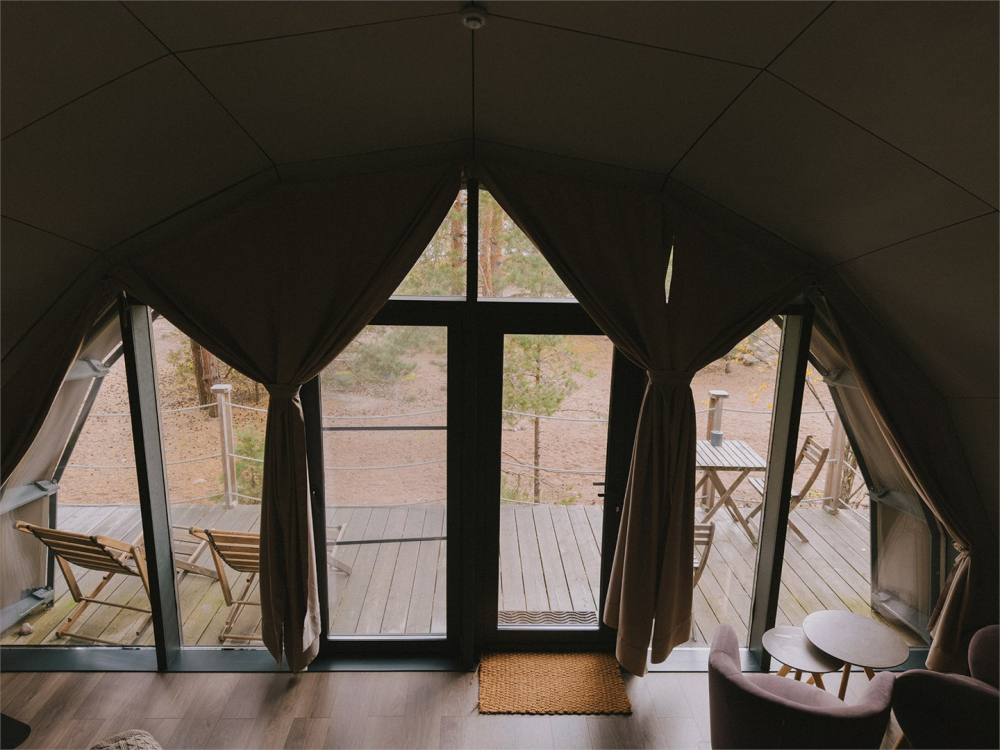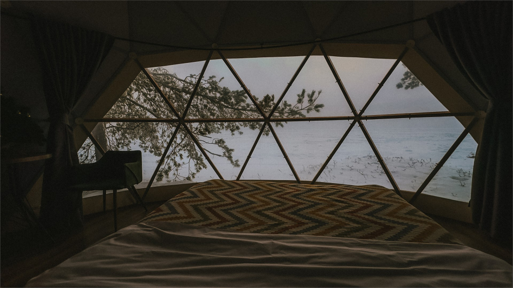 Купол с панорамным окном и видом на Финский залив. Площадь купола 28 квадратных метров, максимальное количество гостей 4 человека.