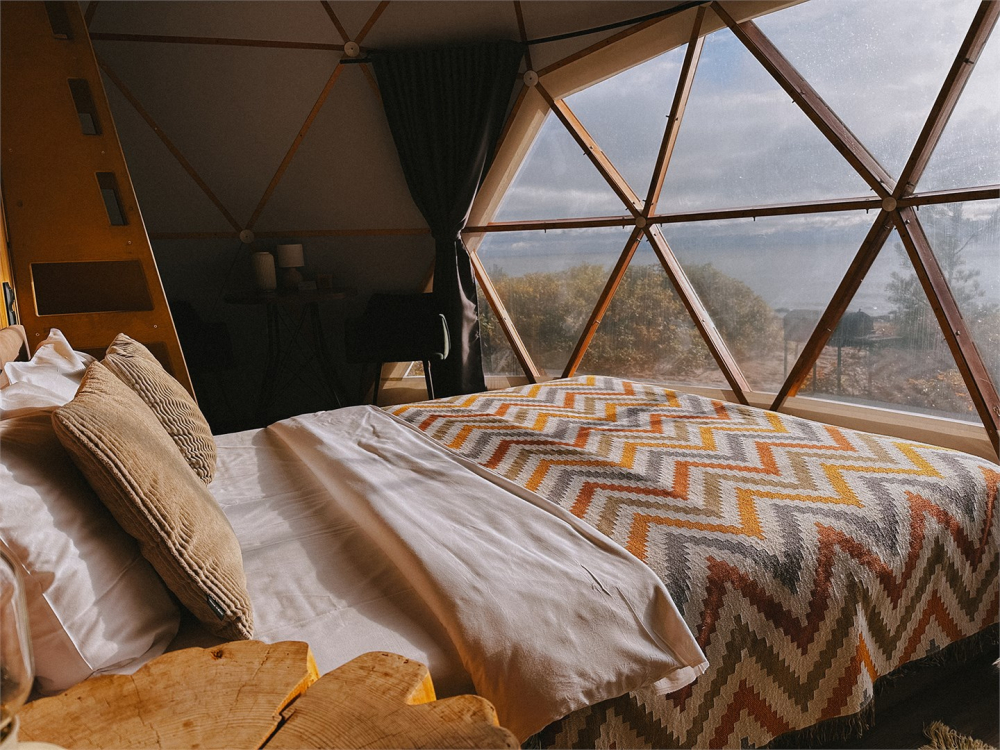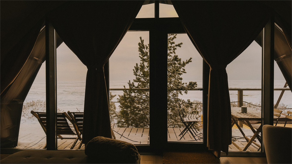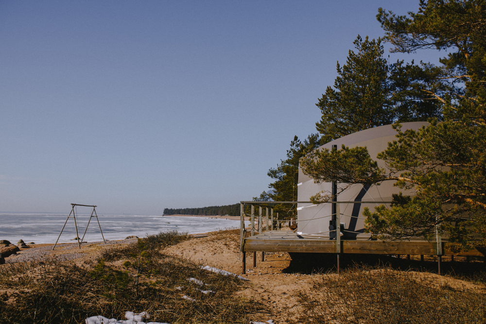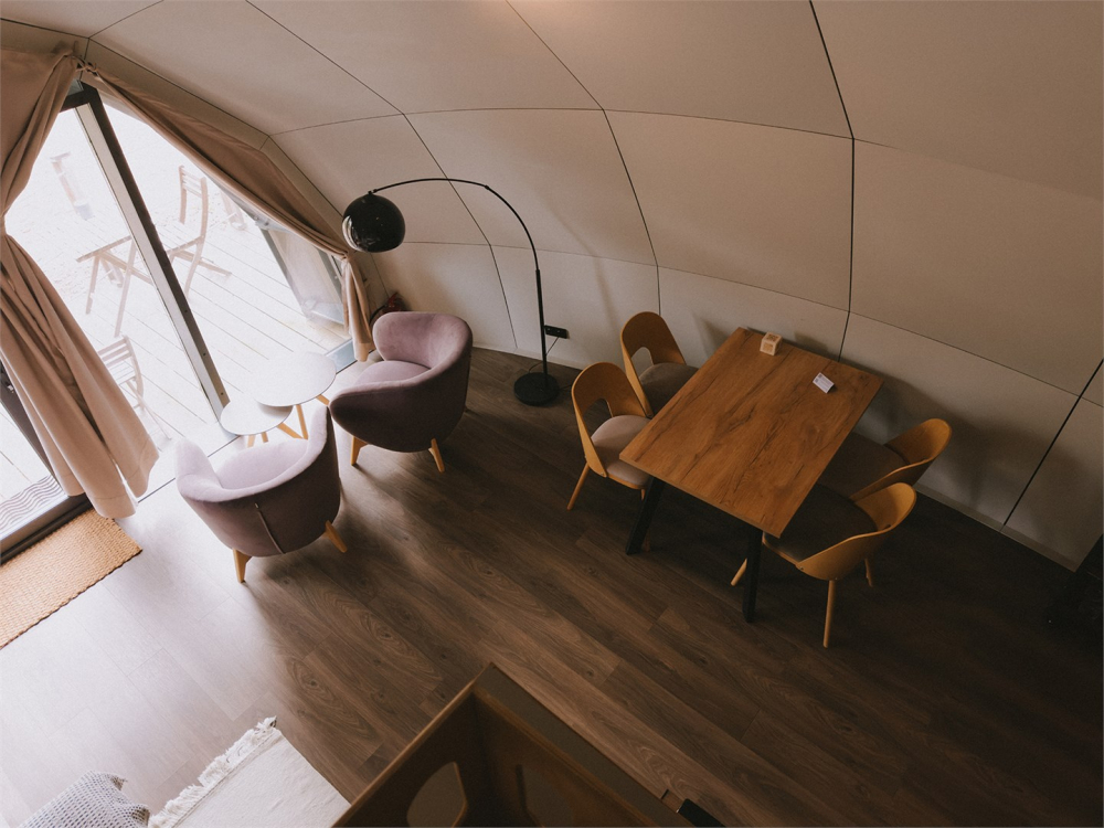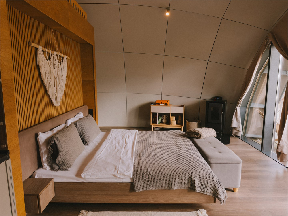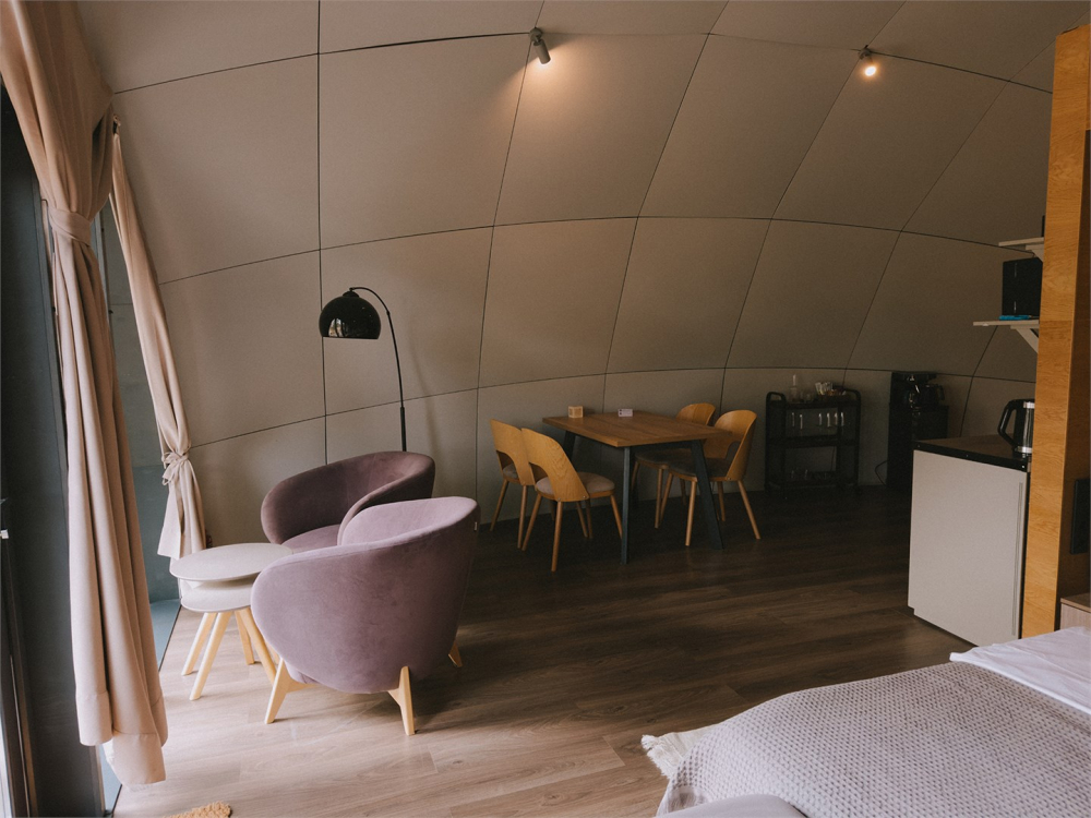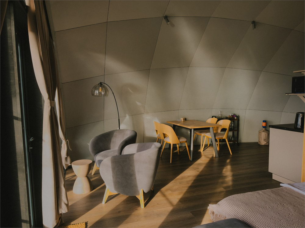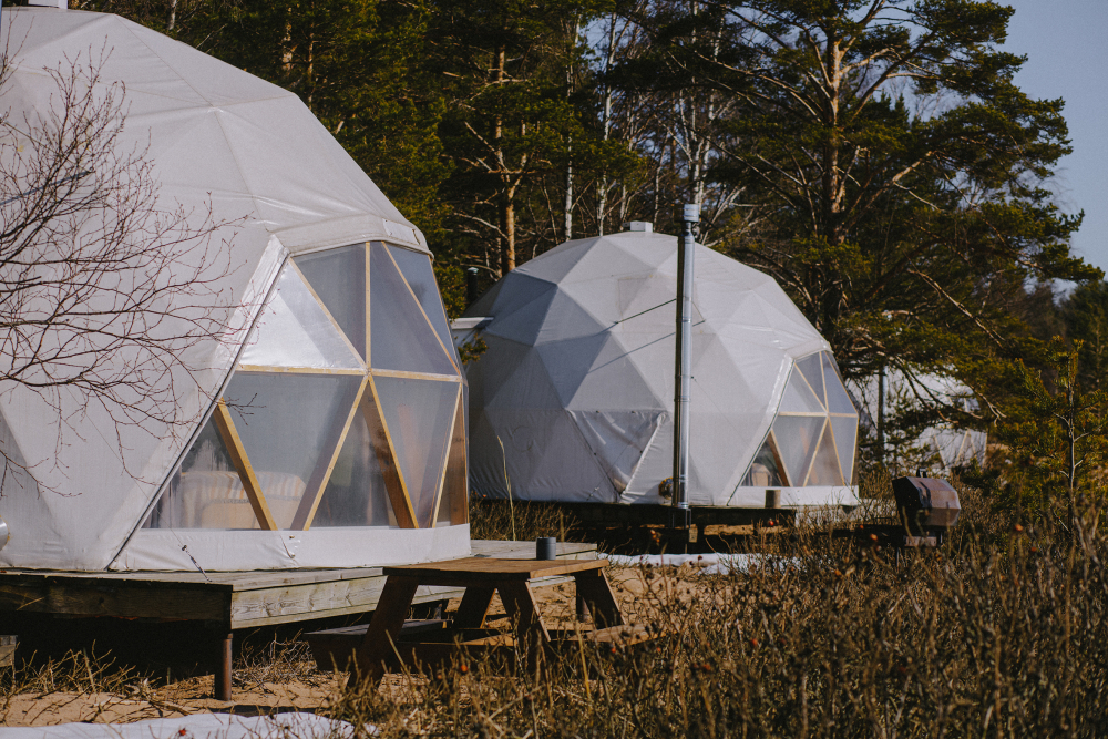Купол с панорамным окном и видом на Финский залив. Площадь купола 28 квадратных метров, максимальное количество гостей 4 человека.