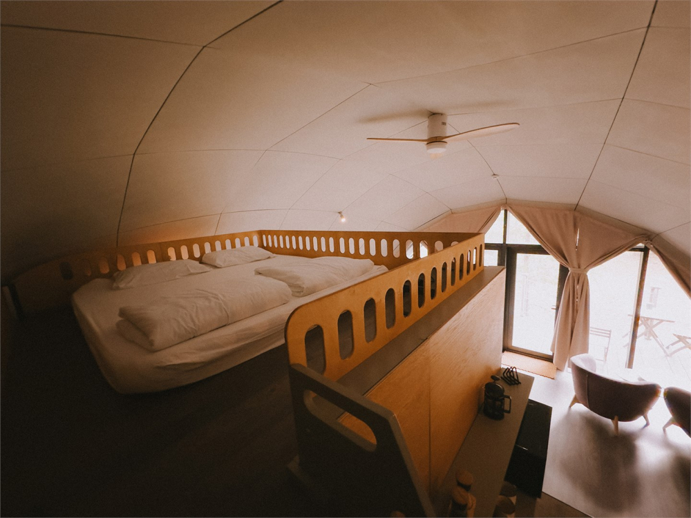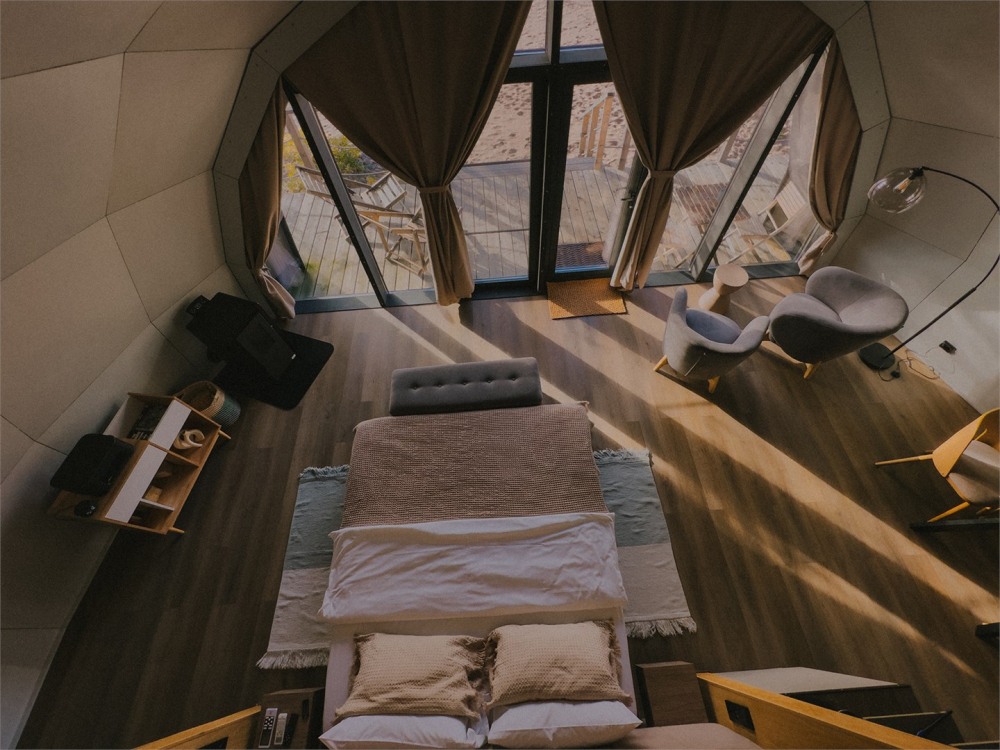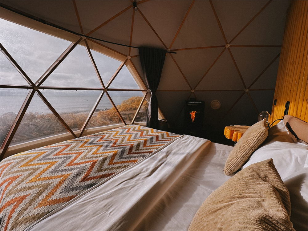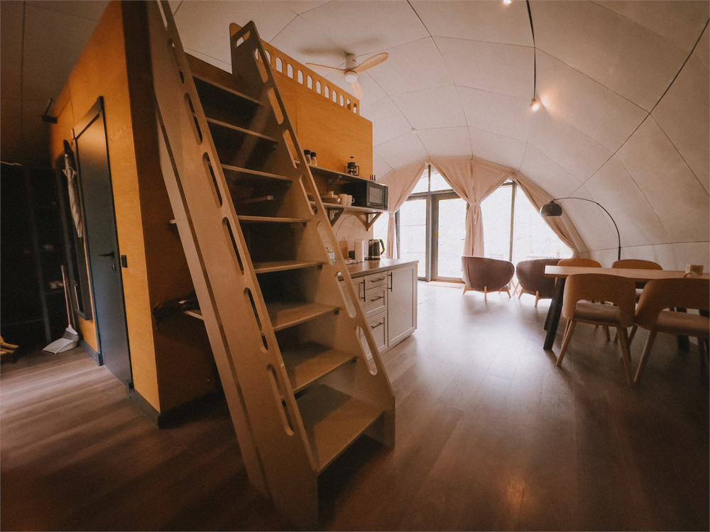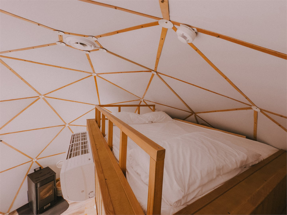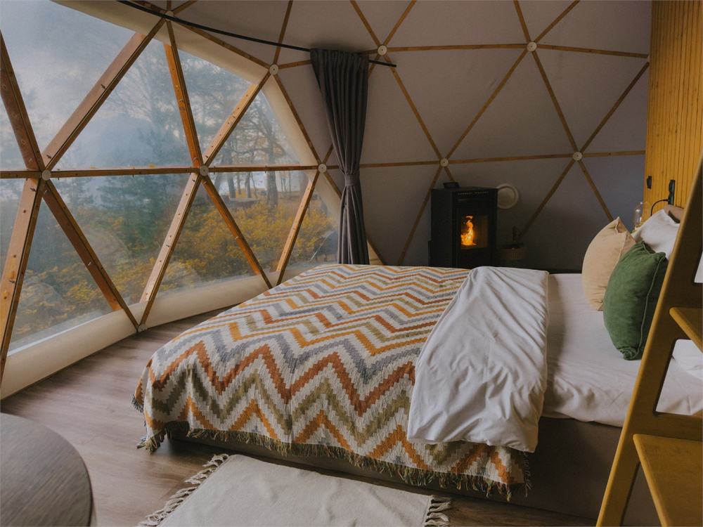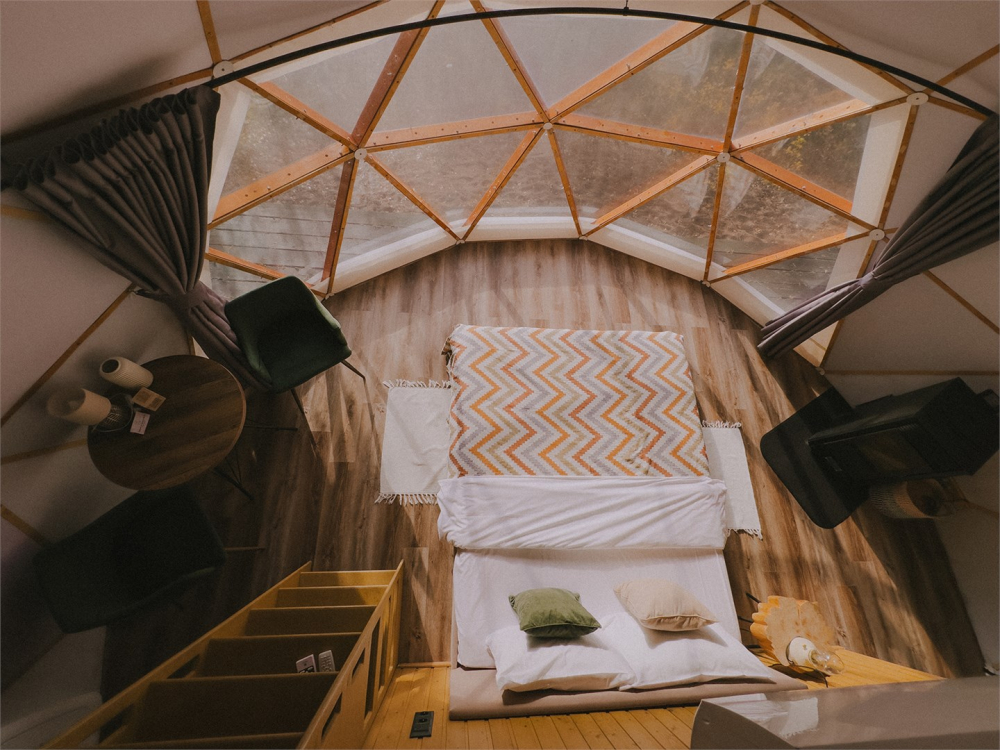Купол с панорамным окном и видом на Финский залив. Площадь купола 28 квадратных метров, максимальное количество гостей 4 человека.