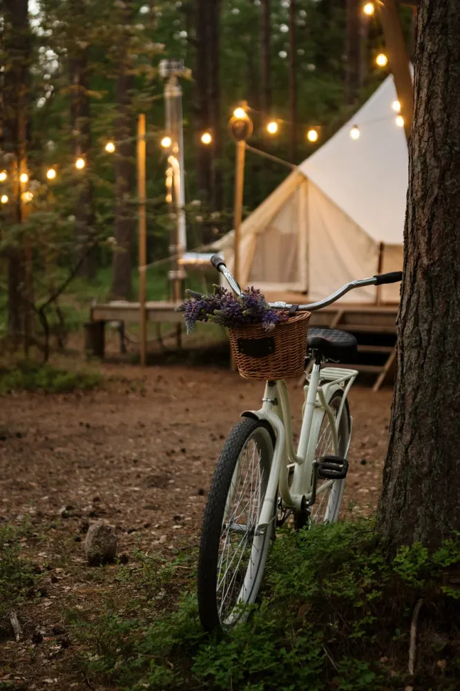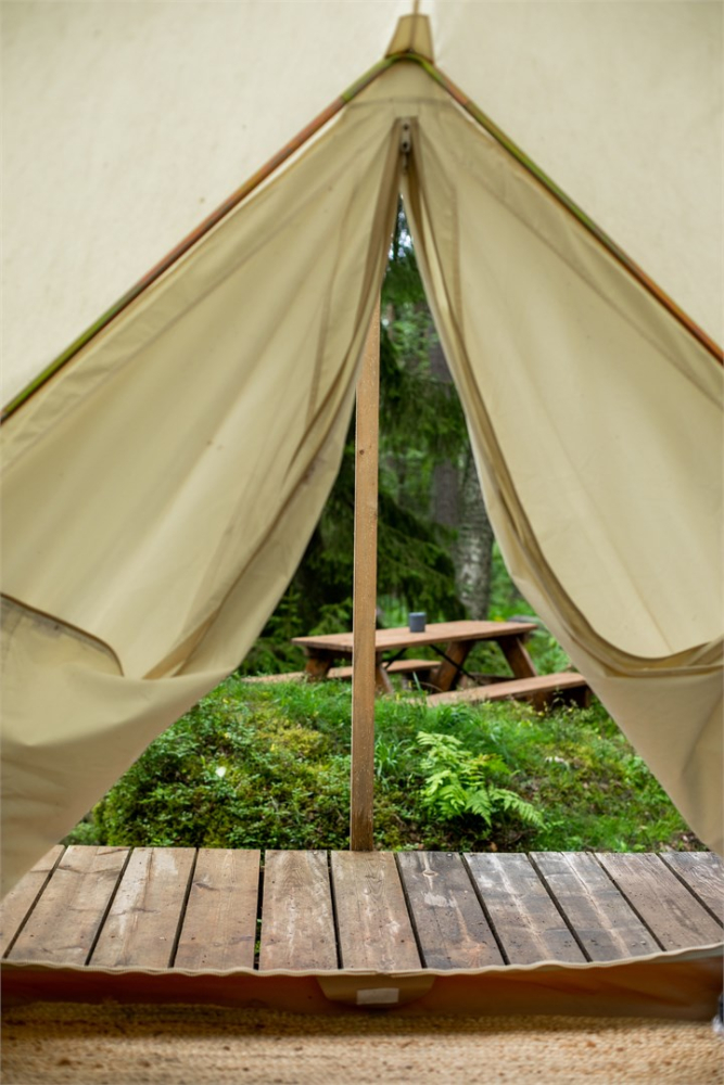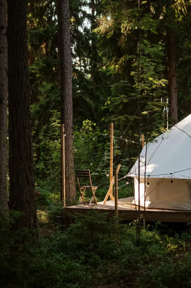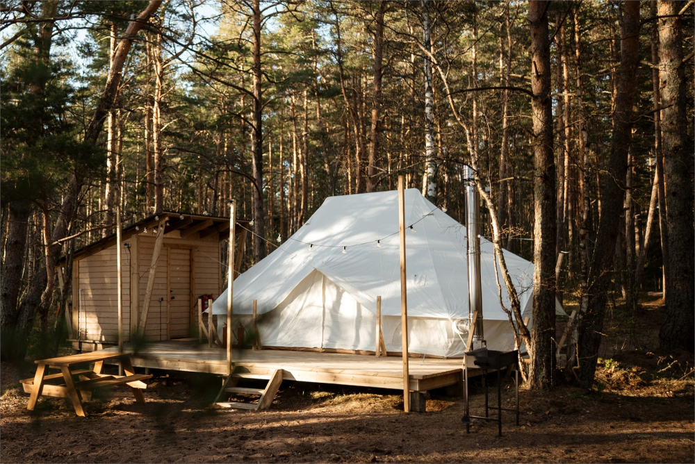 Шатёр площадью 26 м2 с индивидуальным душем, туалетом и умывальником, расположенный в сосновом лесу.
