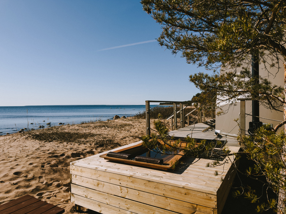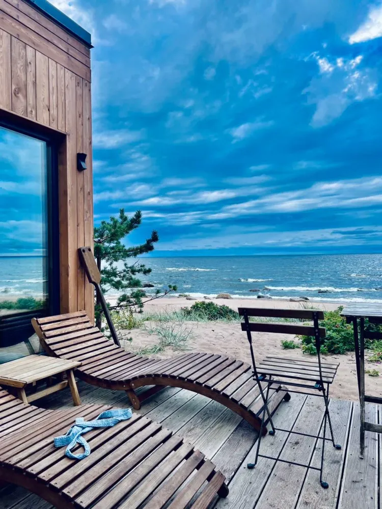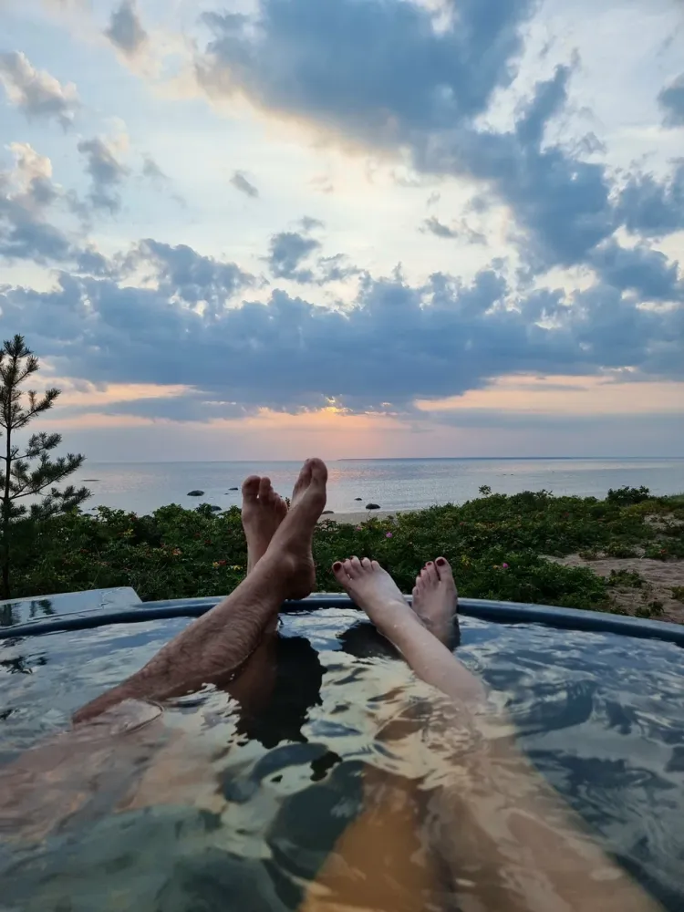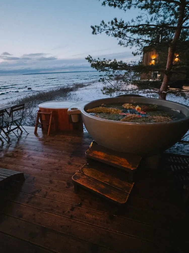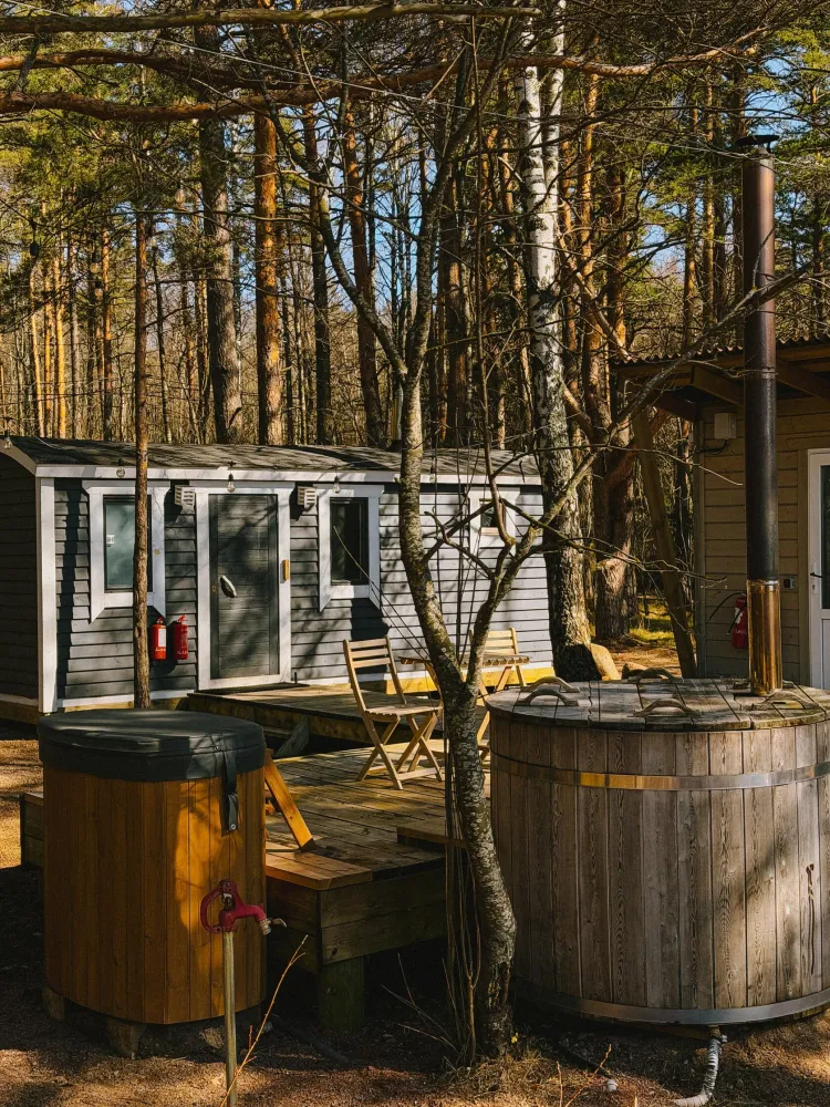 У нас 3 бани и у каждой находится купель. Две из них с панорамными окнами с видом на Финский залив расположены на границе с пляжем и еще одна баня находится в сосновом лесу.
