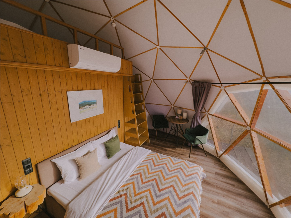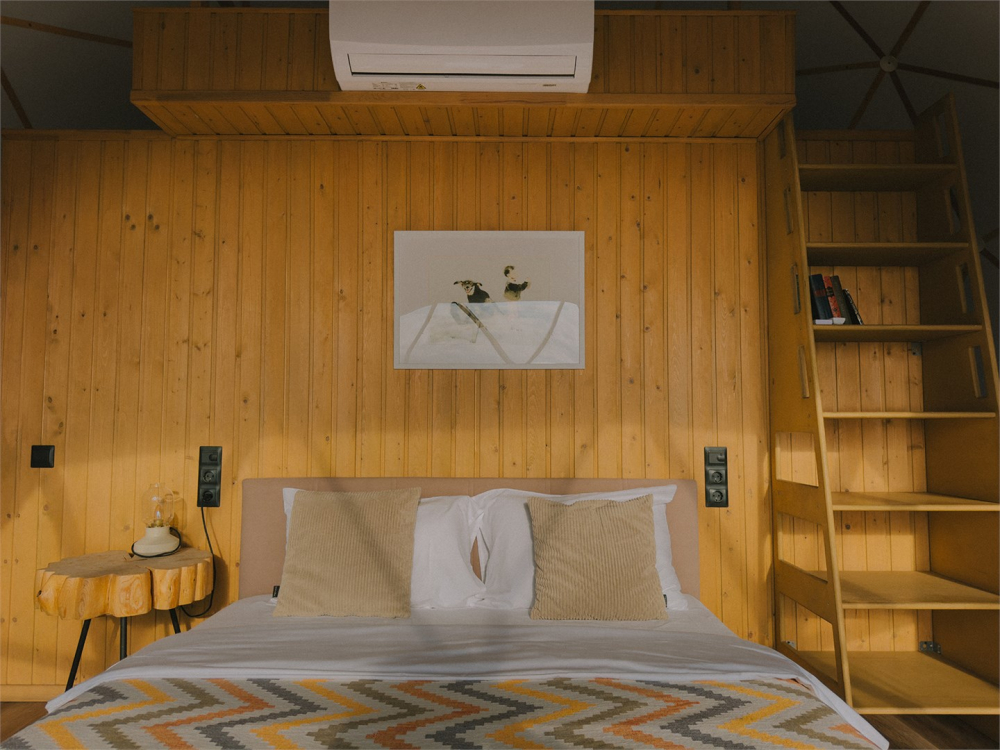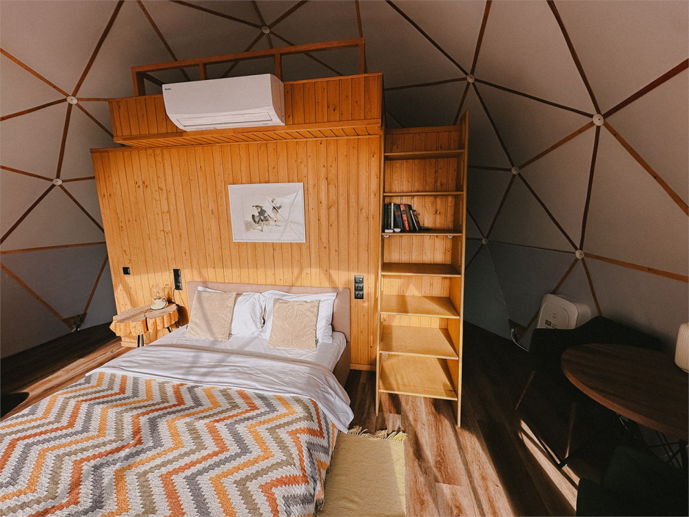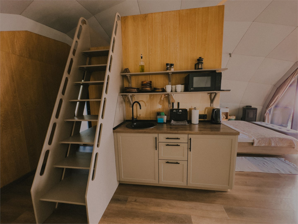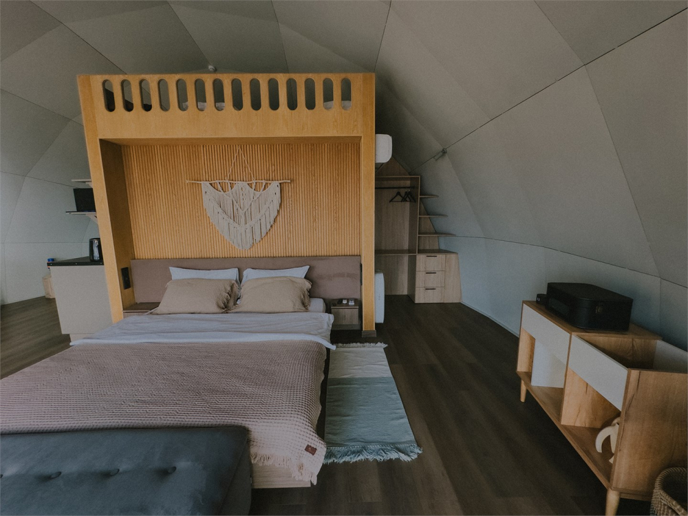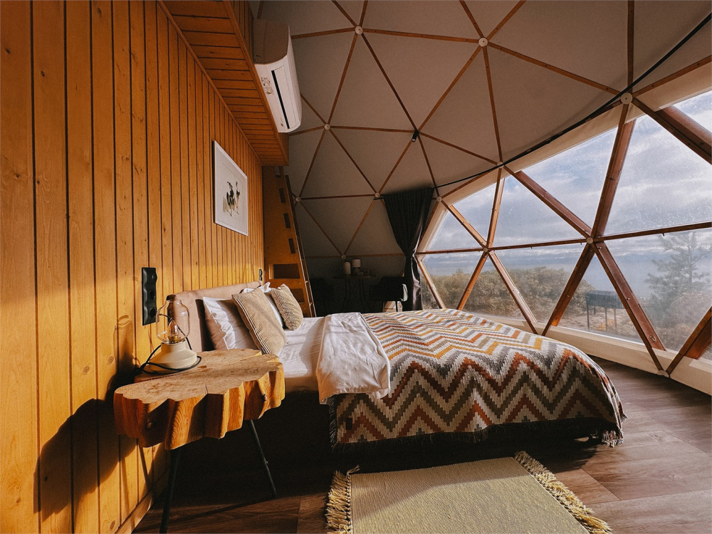 В доме панорамное остекление с видом на залив, собственная терраса и мангальная зона. В куполе есть современный санузел, большая двуспальная кровать и двуспальная кровать на втором уровне, кухня с холодильником и микроволновой печью, чайная/кофейная станции, зона отдыха, виниловый проигрыватель, станция Алиса и бесплатный мини-бар . Дистанционное управление климат-контролем, пилетной печью и кондиционером.