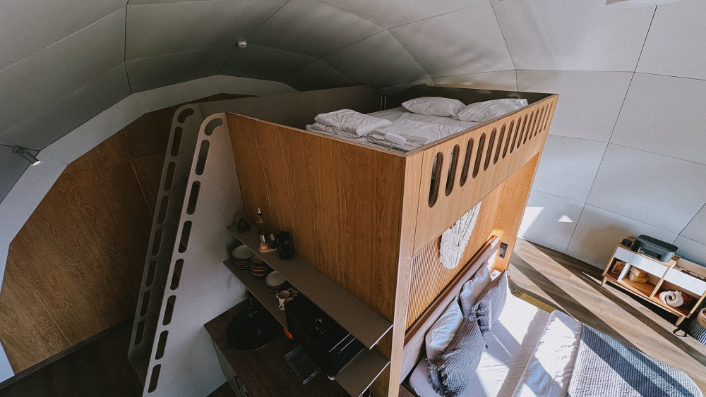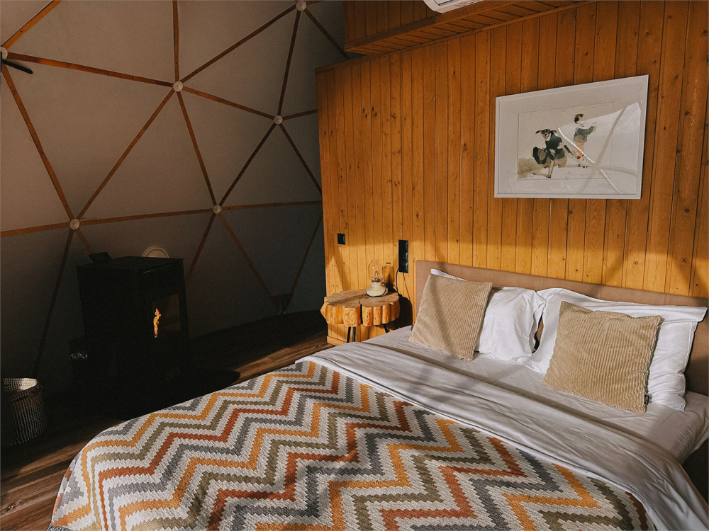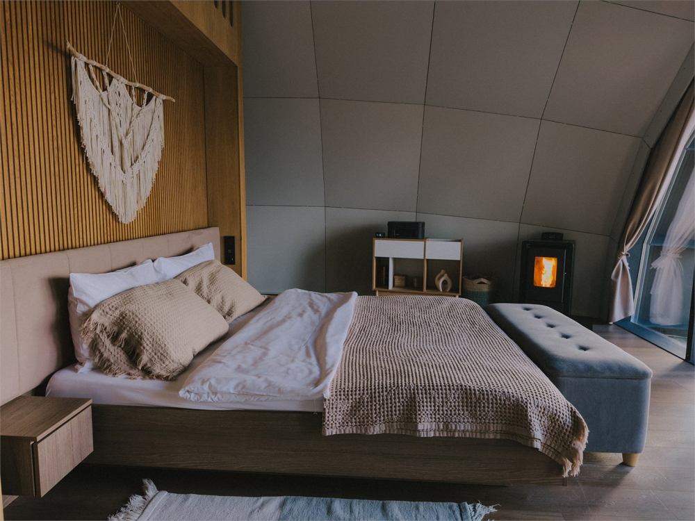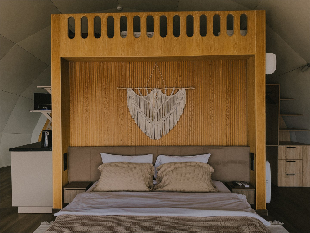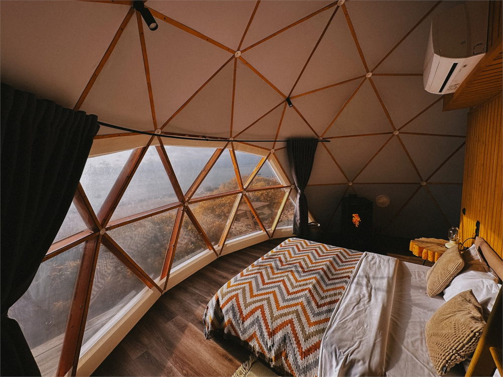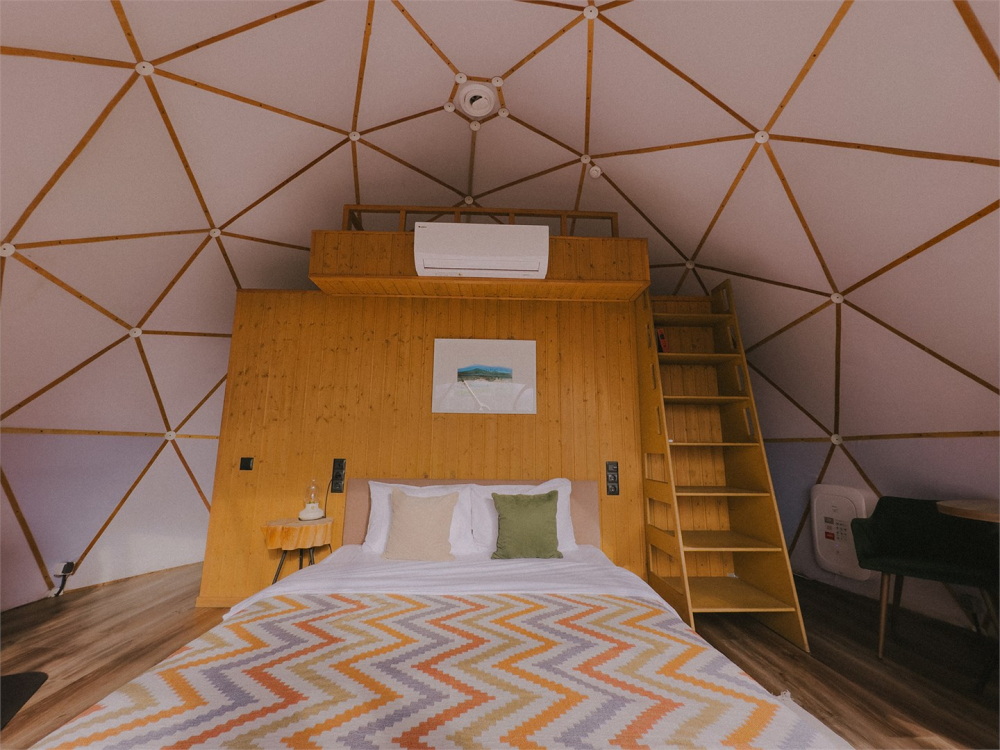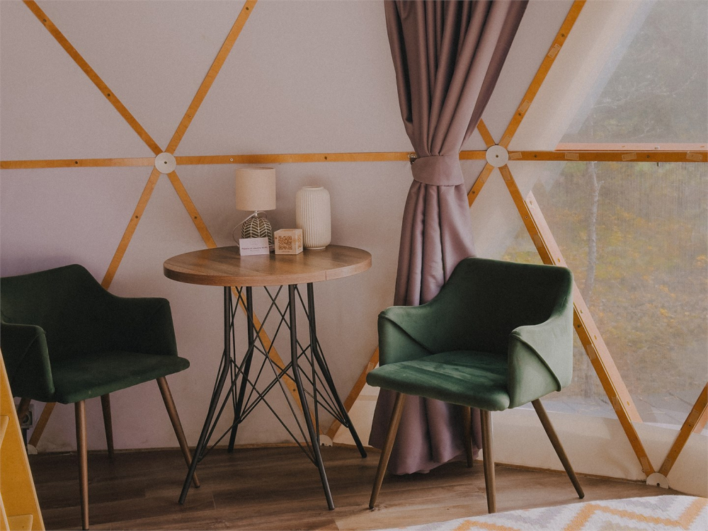В доме панорамное остекление с видом на залив, собственная терраса и мангальная зона. В куполе есть современный санузел, большая двуспальная кровать и двуспальная кровать на втором уровне, кухня с холодильником и микроволновой печью, чайная/кофейная станции, зона отдыха, виниловый проигрыватель, станция Алиса и бесплатный мини-бар . Дистанционное управление климат-контролем, пилетной печью и кондиционером.