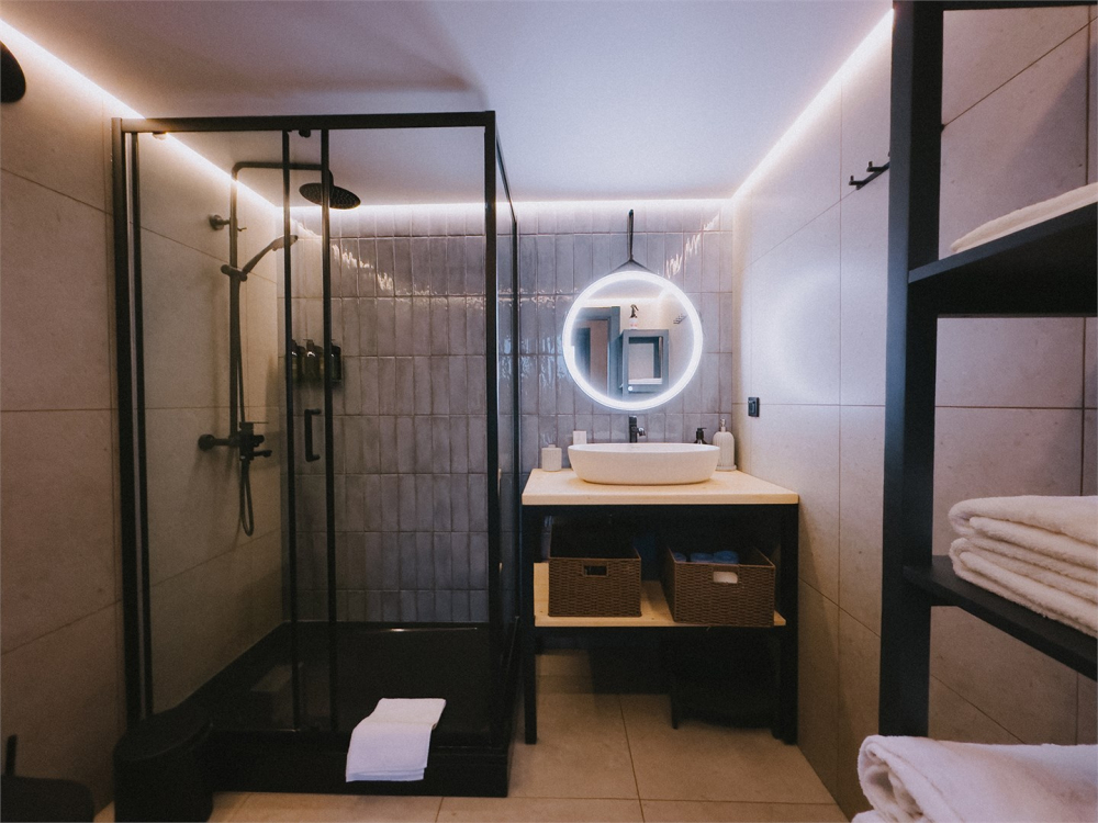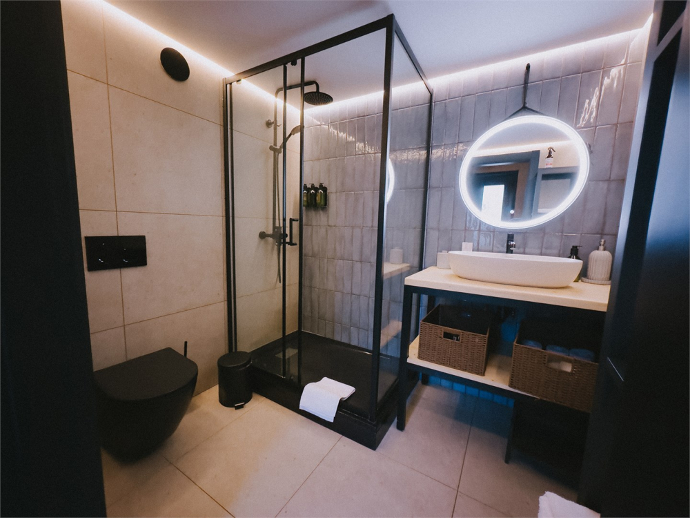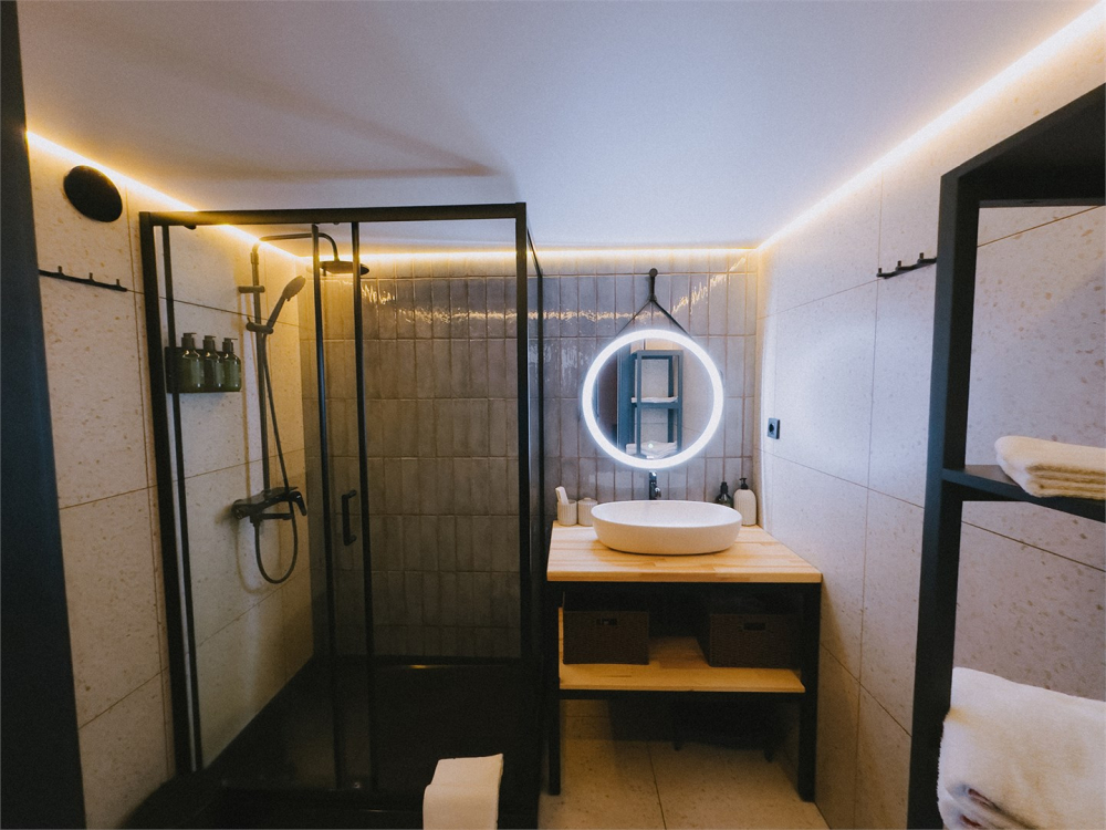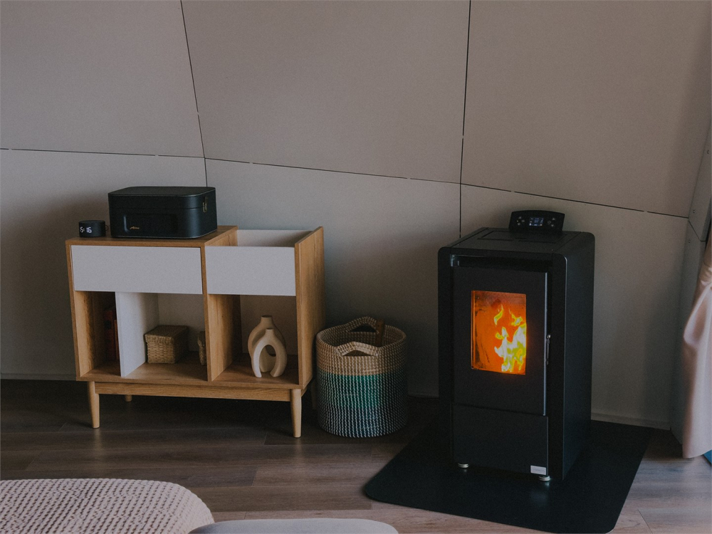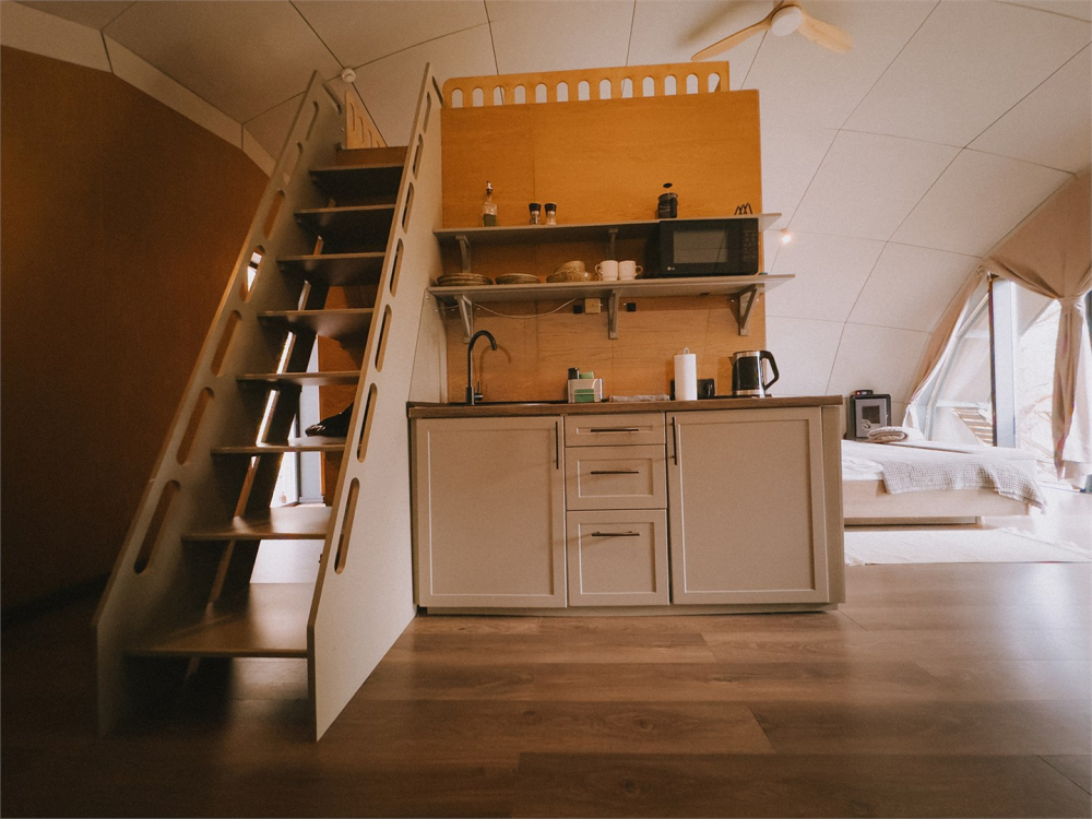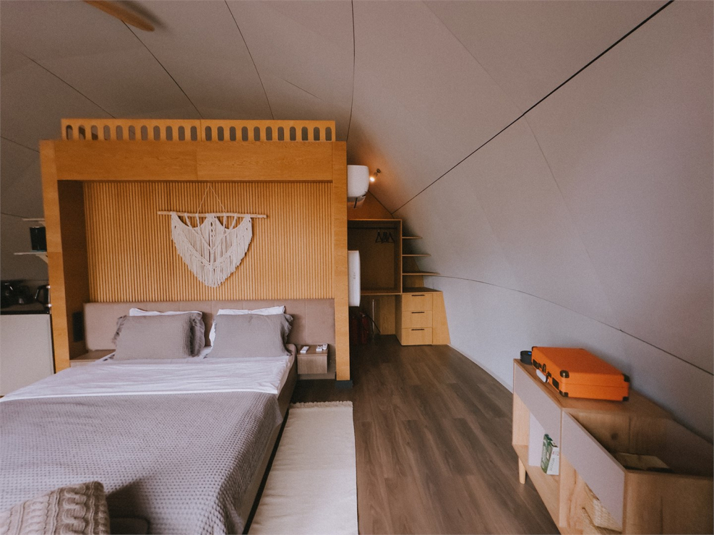 В доме панорамное остекление с видом на залив, собственная терраса и мангальная зона. В куполе есть современный санузел, большая двуспальная кровать и двуспальная кровать на втором уровне, кухня с холодильником и микроволновой печью, чайная/кофейная станции, зона отдыха, виниловый проигрыватель, станция Алиса и бесплатный мини-бар . Дистанционное управление климат-контролем, пилетной печью и кондиционером.