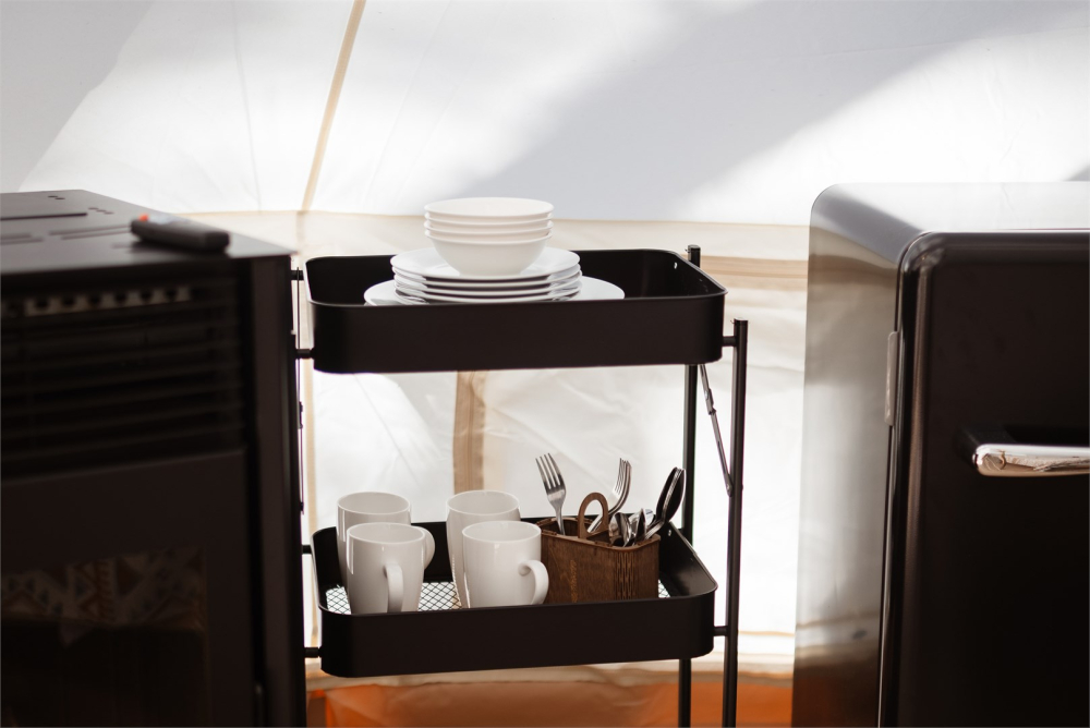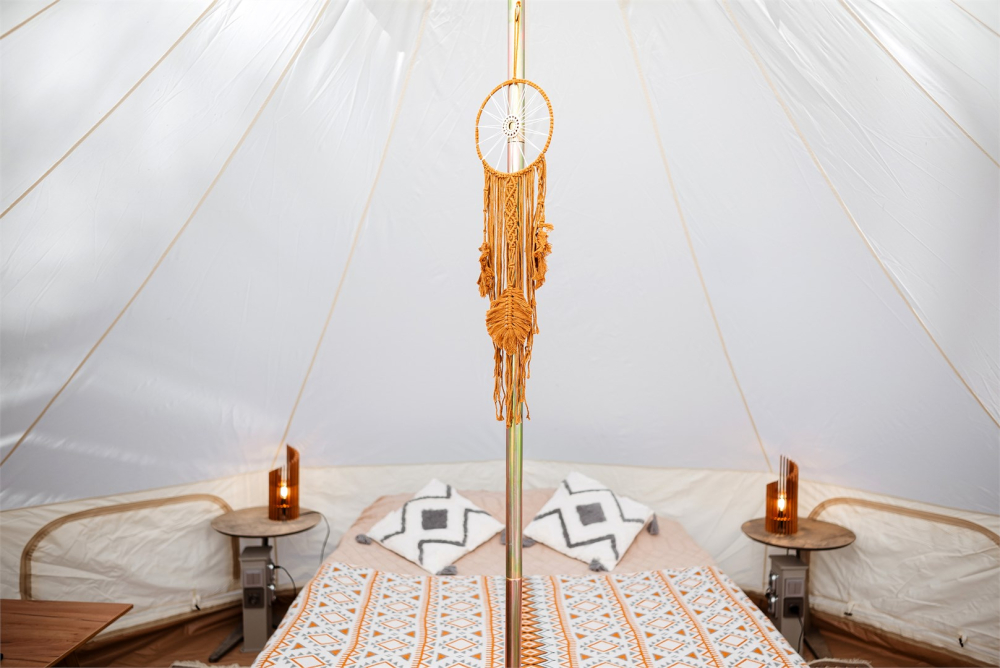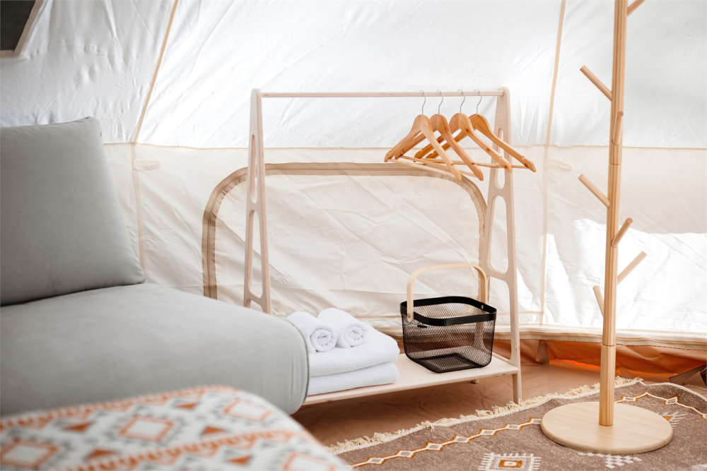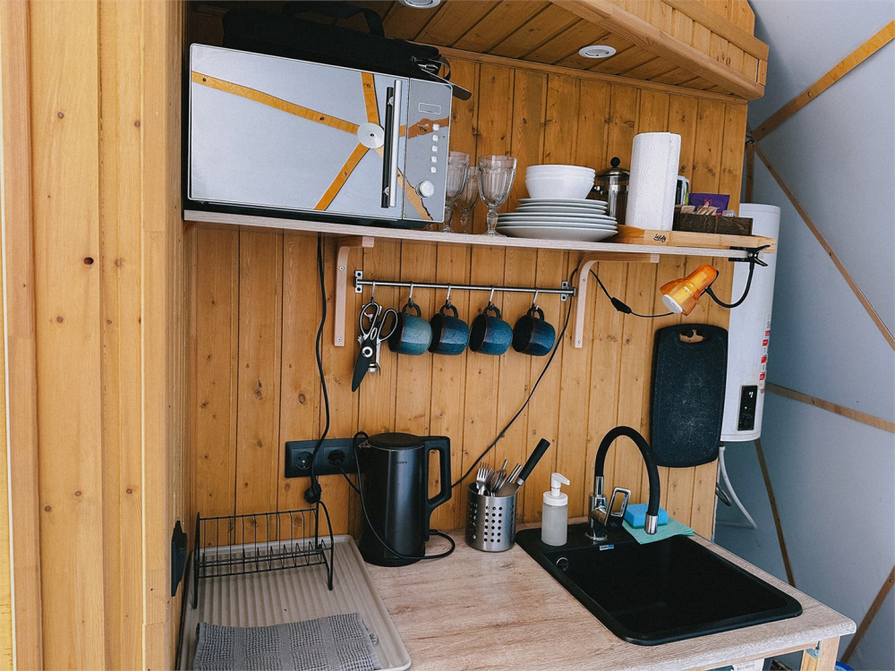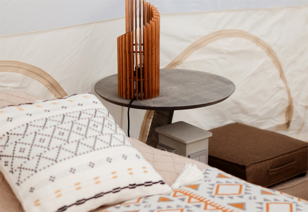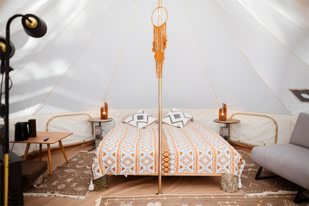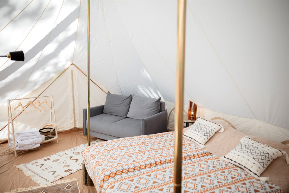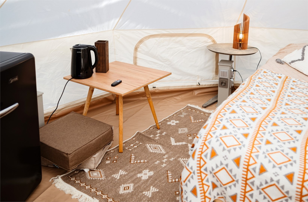 В шатре: большая двуспальная кровать 160х200 см и раскладной диван для двоих гостей, печь со стеклом, постельное бельё и полотенца.