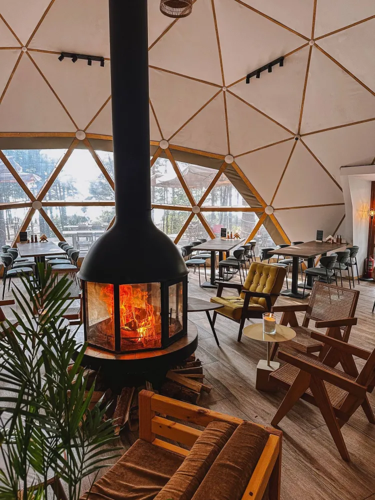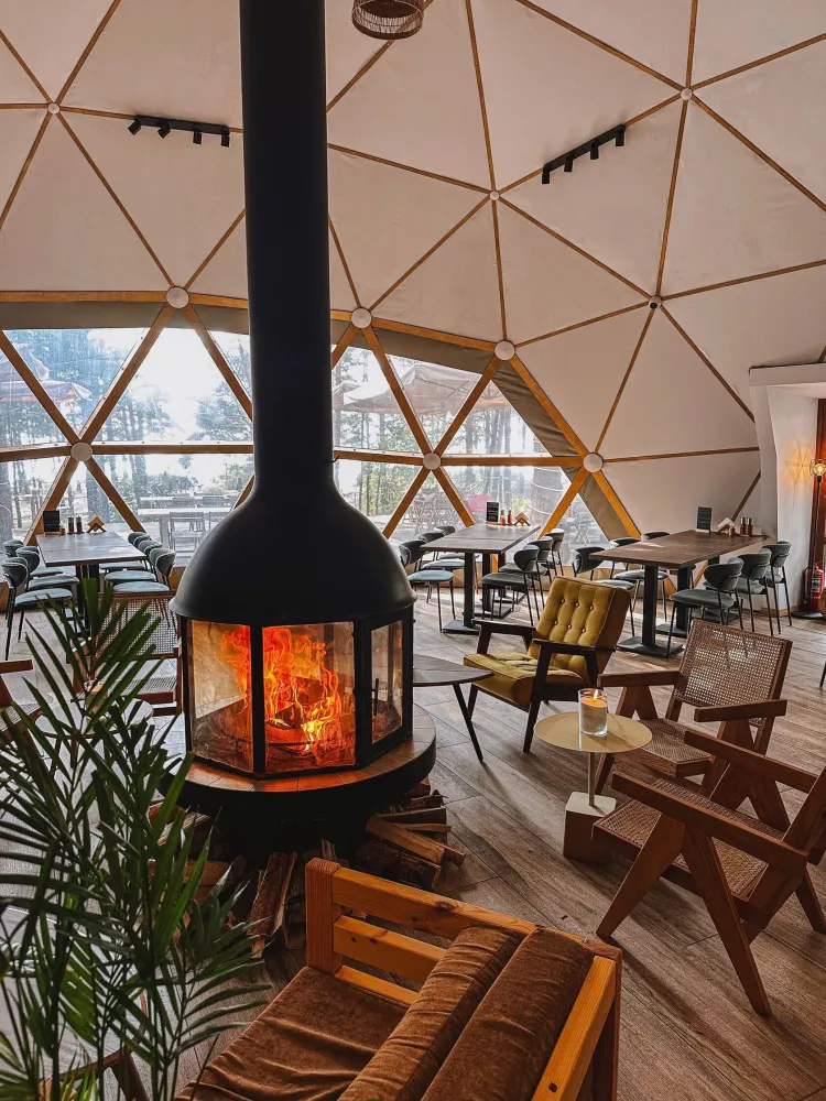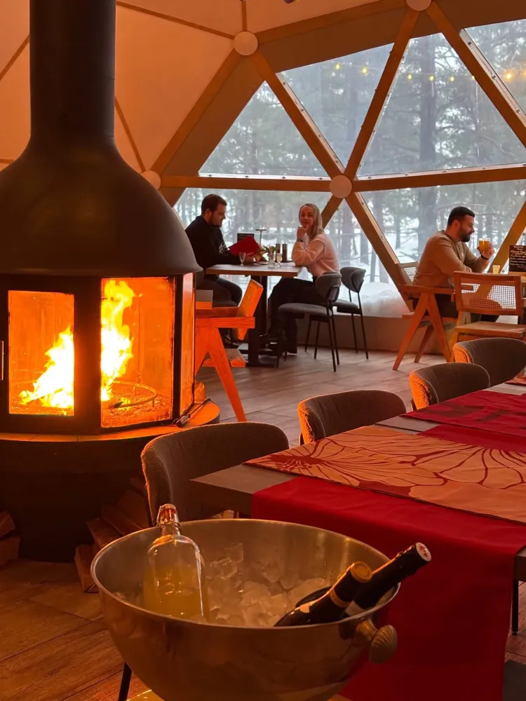 На территории работает собственный ресторан с панорамными окнами и камином. Это место для неспешных завтраков, ужинов при свечах и теплых вечеров в любое время года.