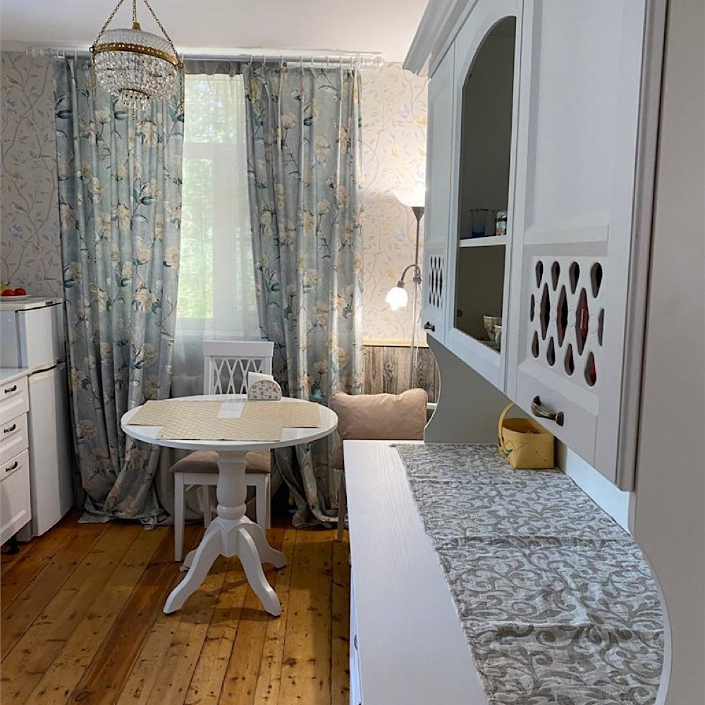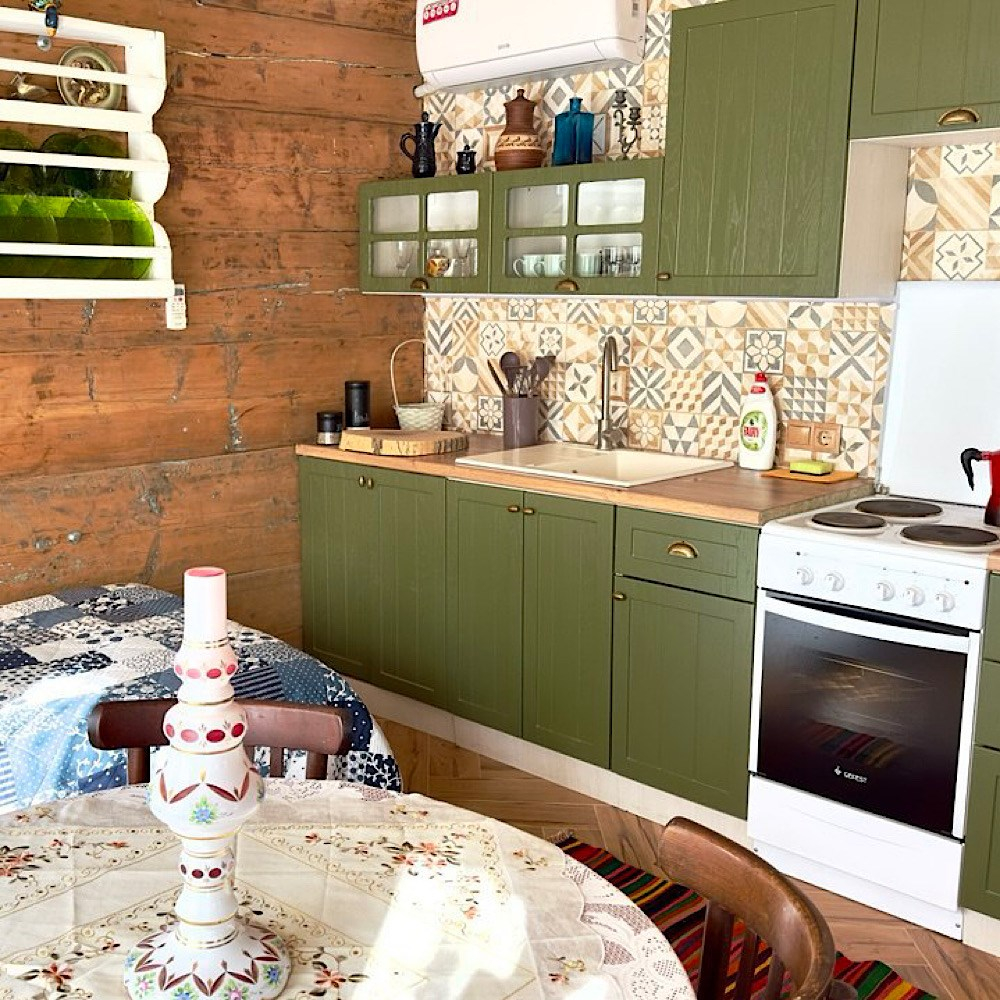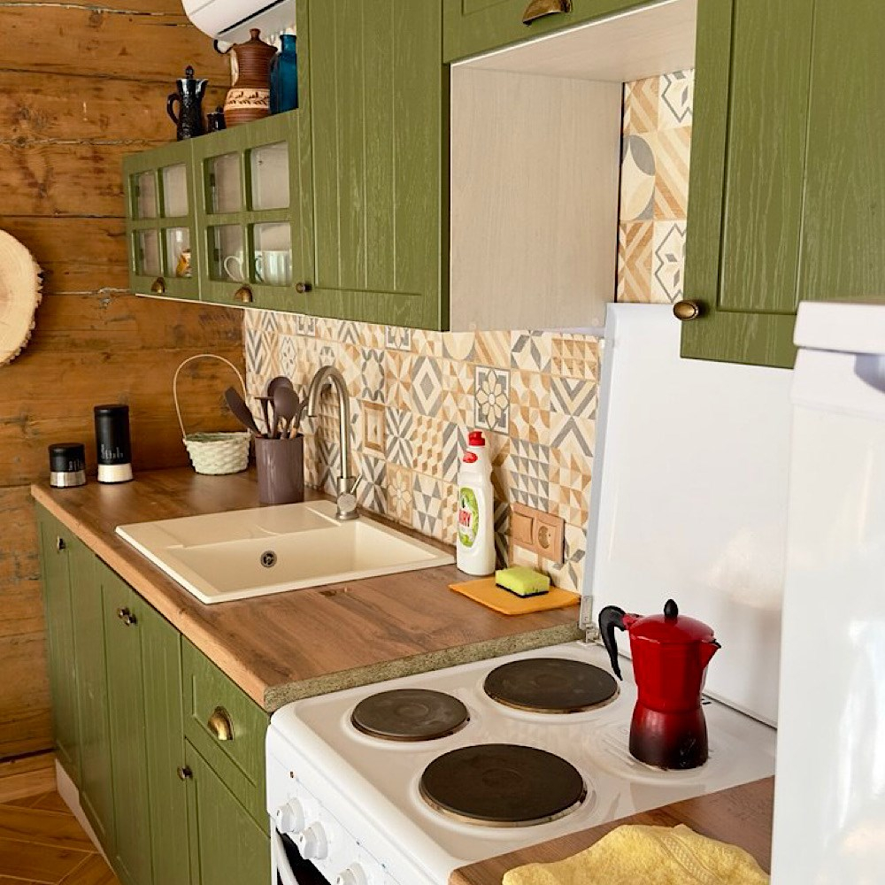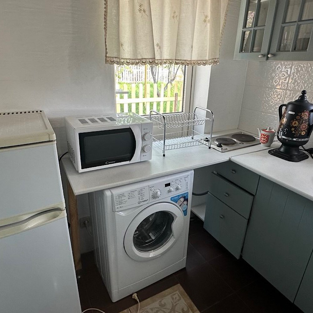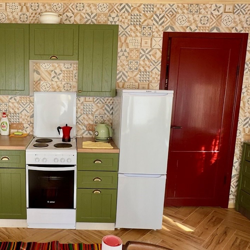 - Кухня с электрической плитой, холодильником, столом и стульями