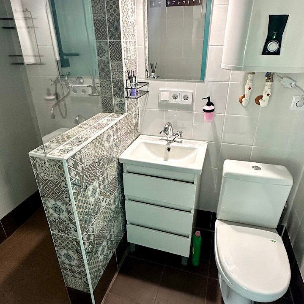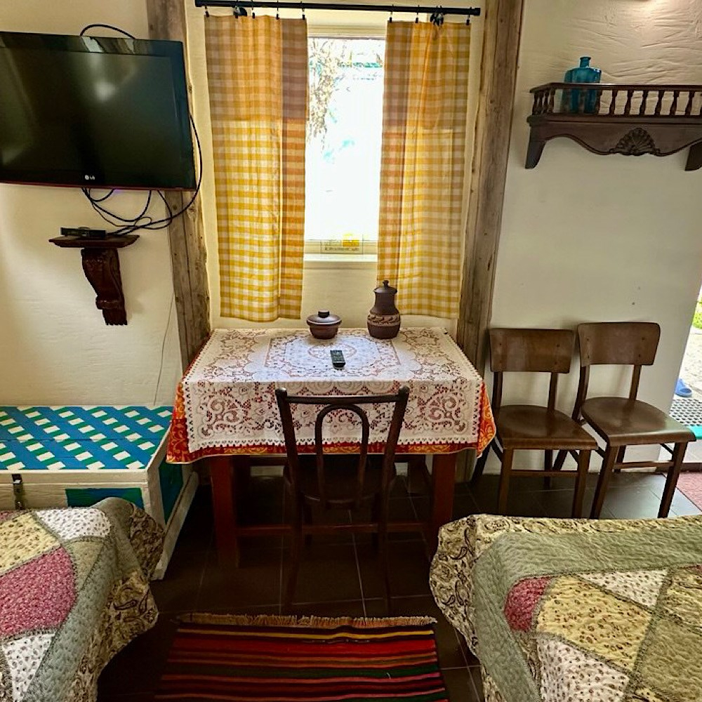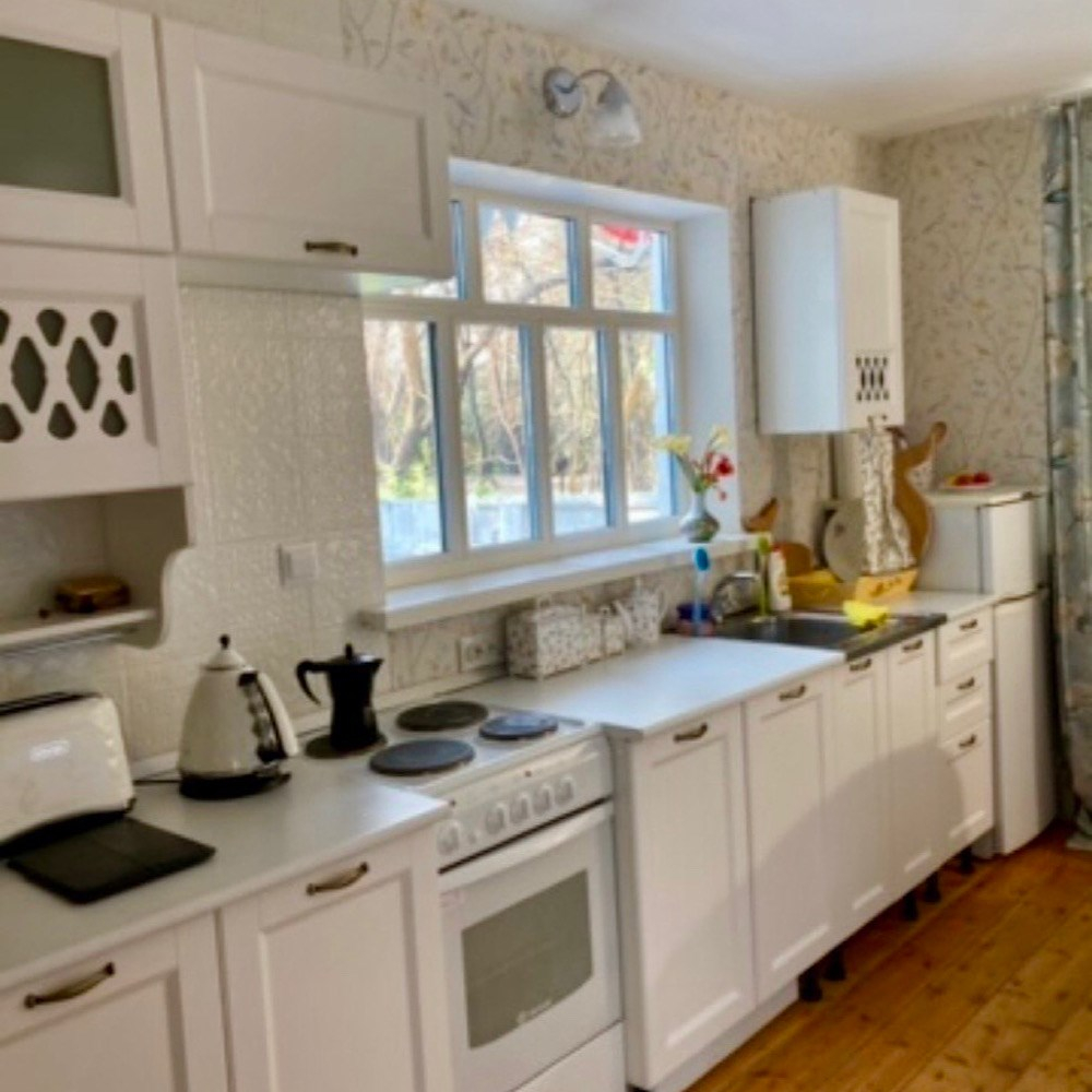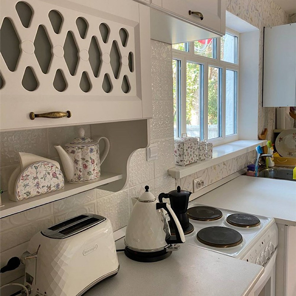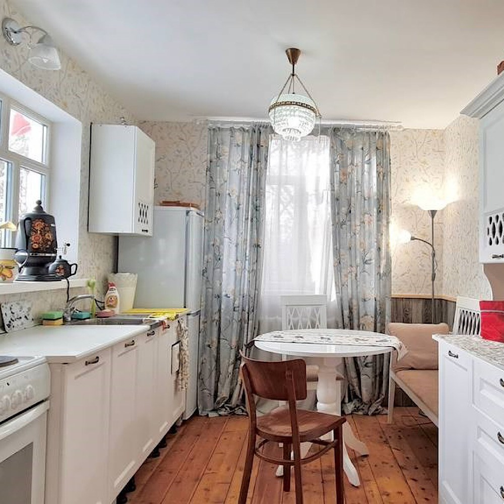 - Кухня с электрической плитой, холодильником, столом и стульями