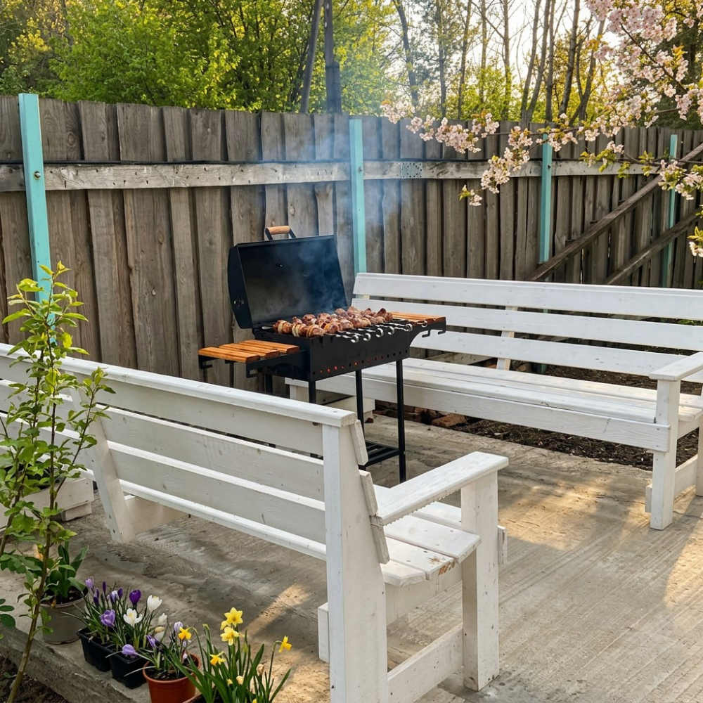 мангальная зона (решетки, шампуры, уголь и розжиг — с собой)